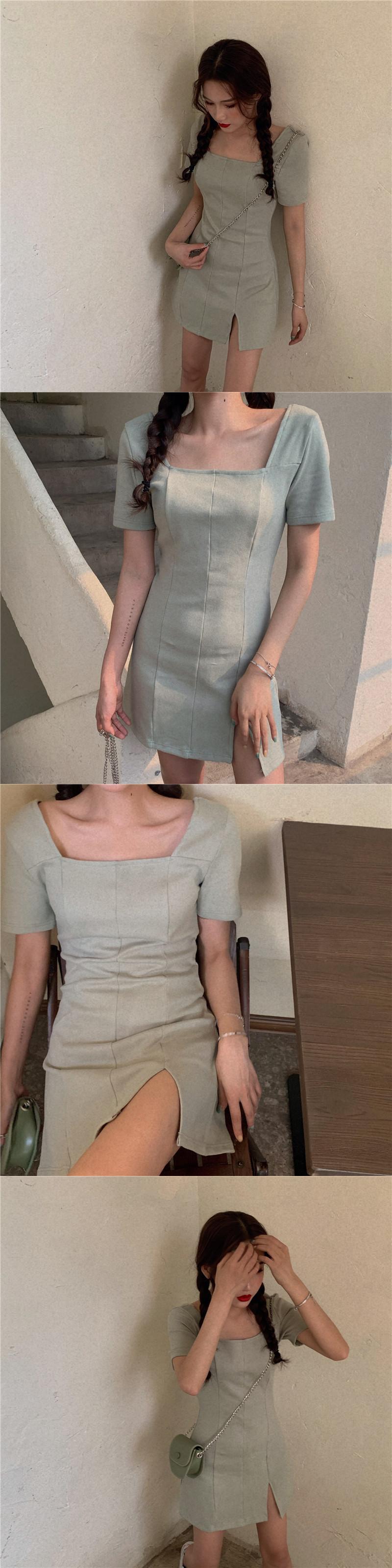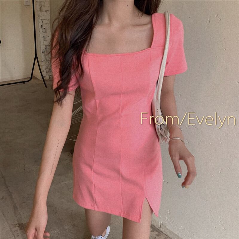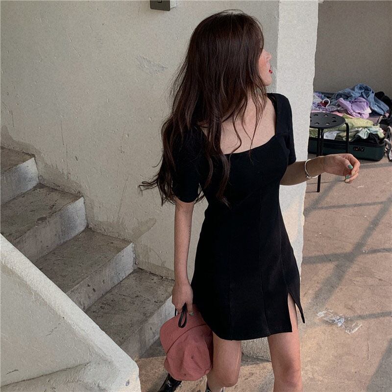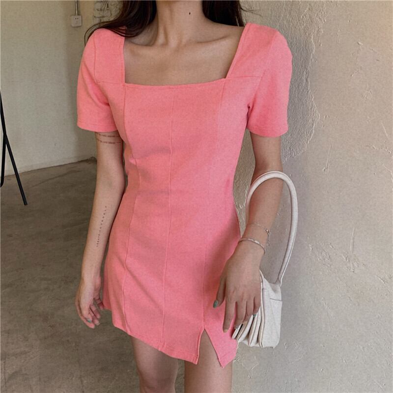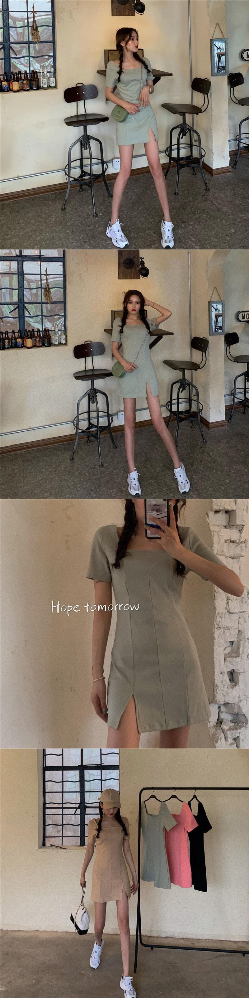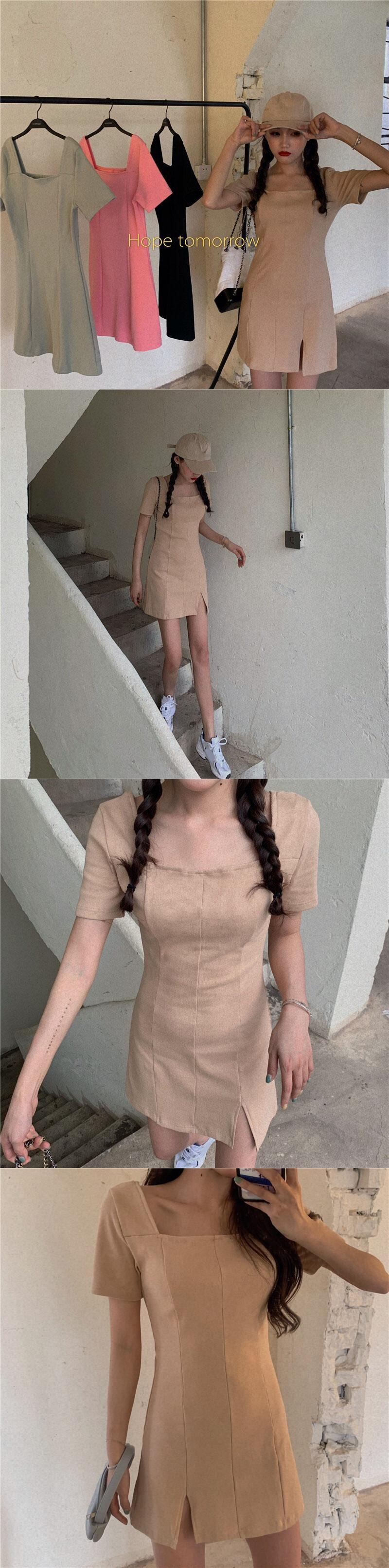 2020年秋冬新ウエスト薄気質スプリットAラインショートスカートレトロ半袖スクエアカラーワンピース女性 YY-ファッション59606457741