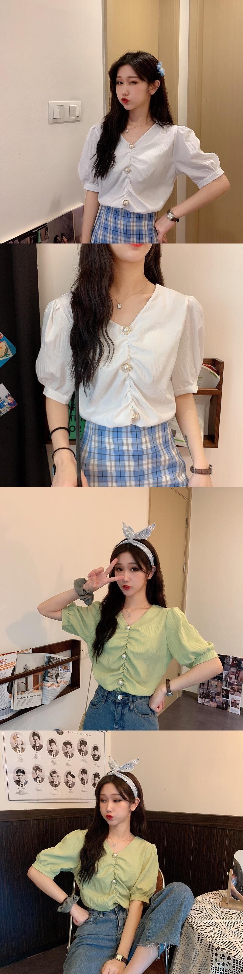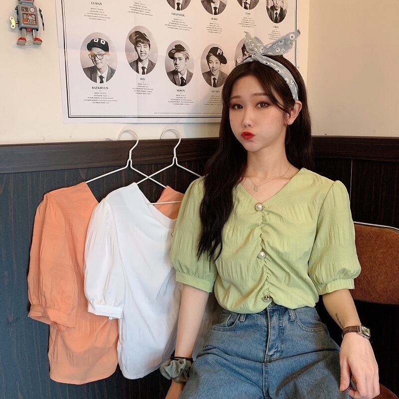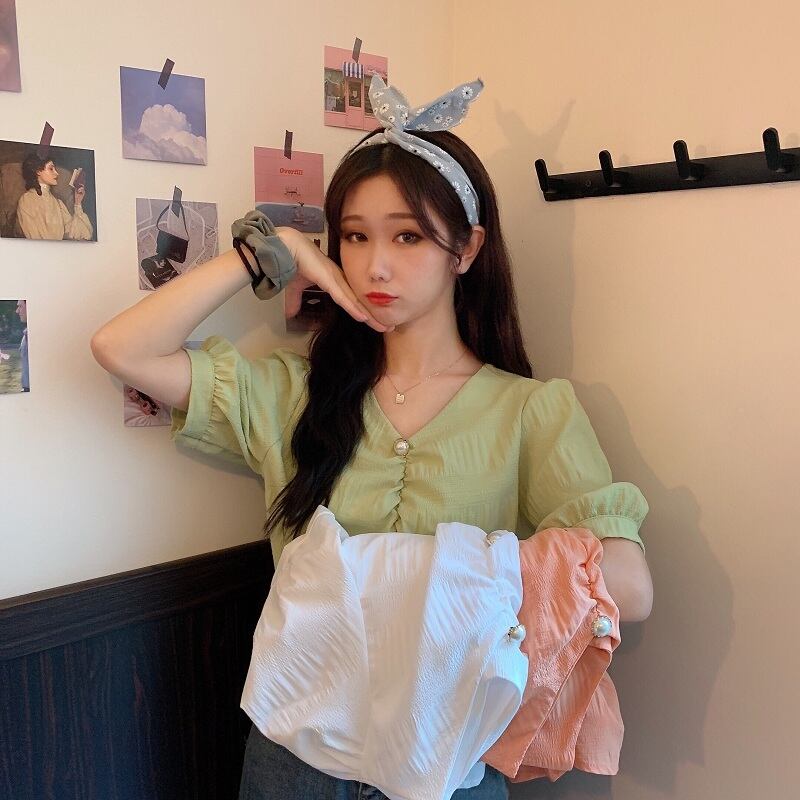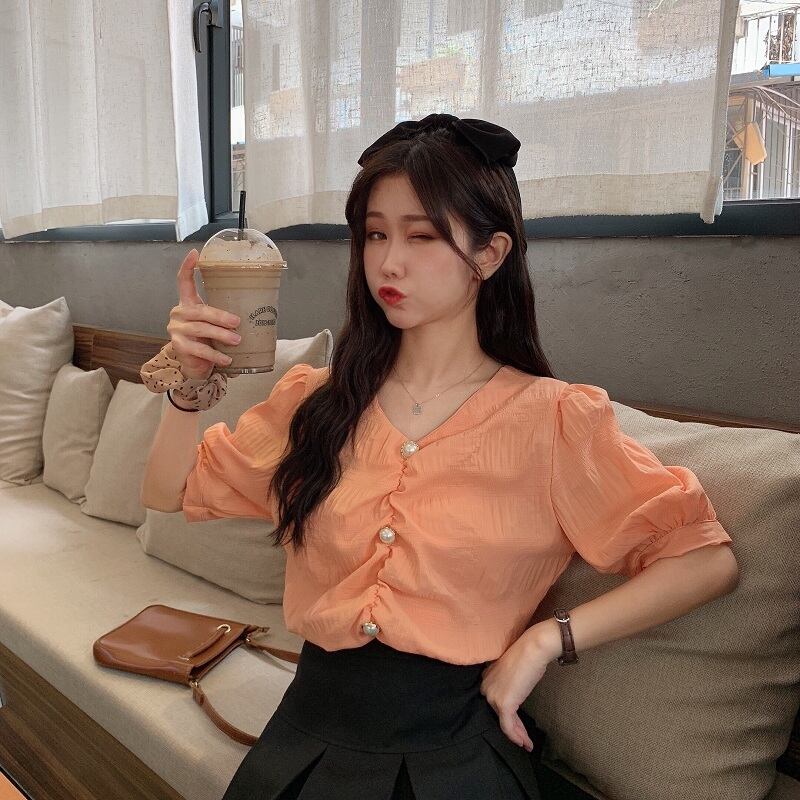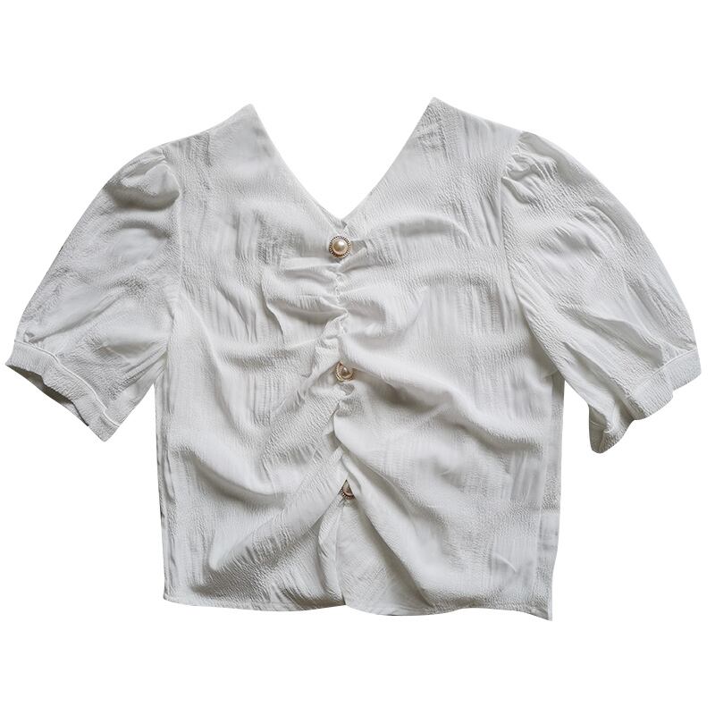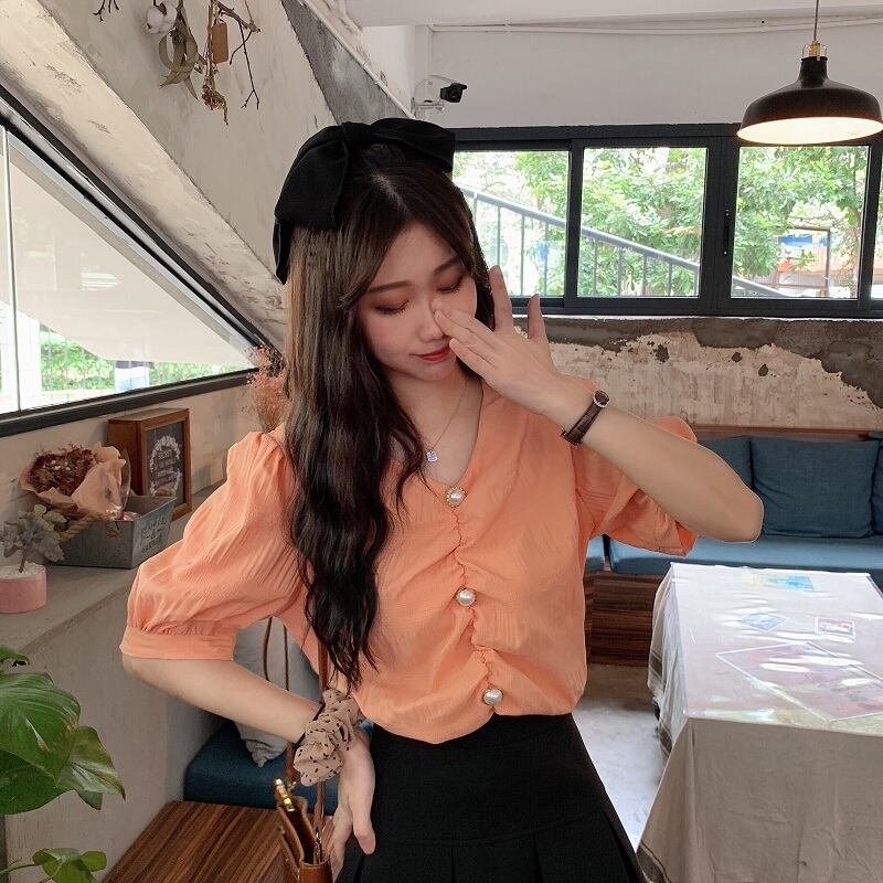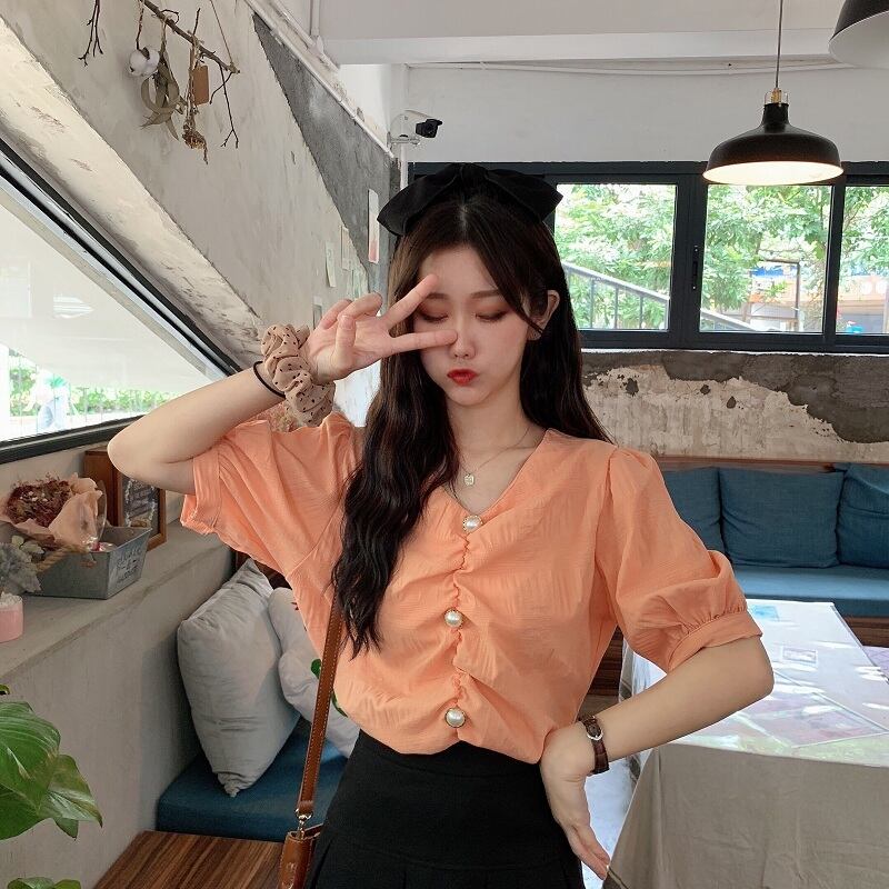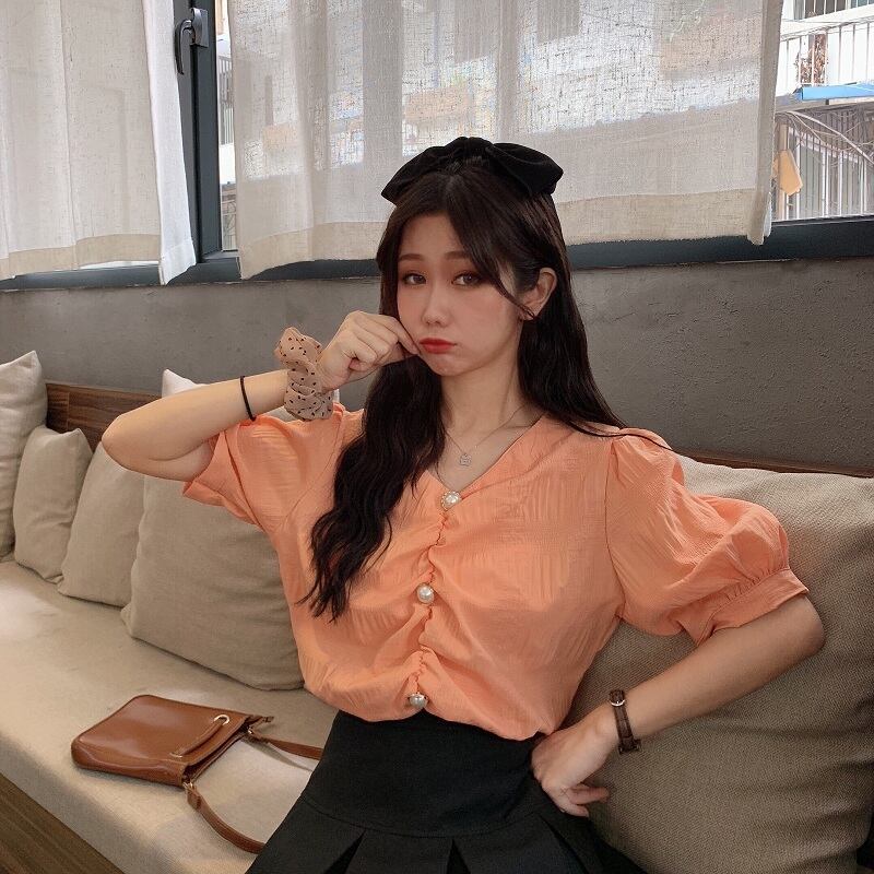 レッドプリーツショートスリーブトップス サマールーズVネック半袖シャツ レディース ハーフスリーブ 夏物 YY-ファッション37996551516