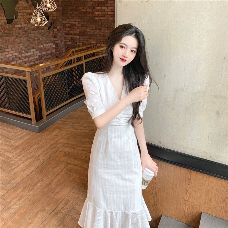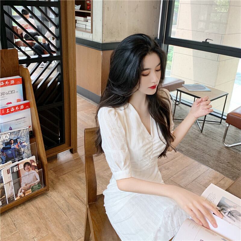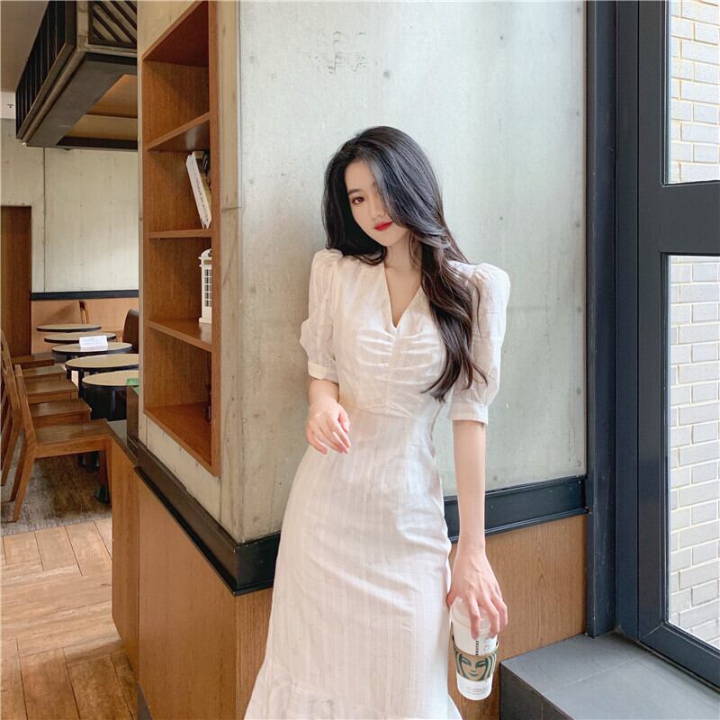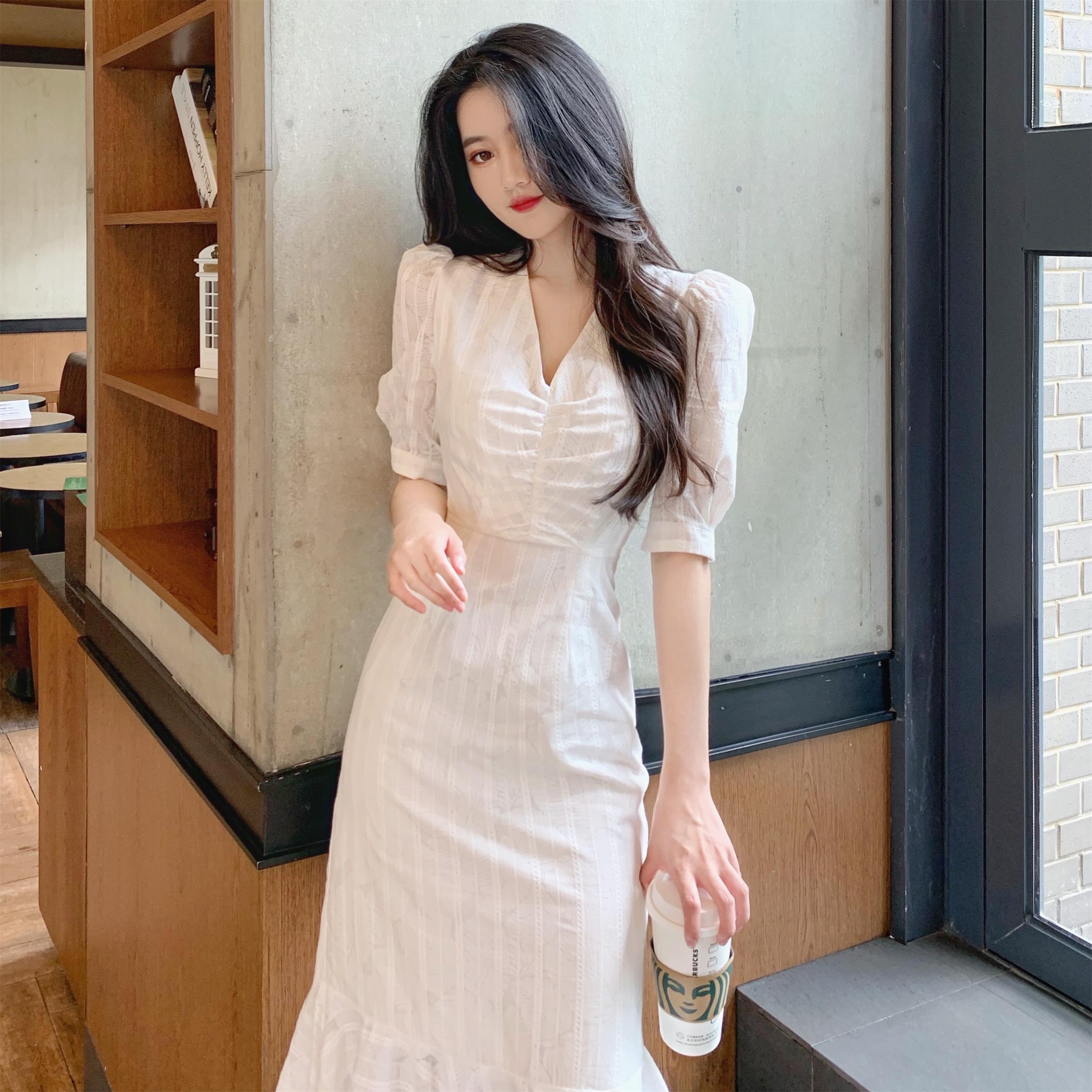 オータムウィンタースタンダードVネックホワイトスカート ウェストドレス レトロ 秋物 冬物 YY-ファッション61313978897