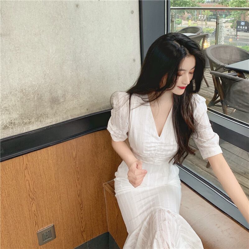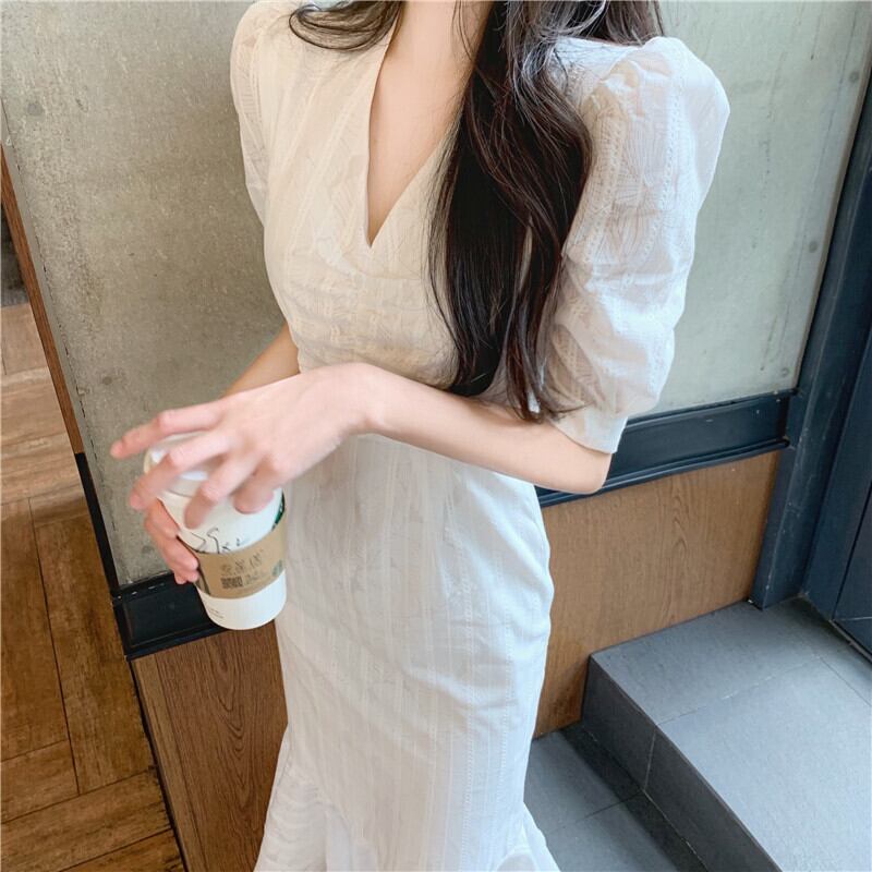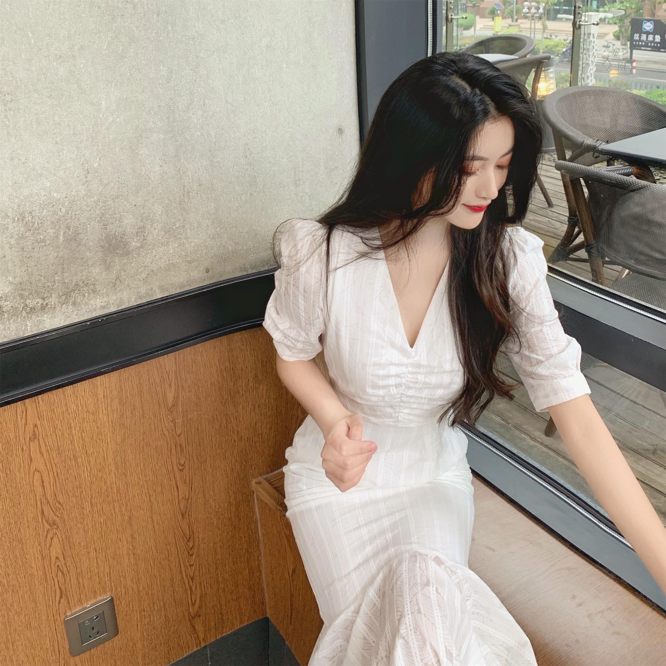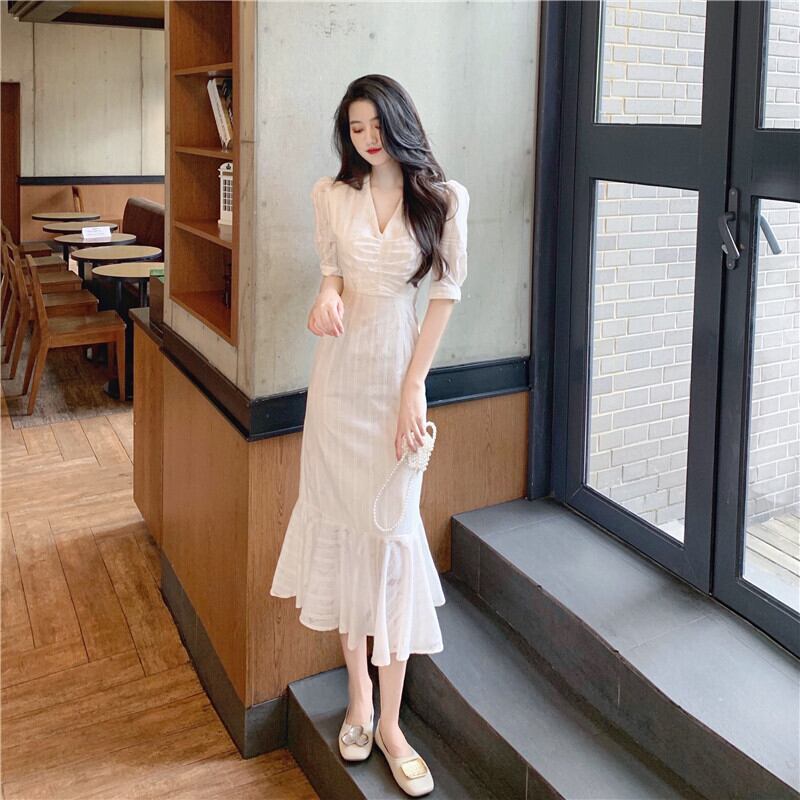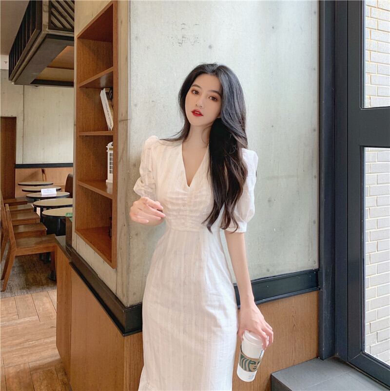 オータムウィンタースタンダードVネックホワイトスカート ウェストドレス レトロ 秋物 冬物 YY-ファッション61313978897
