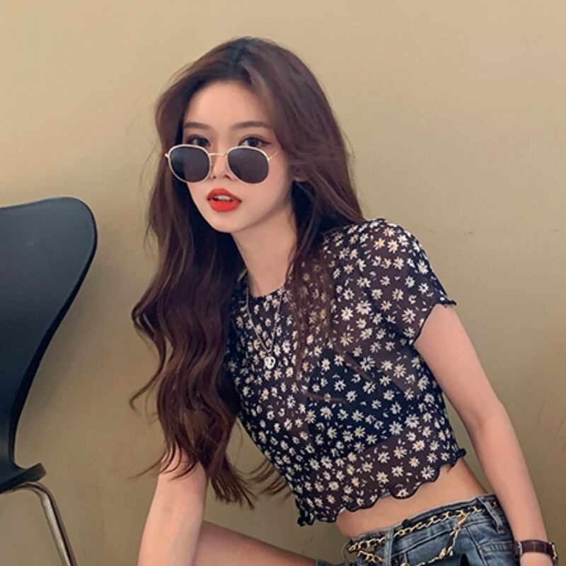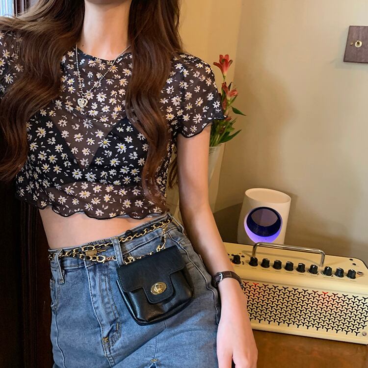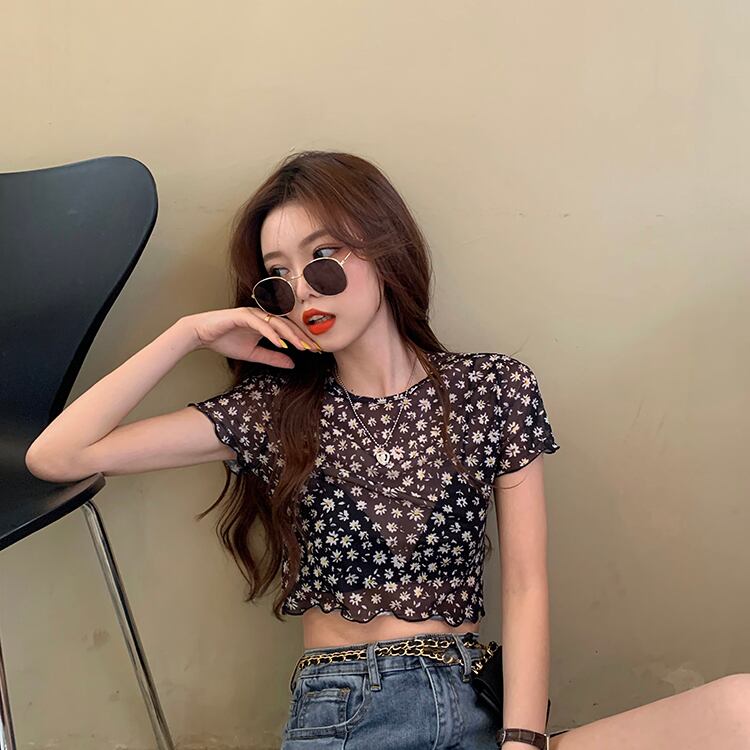 フローラルショートトップス レディースオータムウィンタースリム薄手Tシャツ 秋物 冬物 花柄 YY-ファッション14105189968