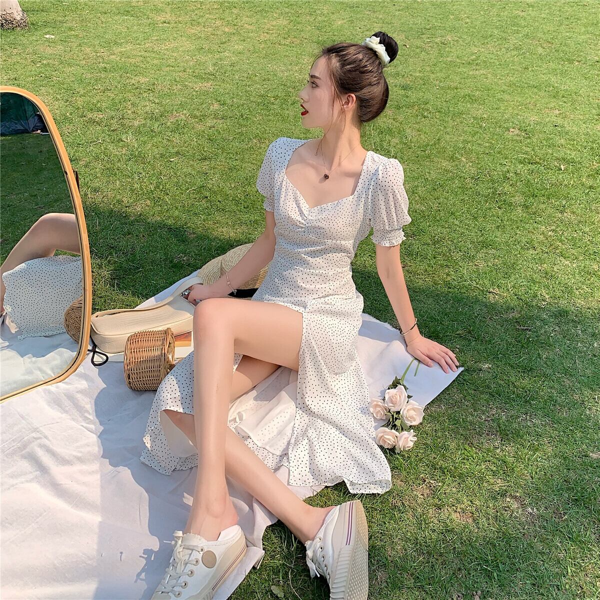 色:グリーンカーディガン,白い水玉スカート