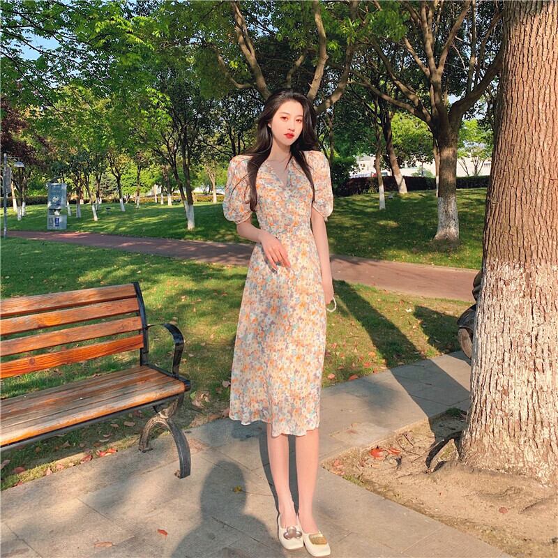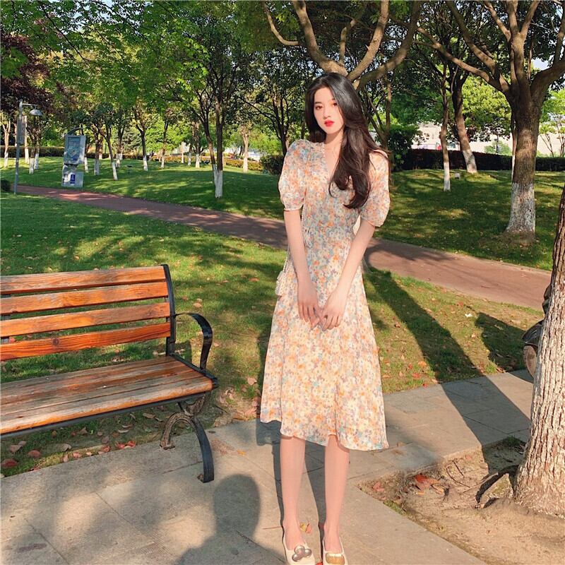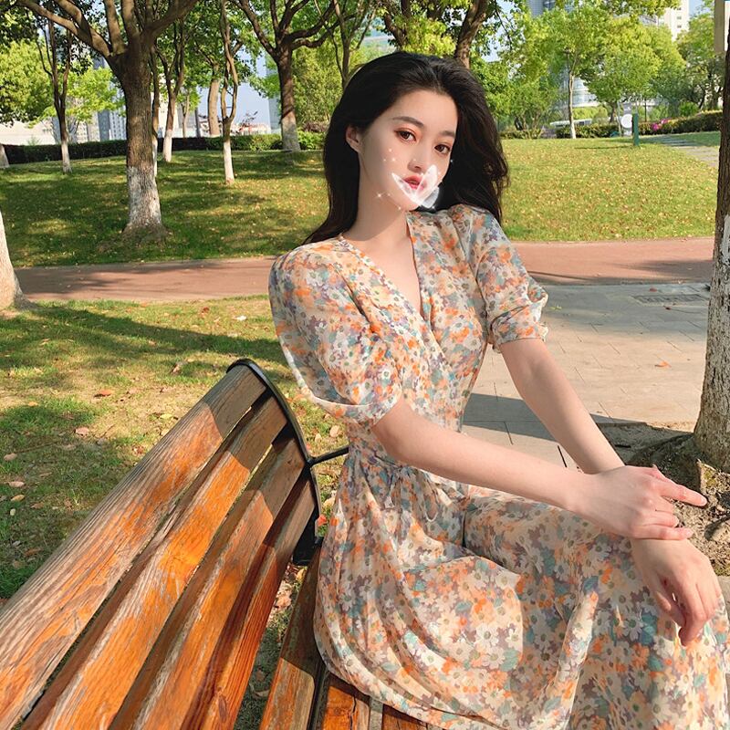 Vネックドレス オータムウィンターウェストシフォンフローラルスカート 秋物 冬物 花柄 YY-ファッション31234445612
