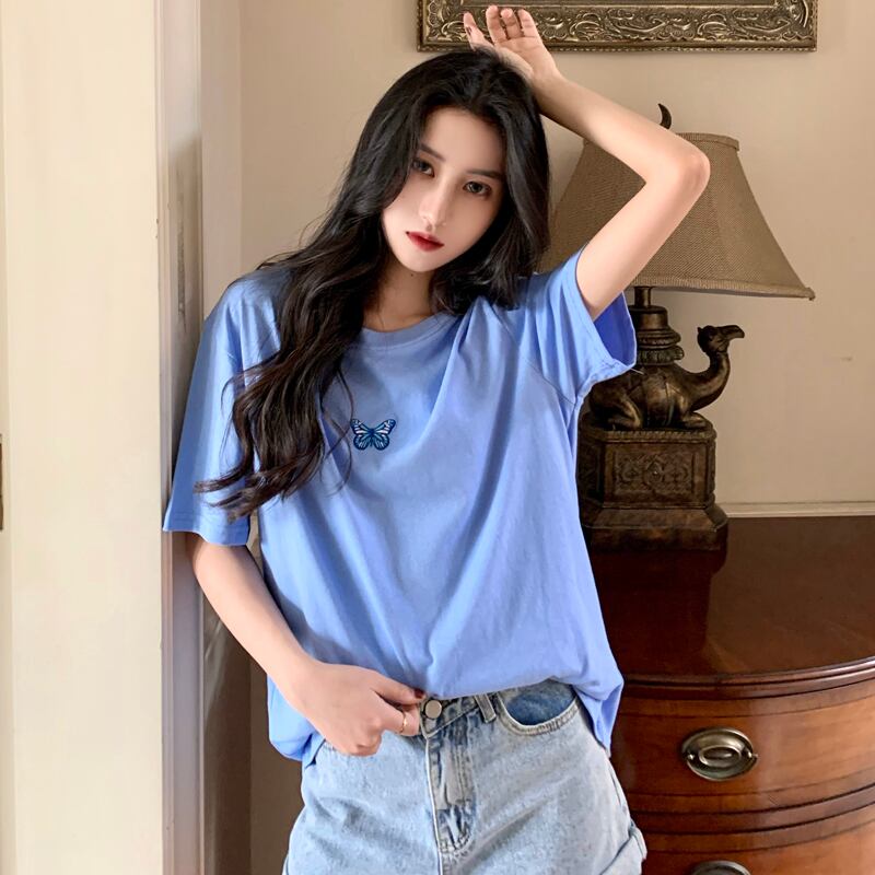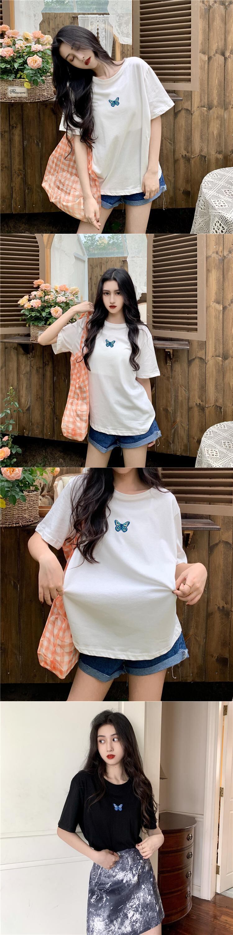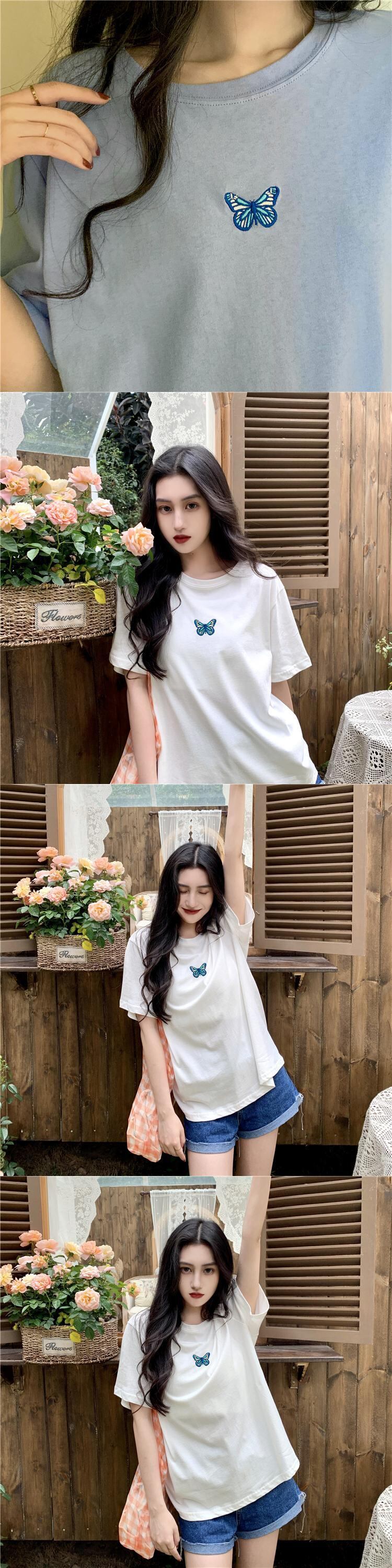 オータムウィンターレッドButterflyデザイン 刺繍Tシャツ レディースルーズトップス 秋物 冬物 YY-ファッション59842208630