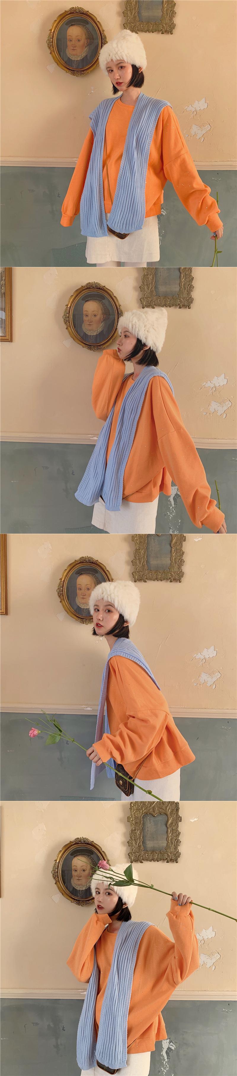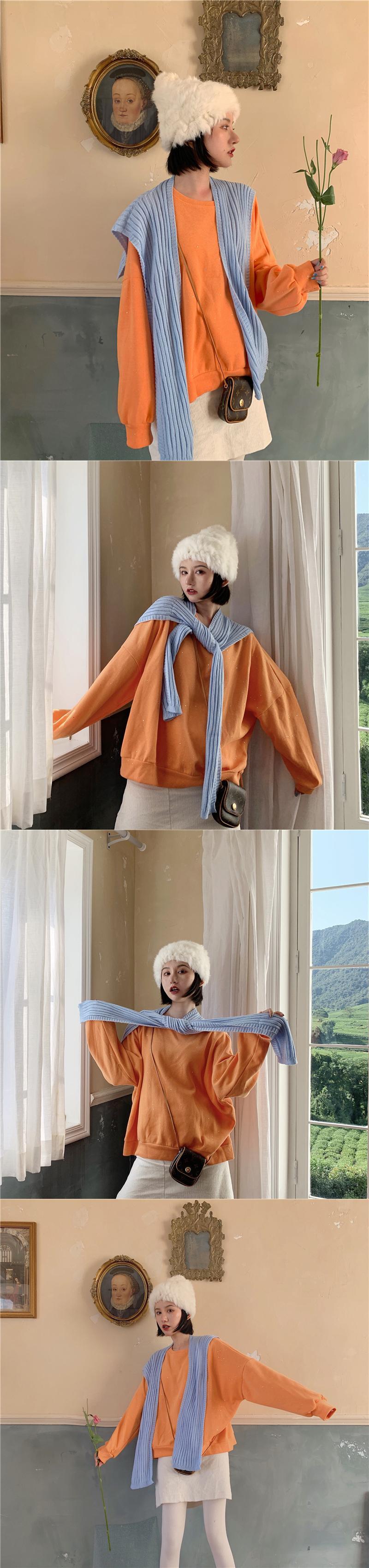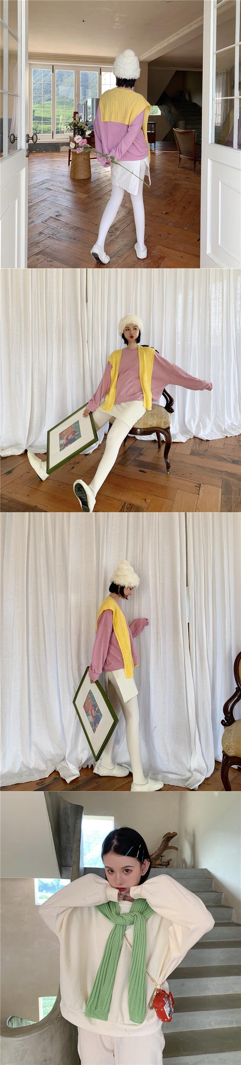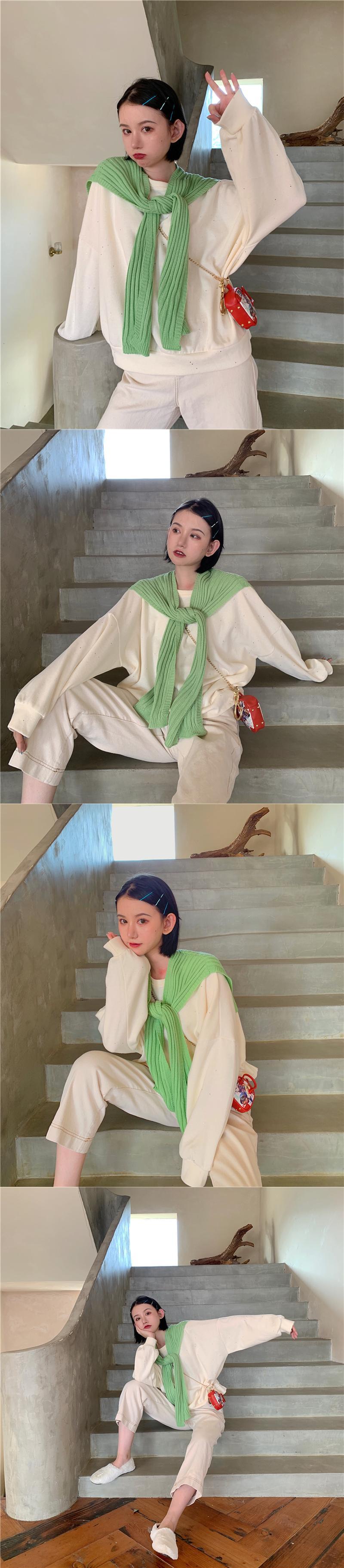 色:クリーム色の白いセーター,フラッシュグレーのセーター,フラッシュブラックセーター,ターコイズグリーンのスウェットシャツ,ライトオレンジのセーター,紫ピンクのセーター,レモンイエローのショール,水色のショール,アボカドグリーンショール,ベージュのショール,ブラックショール
