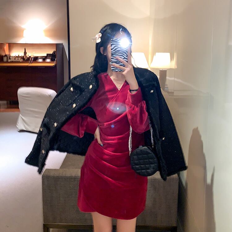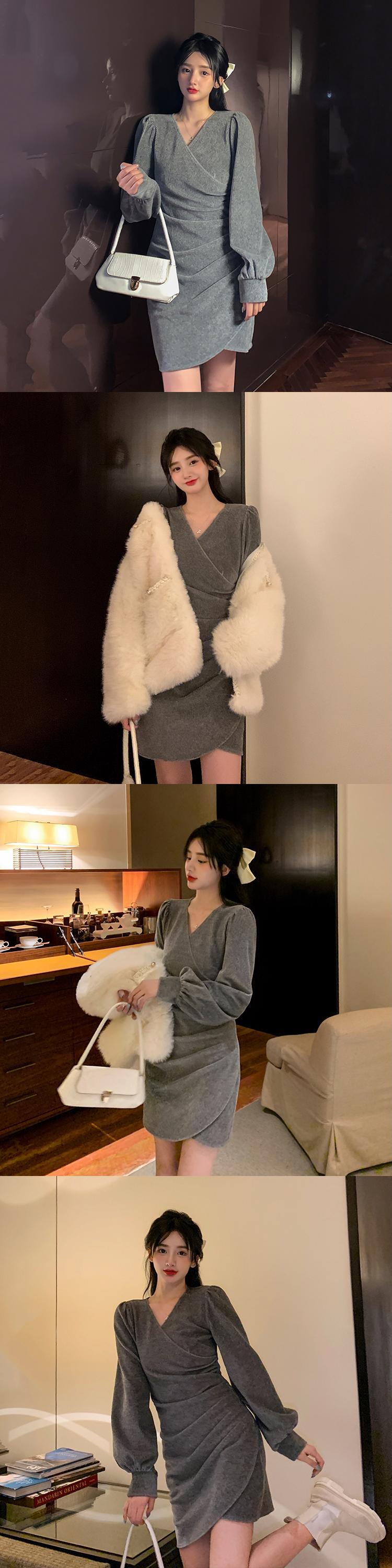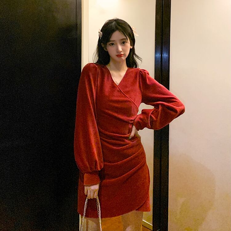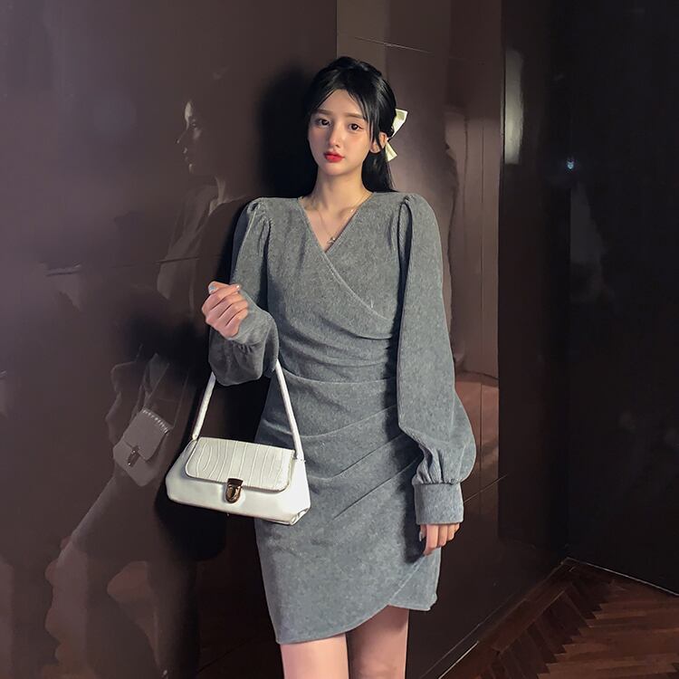 Vネックスリムドレス ロングスタンダードスカート スプリングオータム レトロ 長袖 春物 秋物 YY-ファッション16504530669
