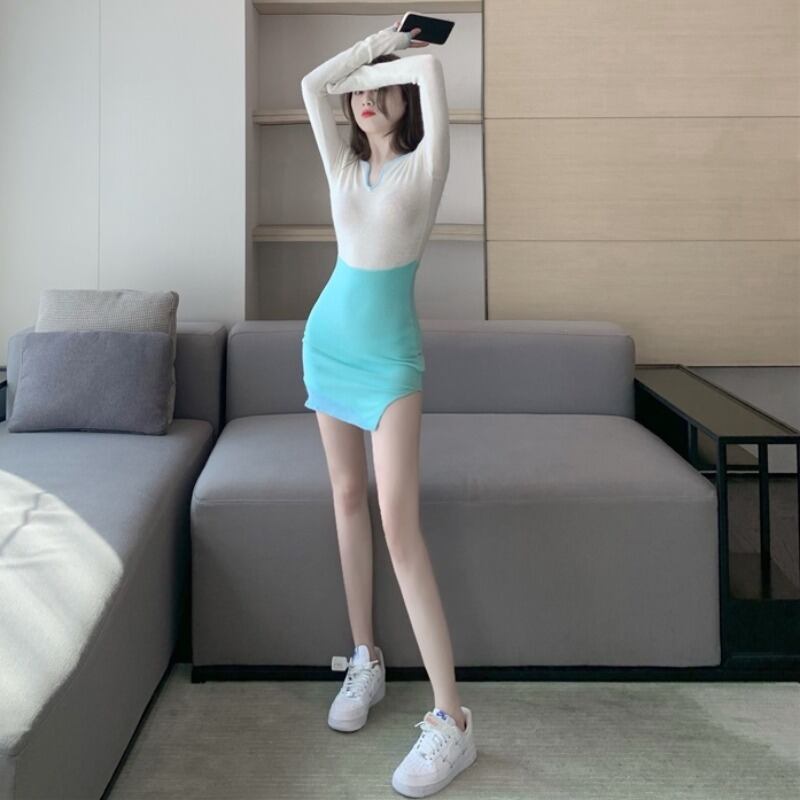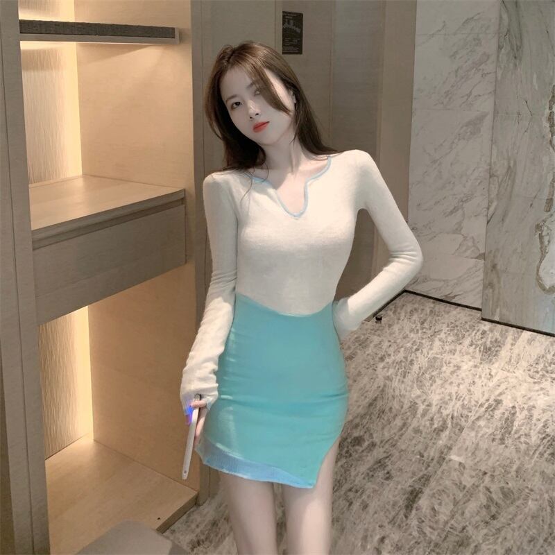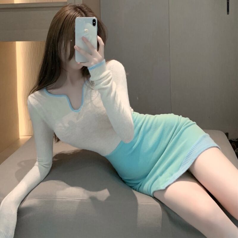 スプリングオータムVネックカラーニットドレス ショートスカート レディース 春物 秋物 YY-ファッション82633205938