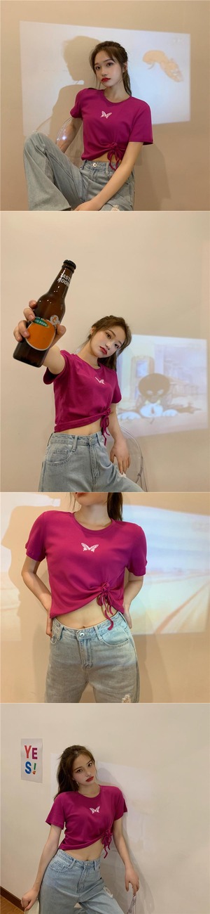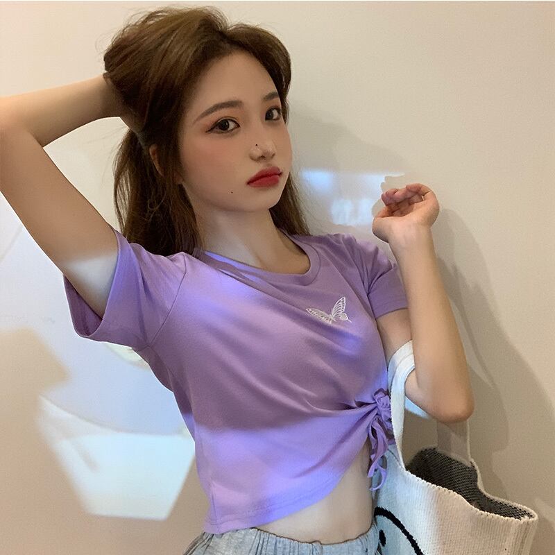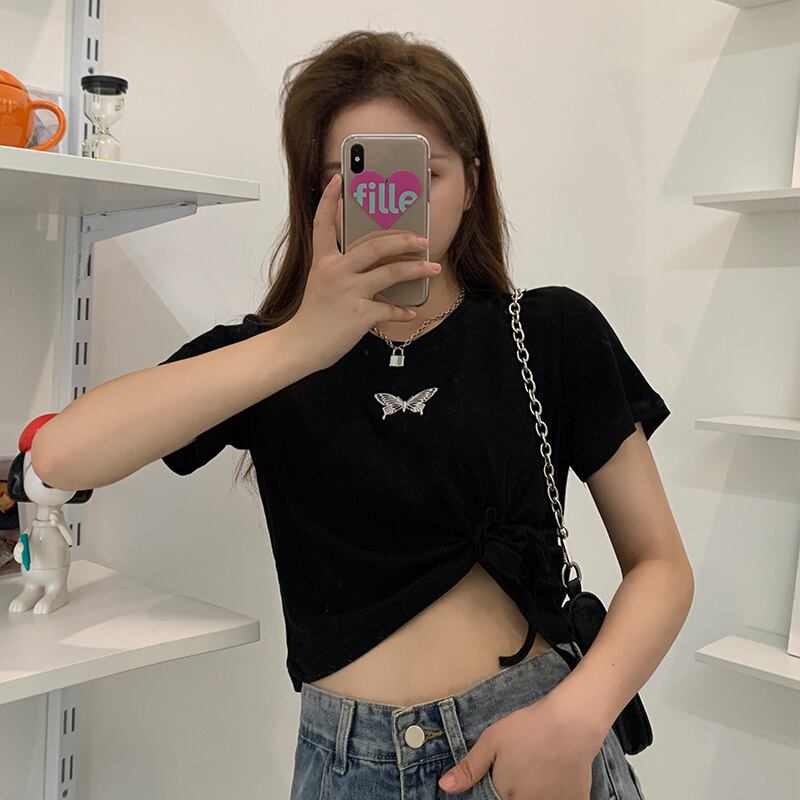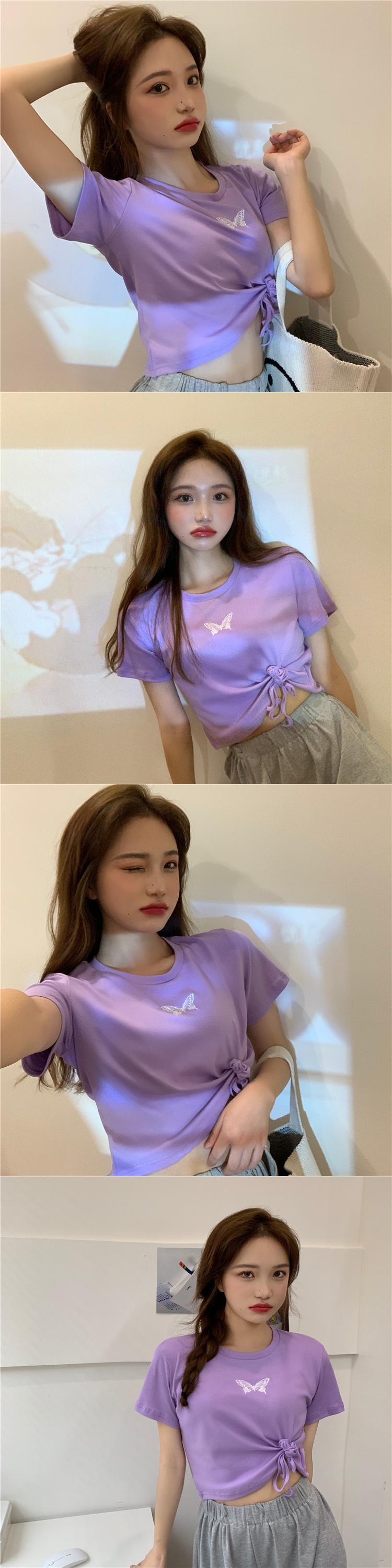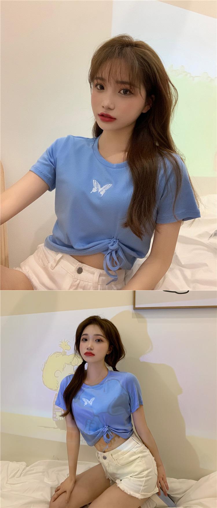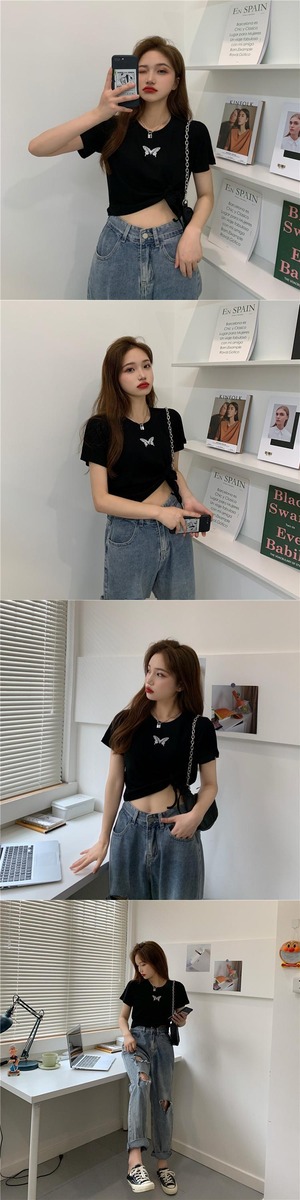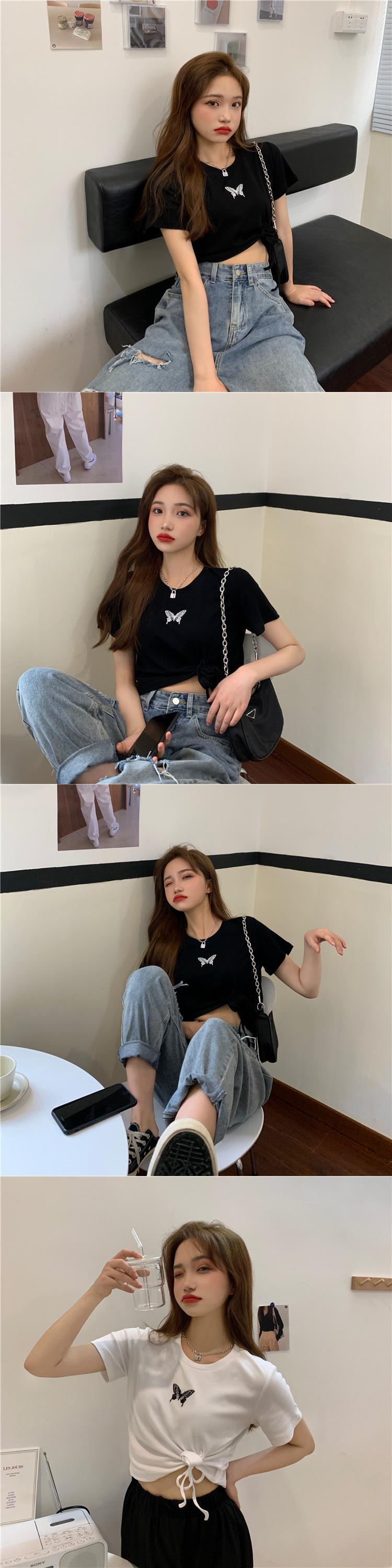 ショートハイウェストButterflyデザイン 刺繍スタイル Oネック Tシャツ YY-ファッション46978320465