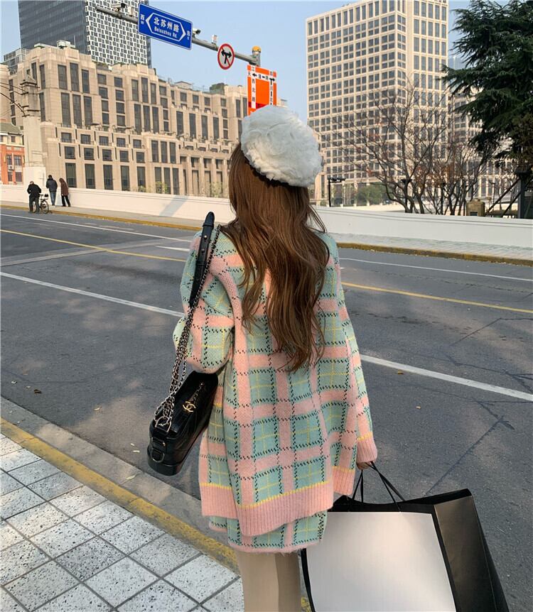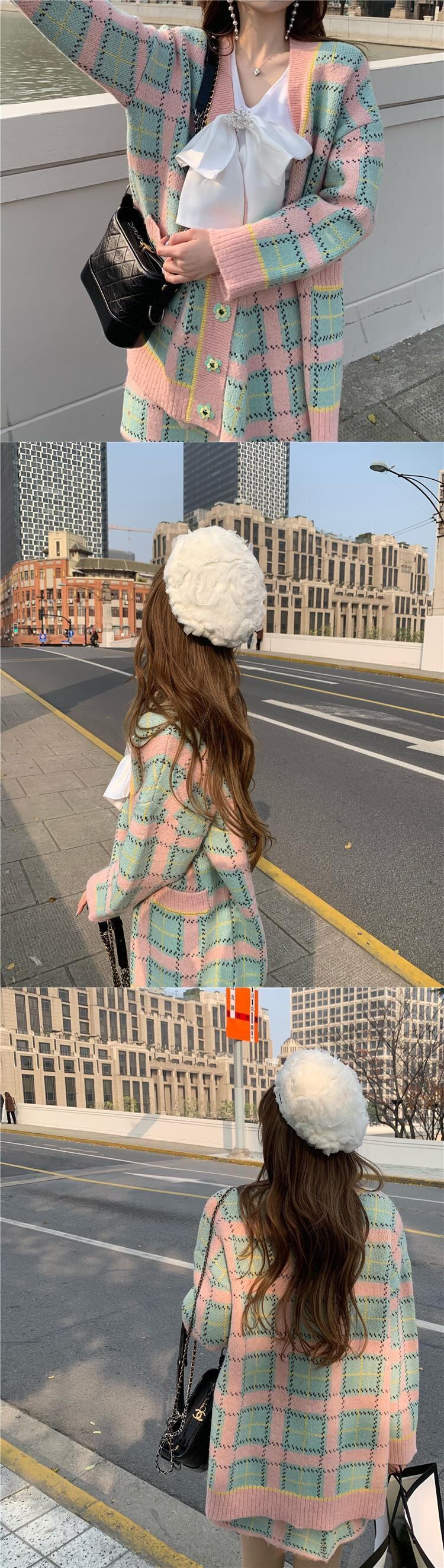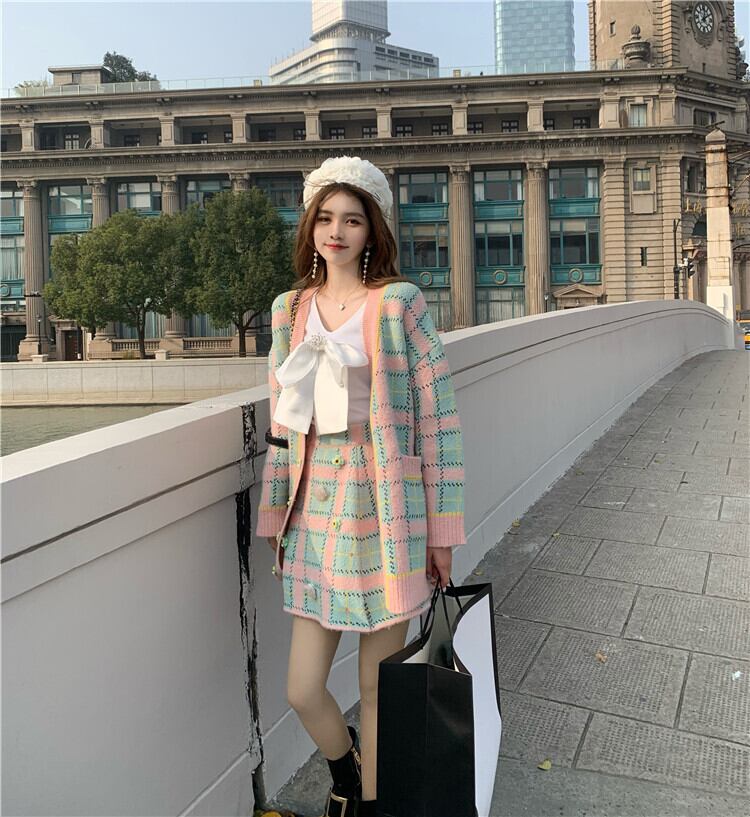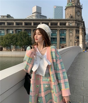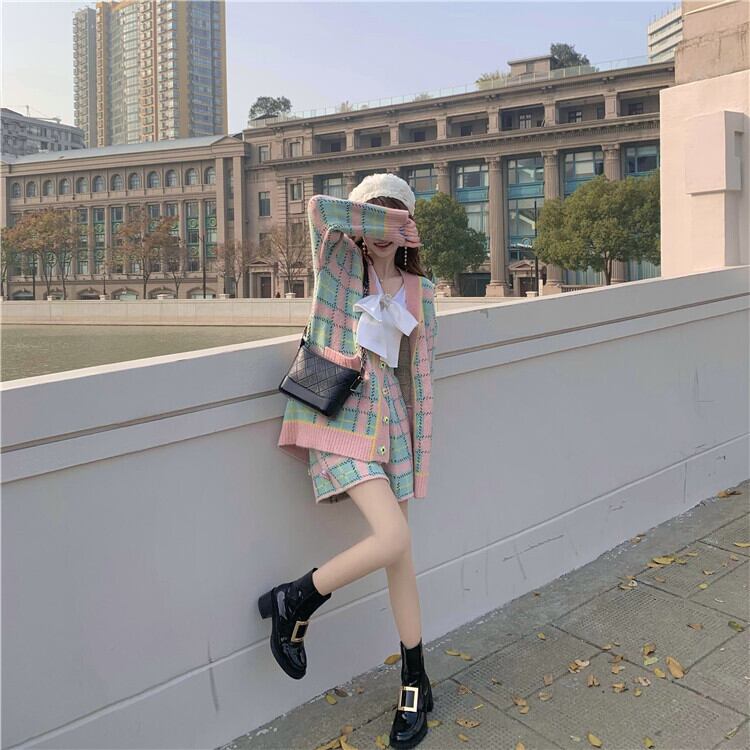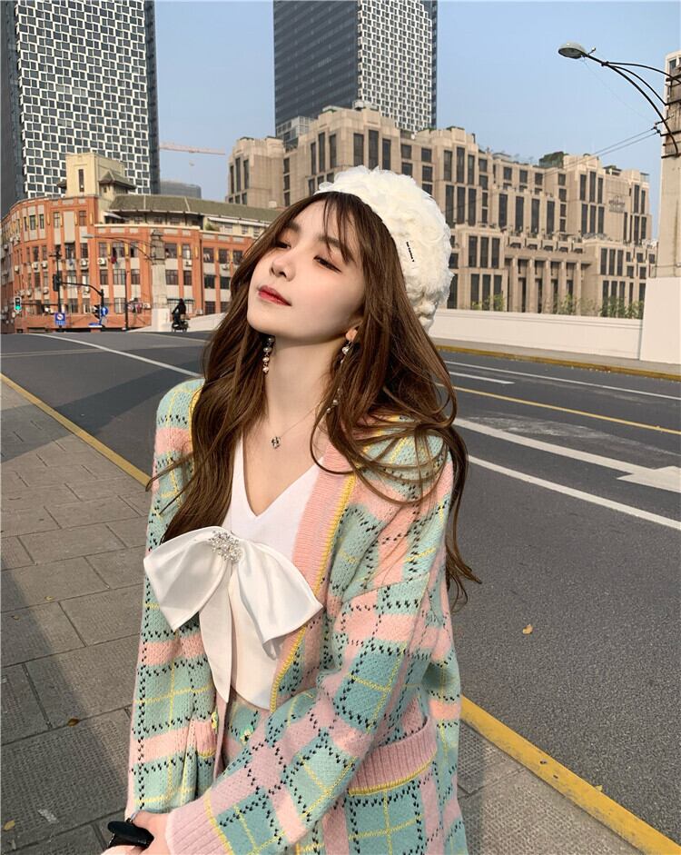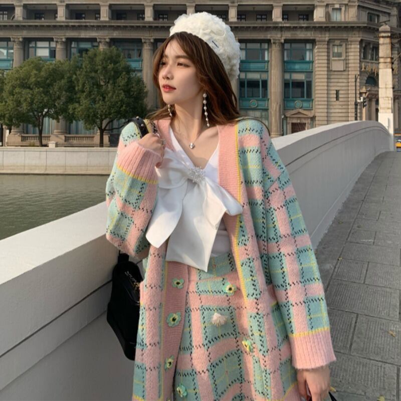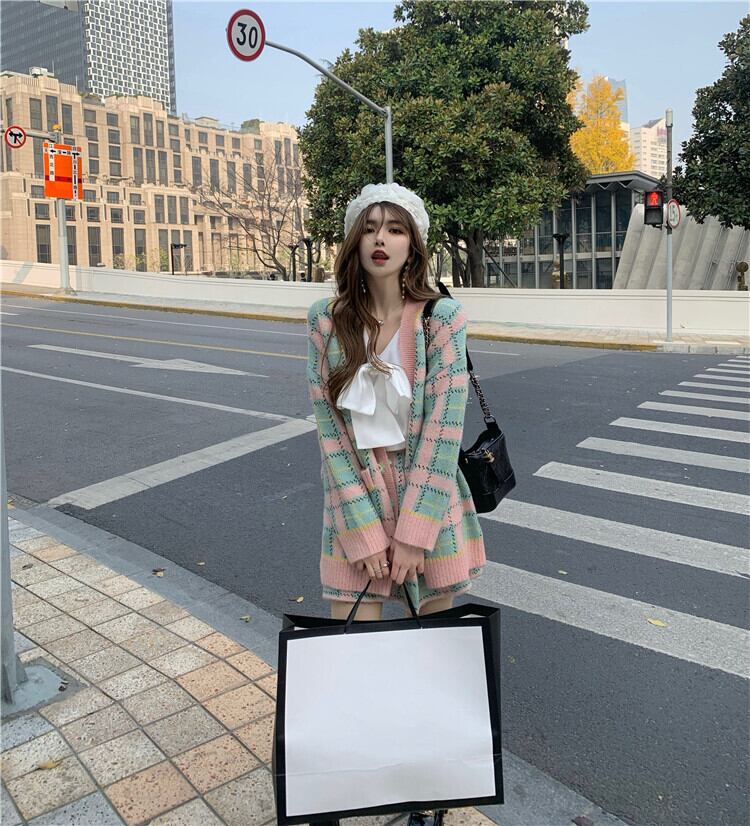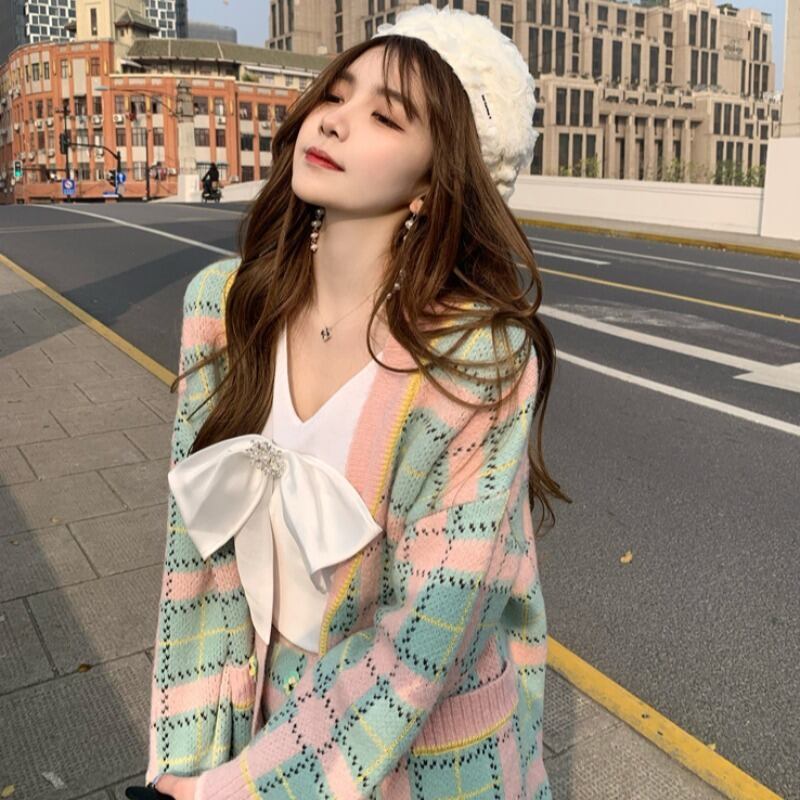 格子柄セーター レディースウィンターカーディガンジャケット リボンシャツ スカート 冬物 YY-ファッション48931323297