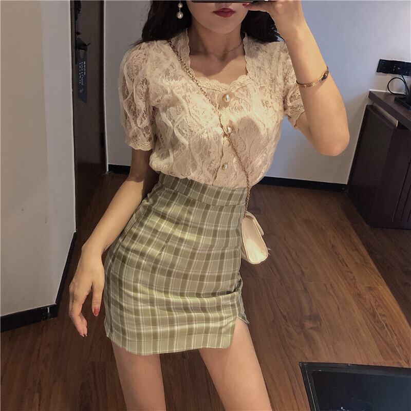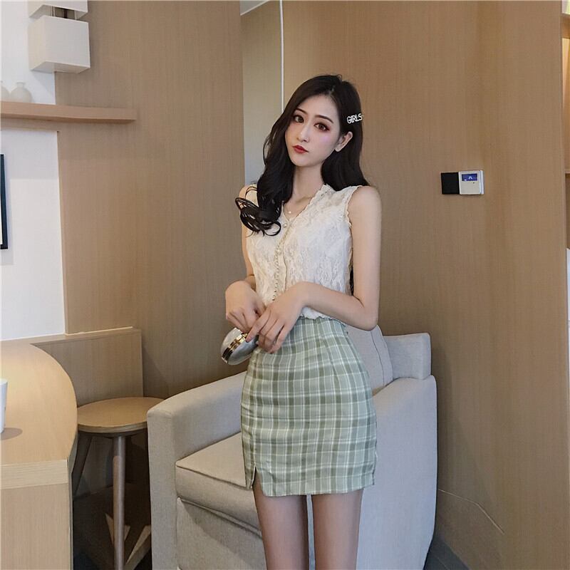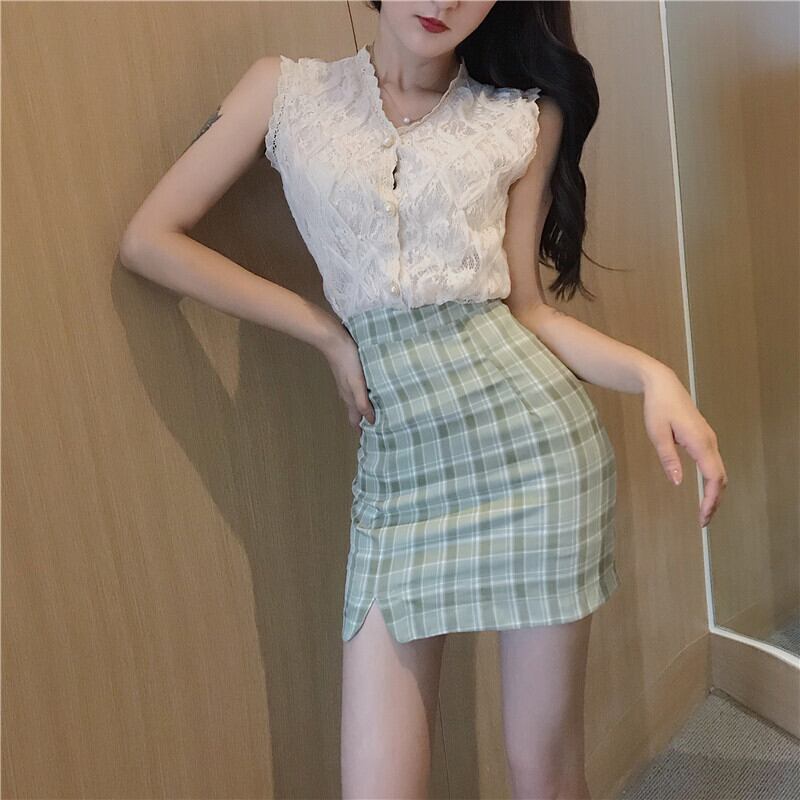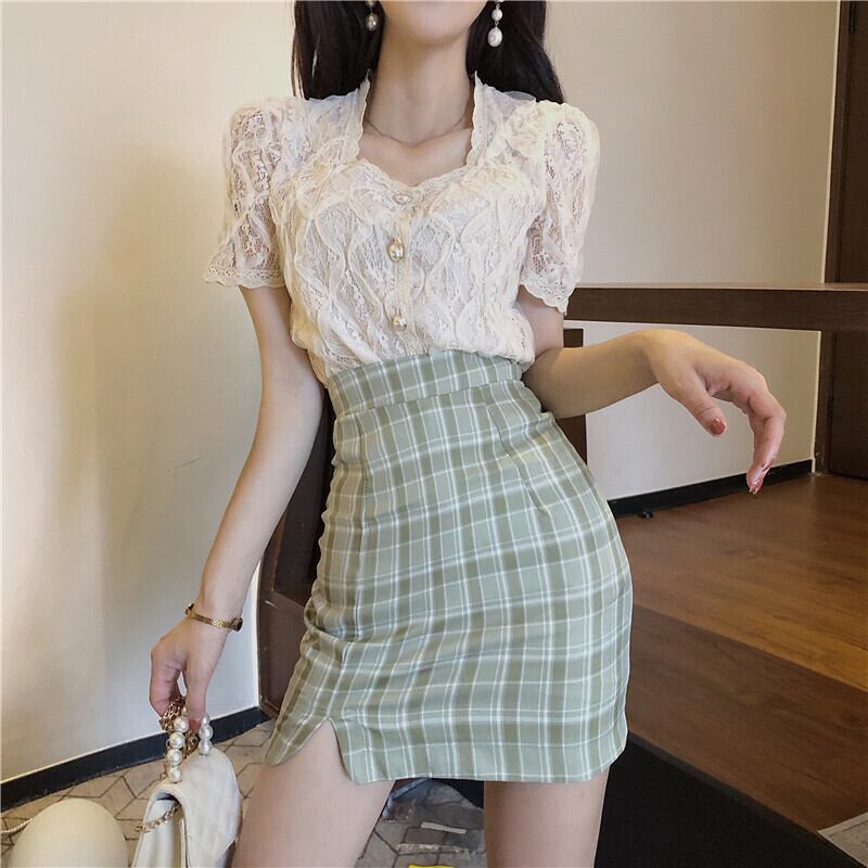 スプリングレッドレーストップス グリーン格子柄スカート 春物 YY-ファッション72960343549