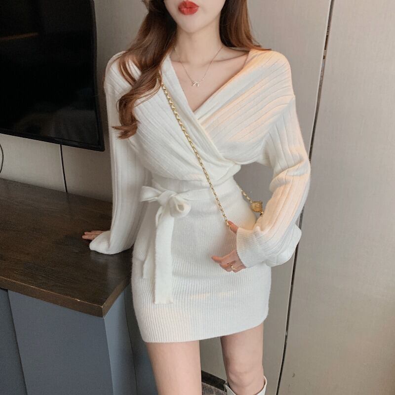 スプリングVネックニットセーター ドレス スリムバンドスカート 春物 YY-ファッション98139251404