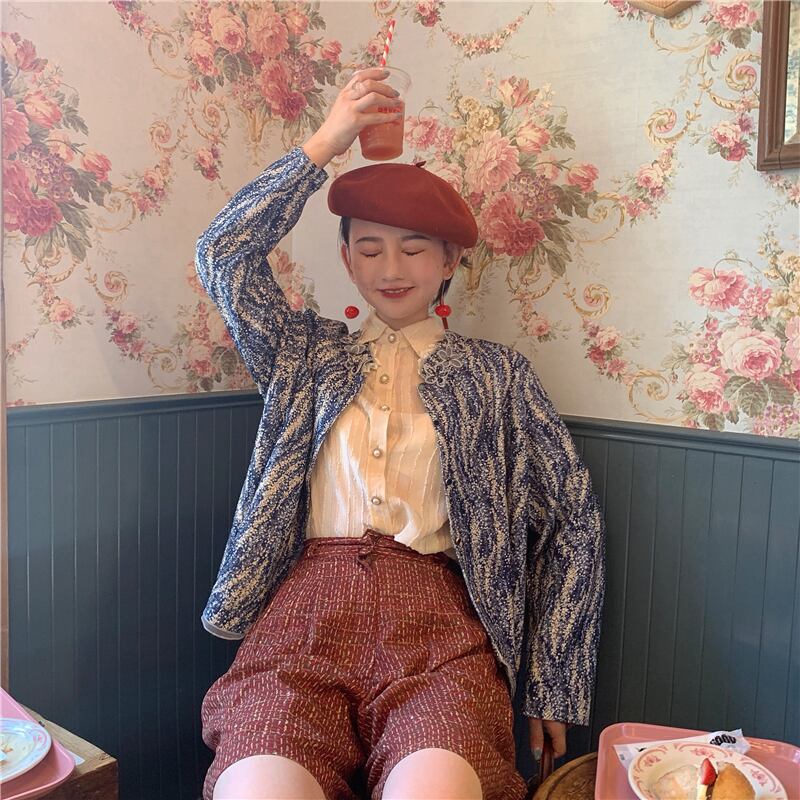 色:青い小麦の耳の星空のジャケット,オフホワイトのシャツ,レトロレッドワイドレッグパンツ