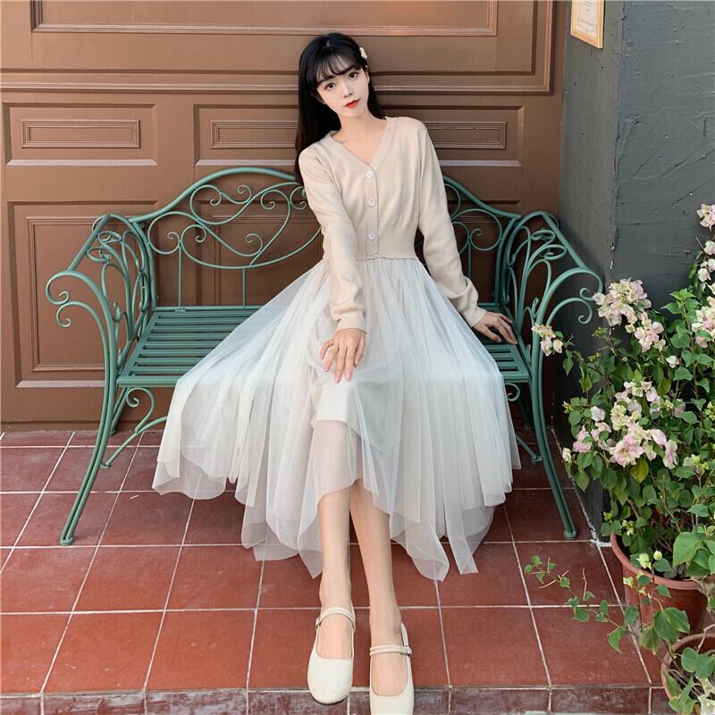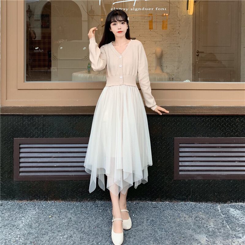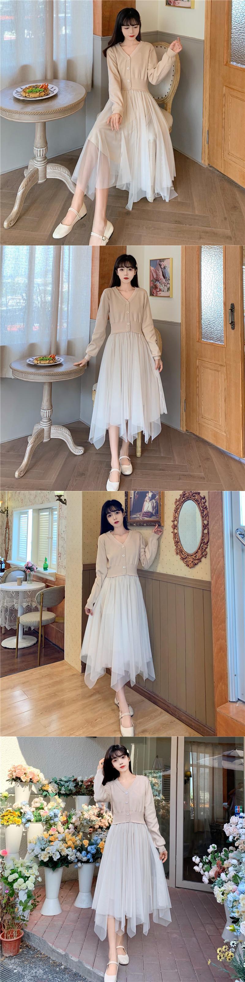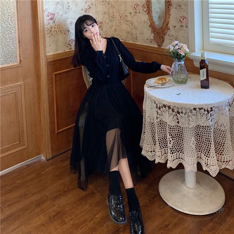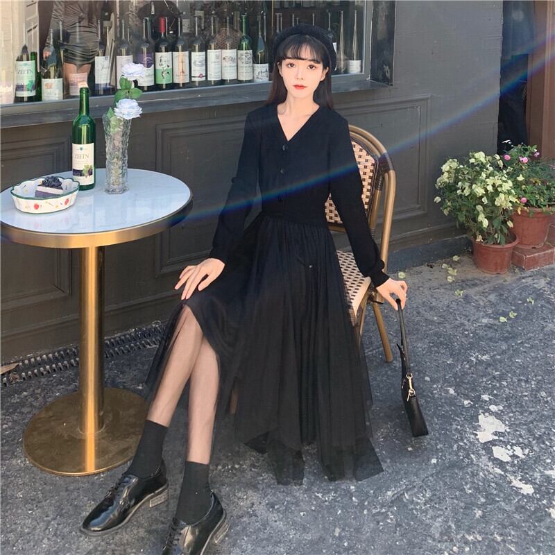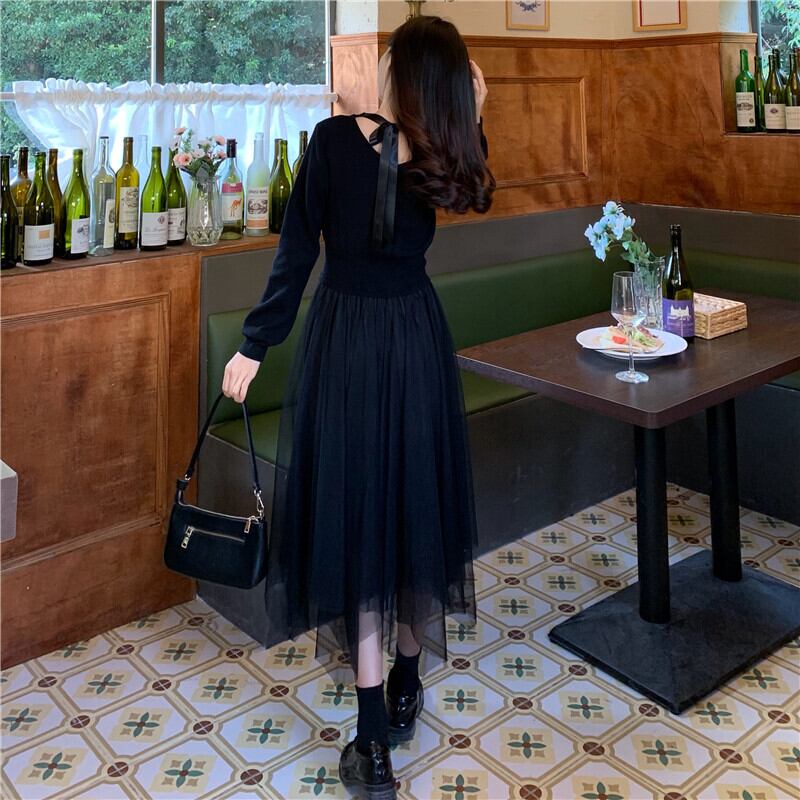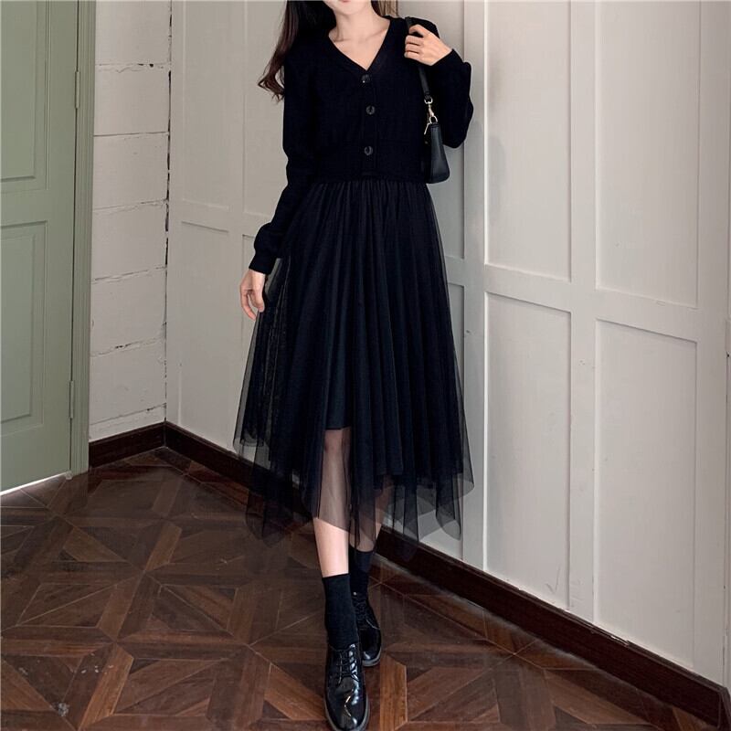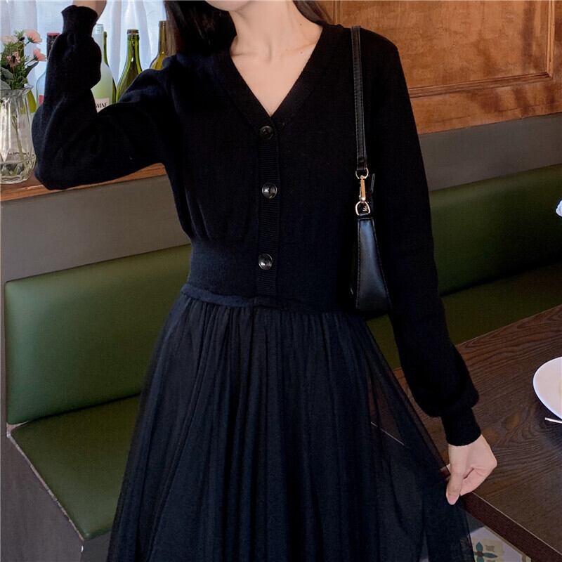 Vネックメッシュスカート バックブラックニットドレス レディース ステッチ YY-ファッション56676016211