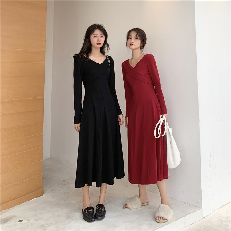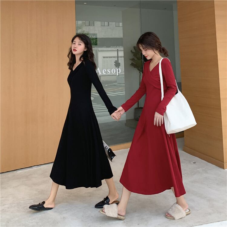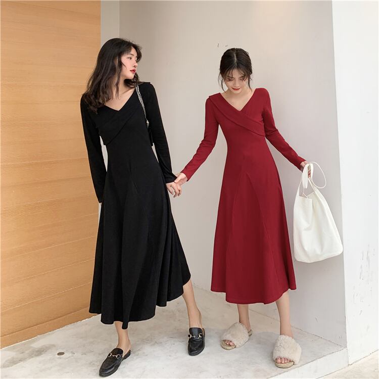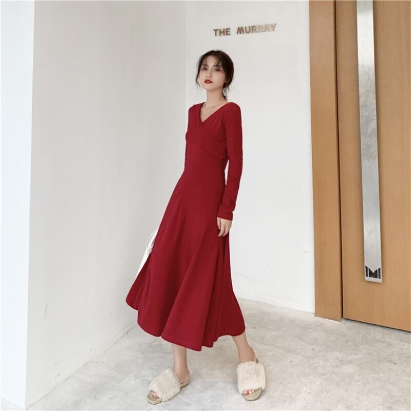 スプリングレッドVネックスリムロングAラインドレス スカート 春物 YY-ファッション23459463939