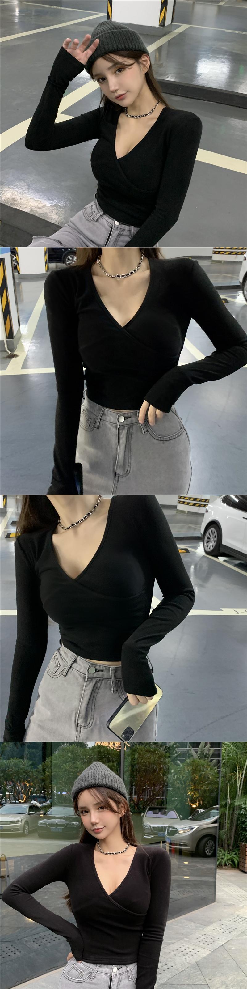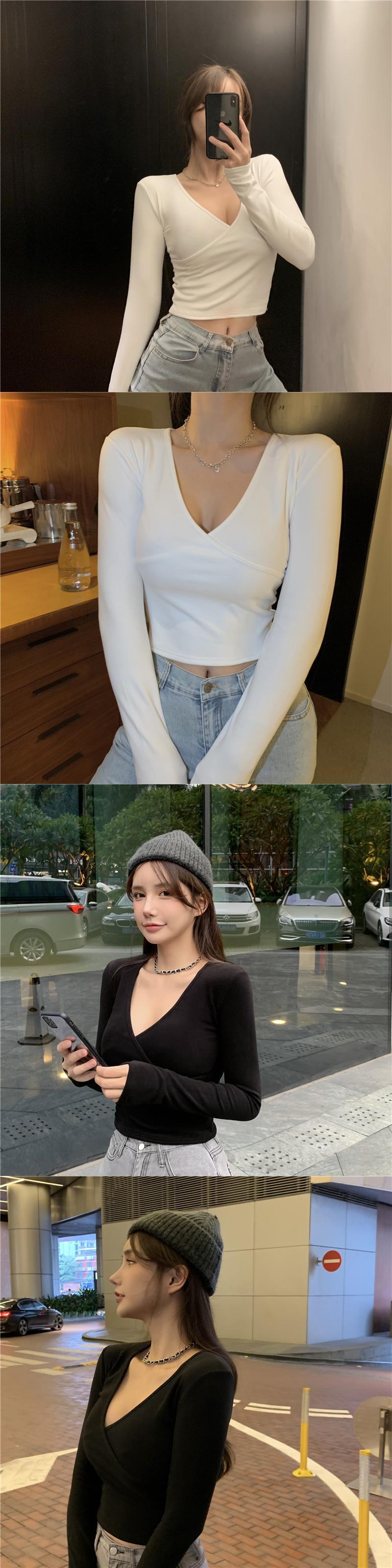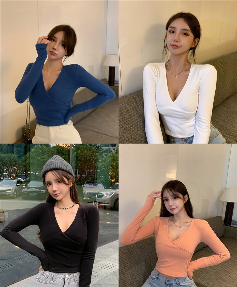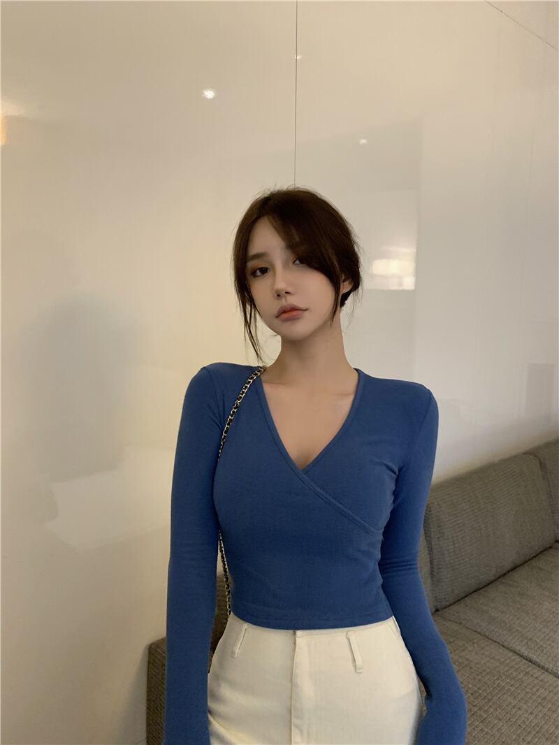 ソリッド カラーシャツ スプリングスリムVネックTシャツ ショートトップス レディース ロング 春物 ソリッドカラー YY-ファッション96308775025
