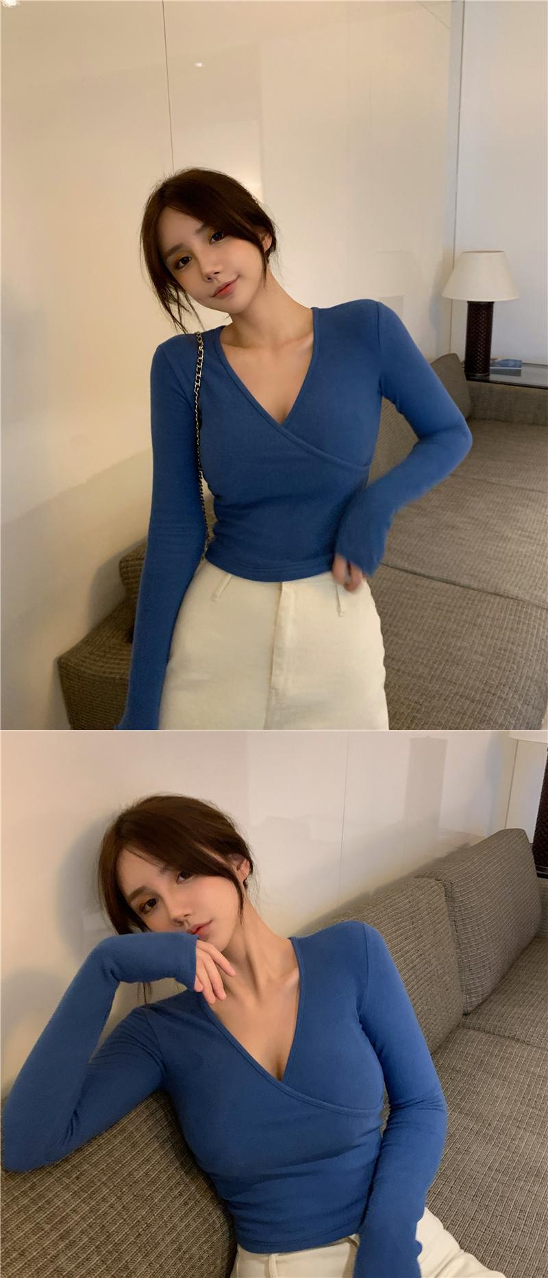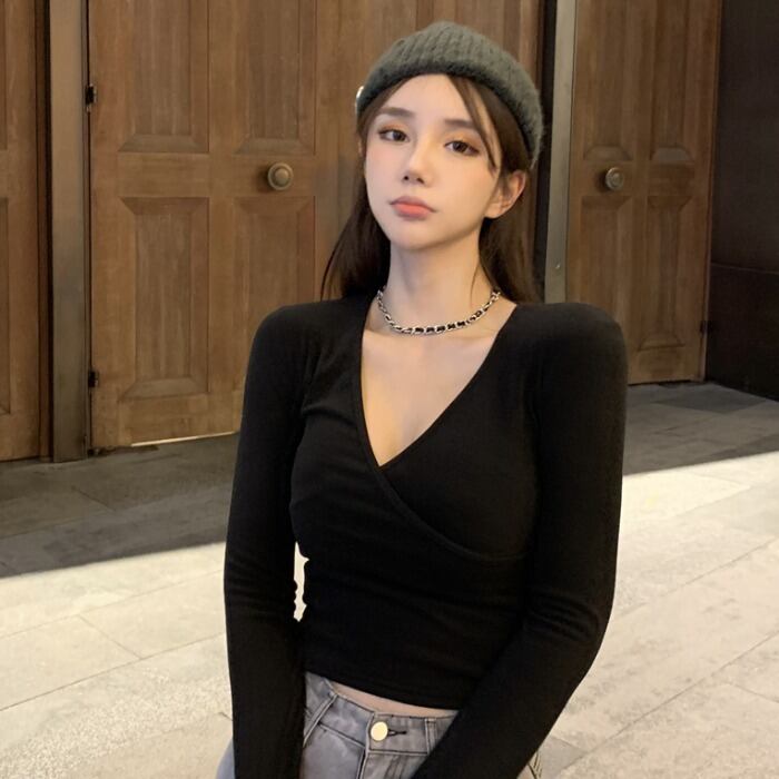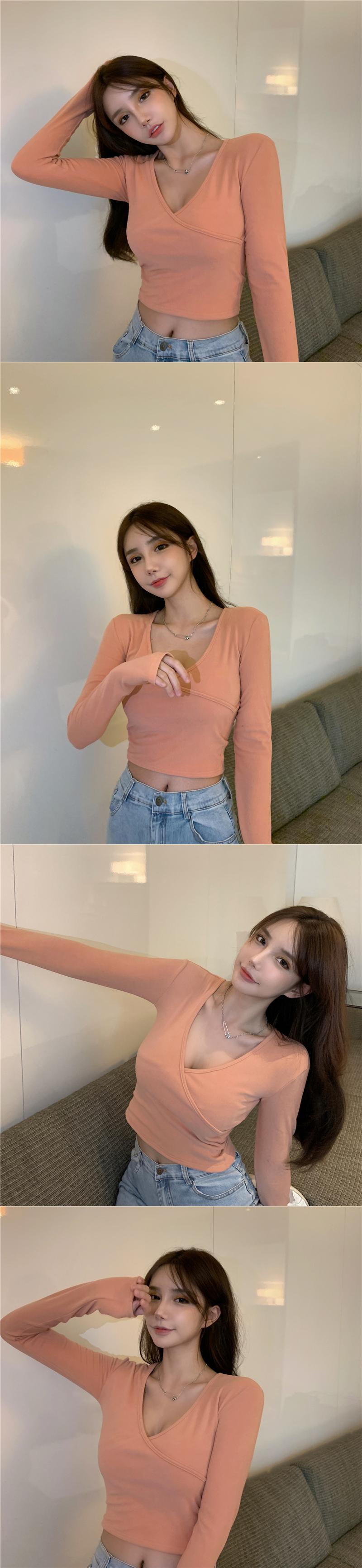 ソリッド カラーシャツ スプリングスリムVネックTシャツ ショートトップス レディース ロング 春物 ソリッドカラー YY-ファッション96308775025