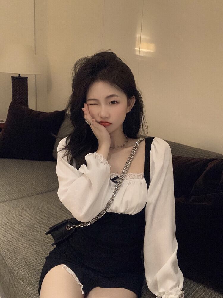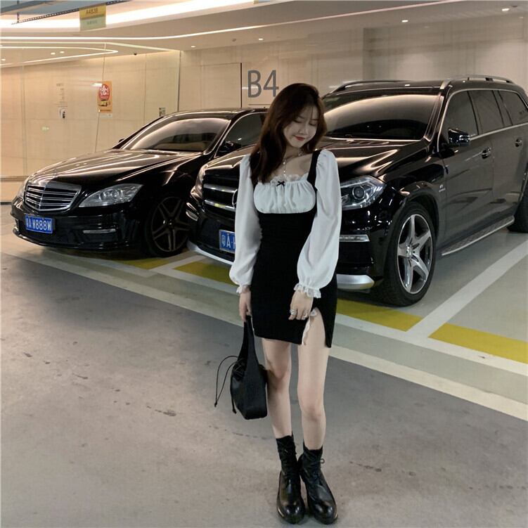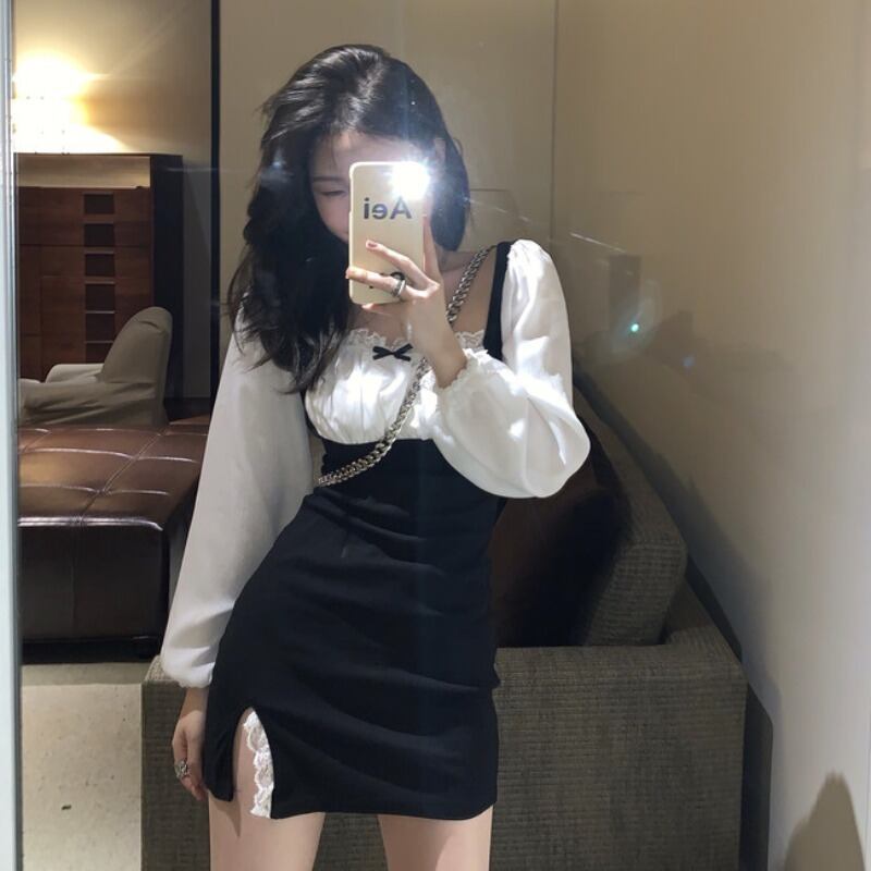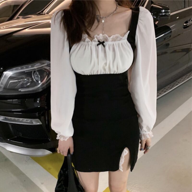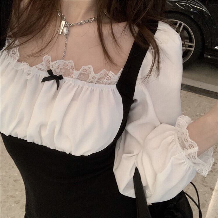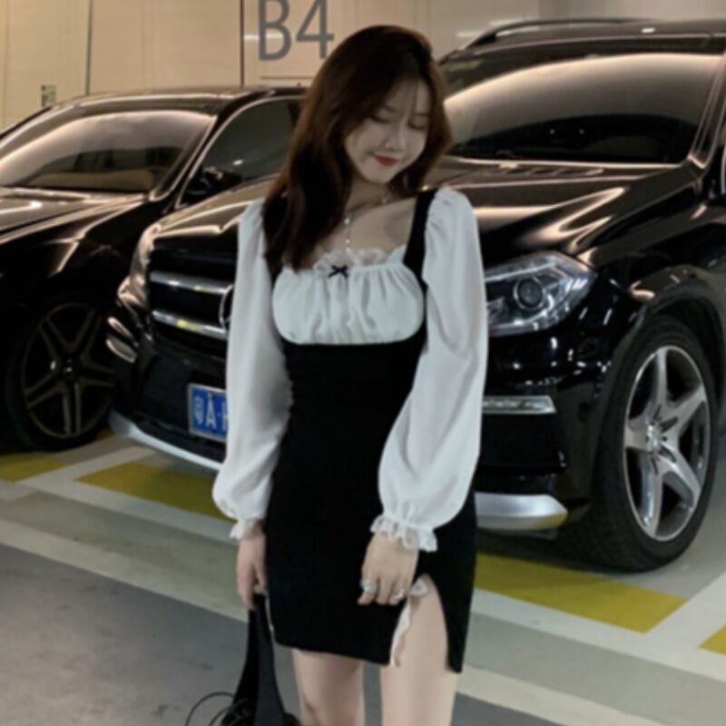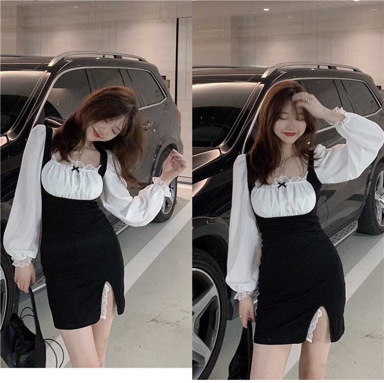 スプリングレーススリーブドレス カラースリムスカート 春物 スクウェア YY-ファッション38391402683