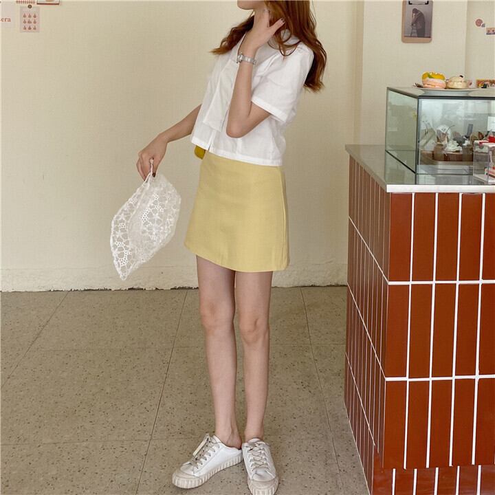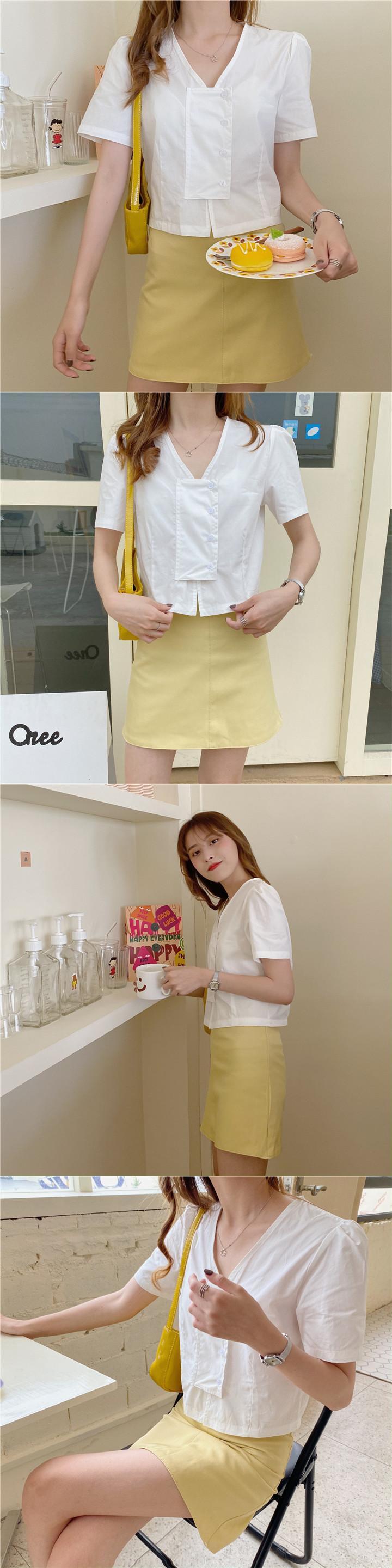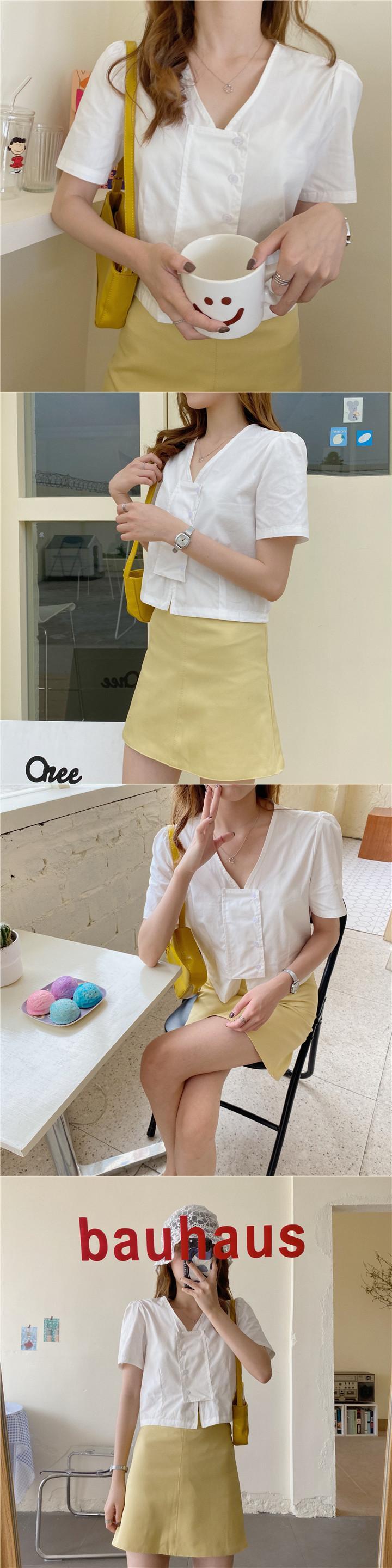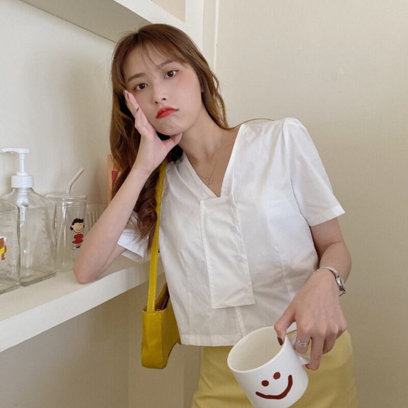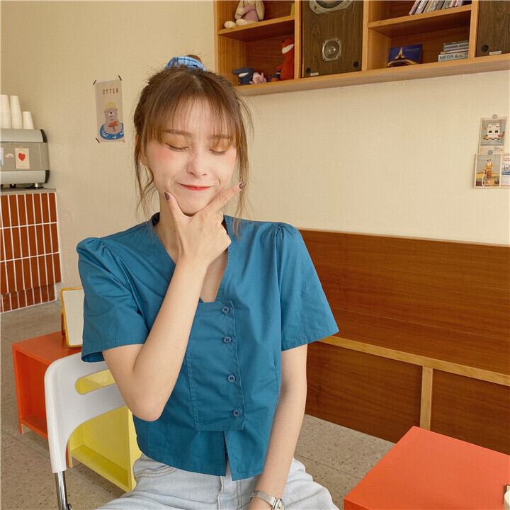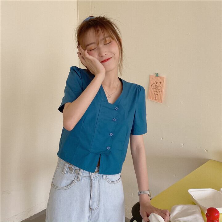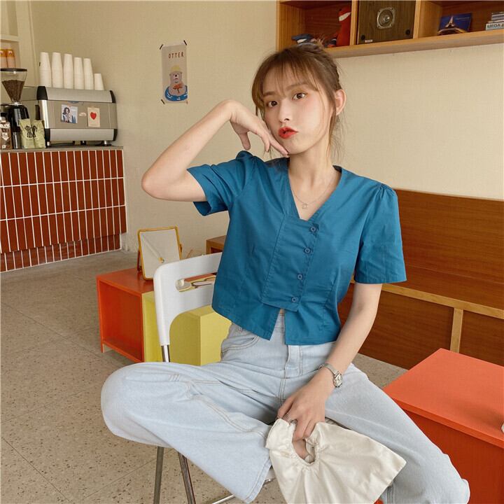 スタンダードブルーシャツ ショートVネックブラウス レディースサマー レトロ 夏物 YY-ファッション68121715380