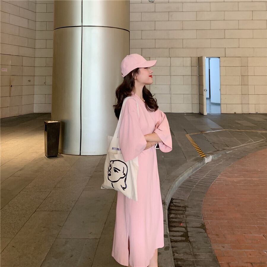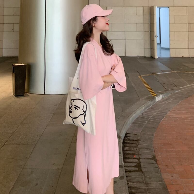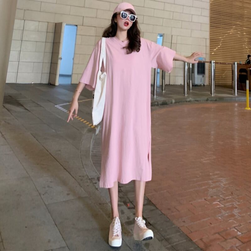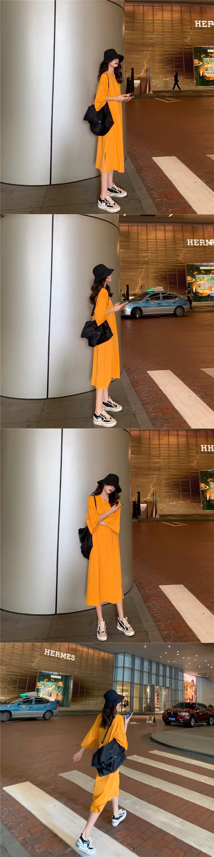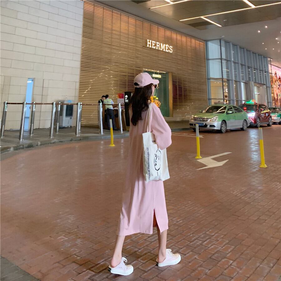 スプリングオータムラウンドネックTシャツ ドレス ルーズスリットスカート レディース 春物 秋物 Oネック YY-ファッション9241955152