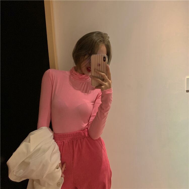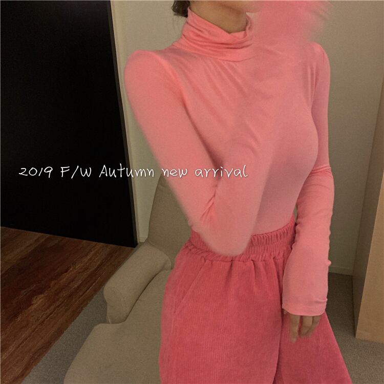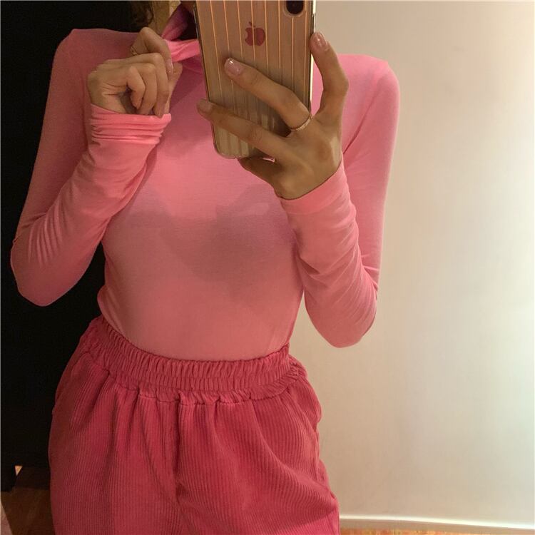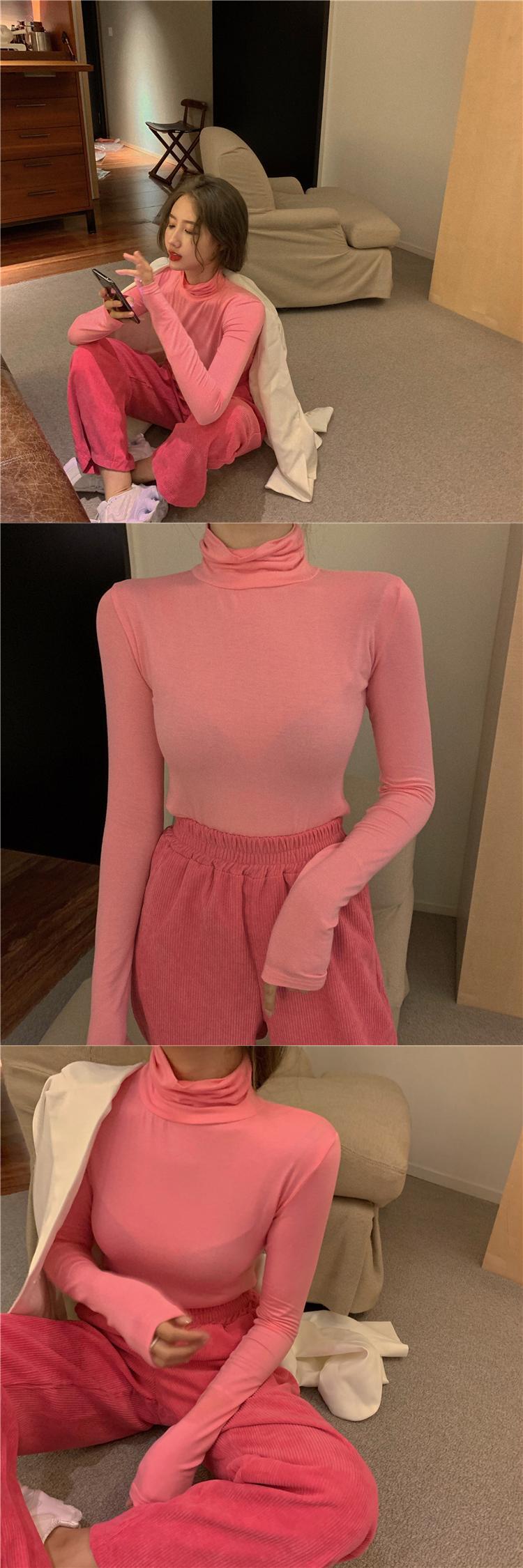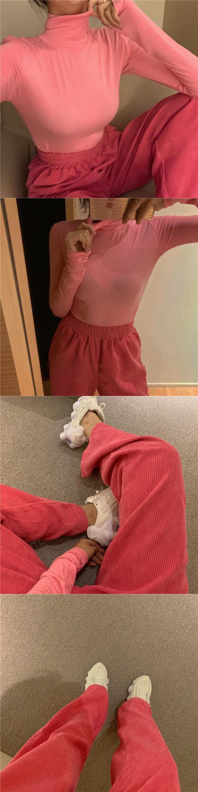 色:ピンクのハイネックt,ローズレッドパンツ