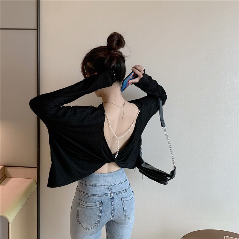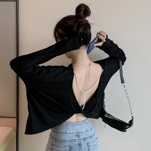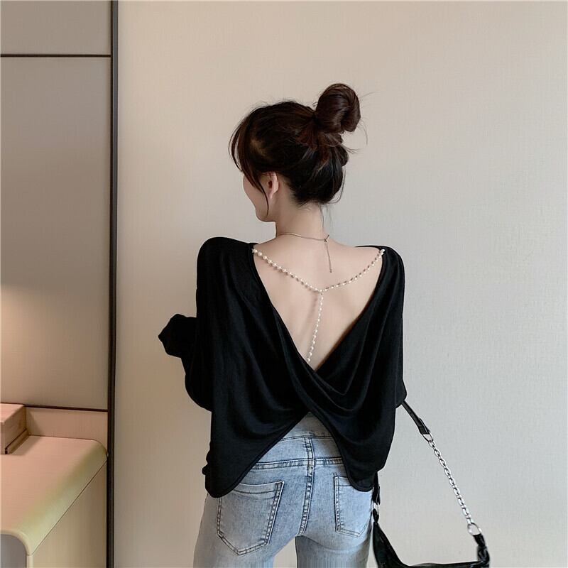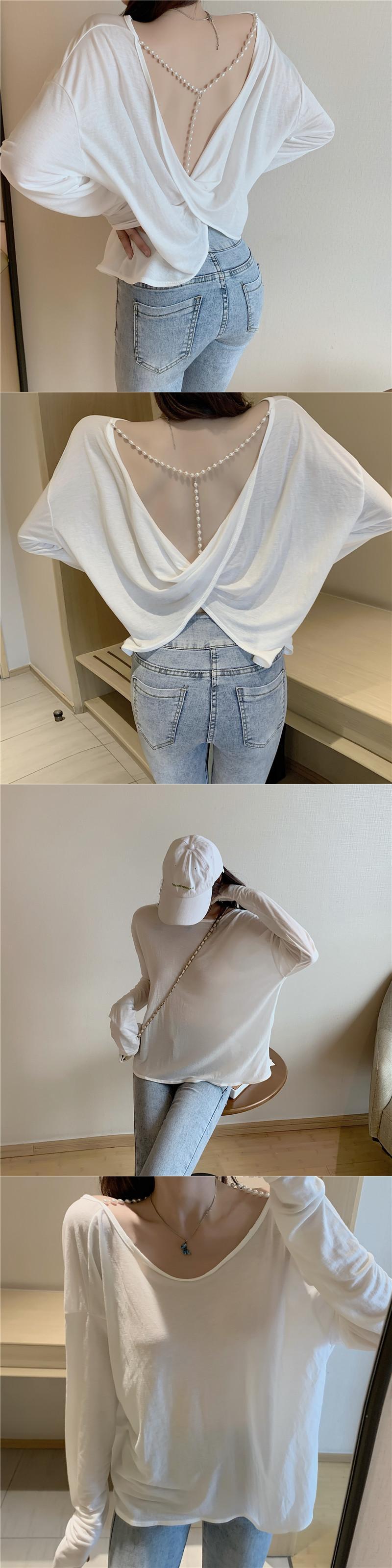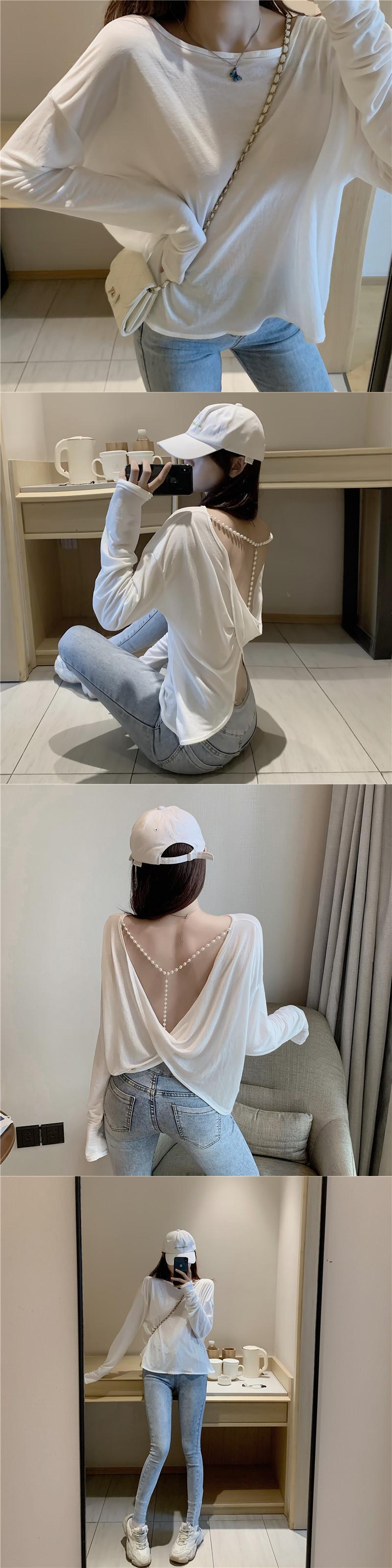 スプリングカジュアルルーズ薄手スタイルホルターパール長袖スリーブTシャツ トップス レディース ロング 春物 真珠 YY-ファッション69342819621