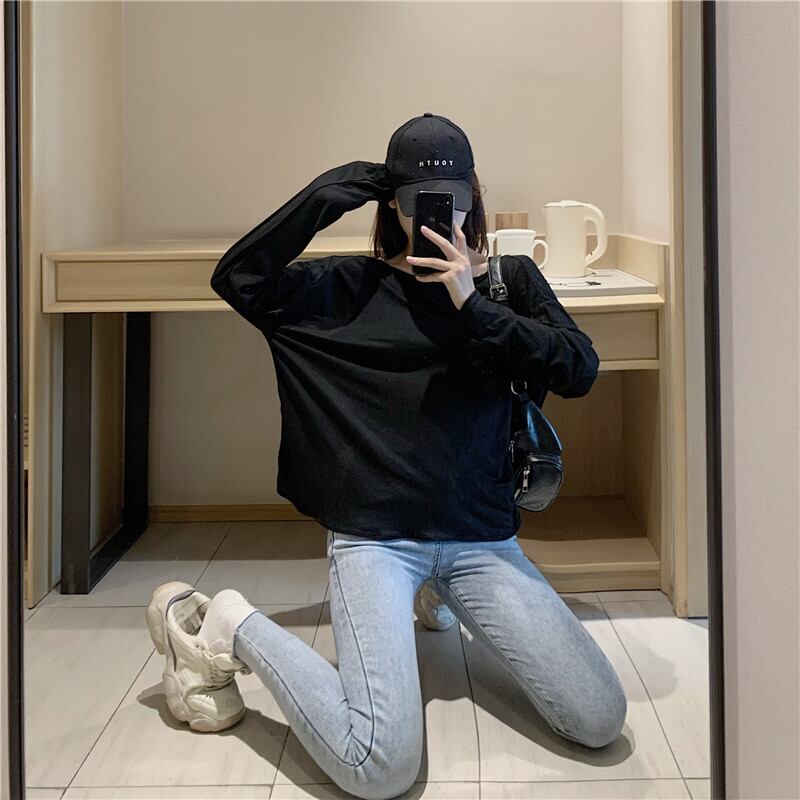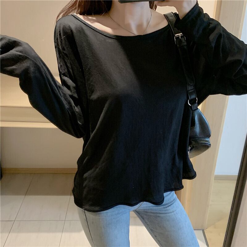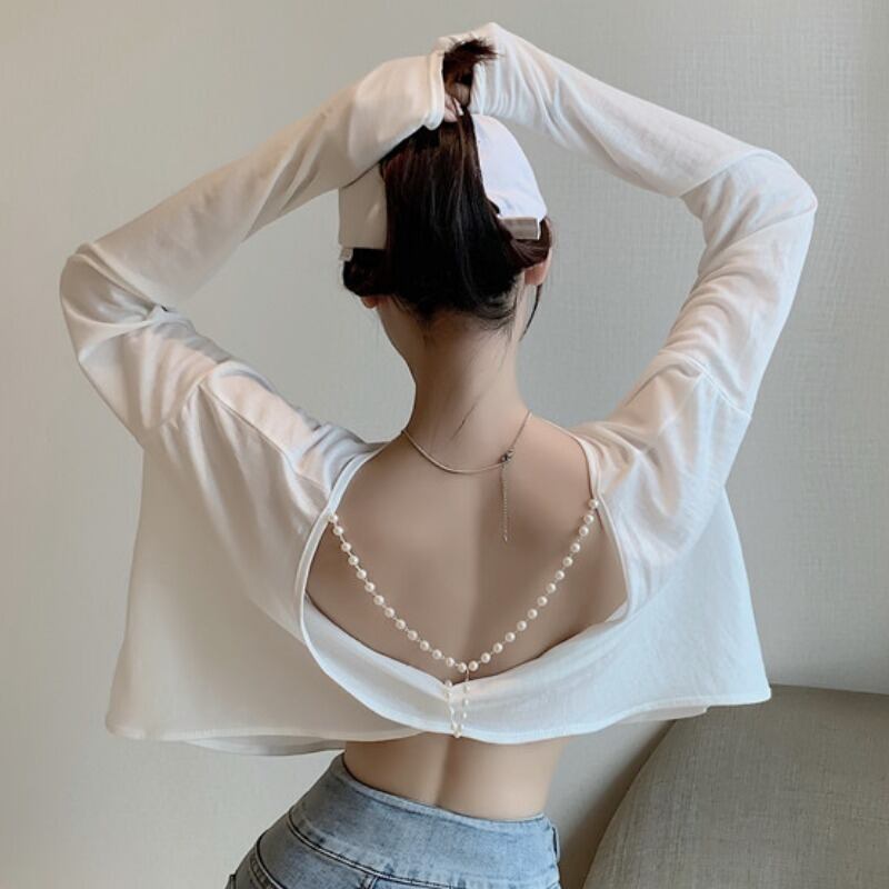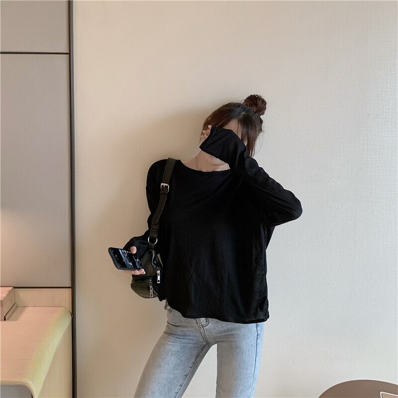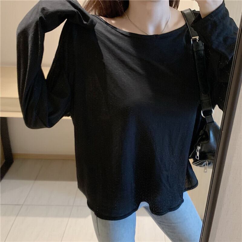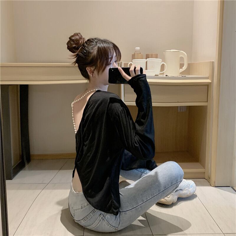スプリングカジュアルルーズ薄手スタイルホルターパール長袖スリーブTシャツ トップス レディース ロング 春物 真珠 YY-ファッション69342819621
