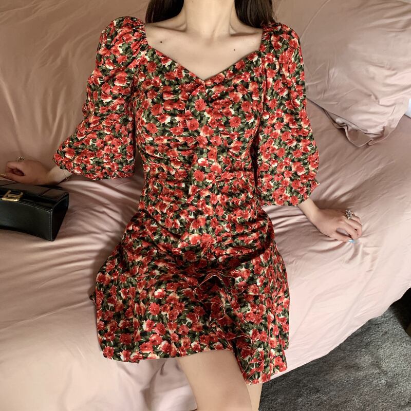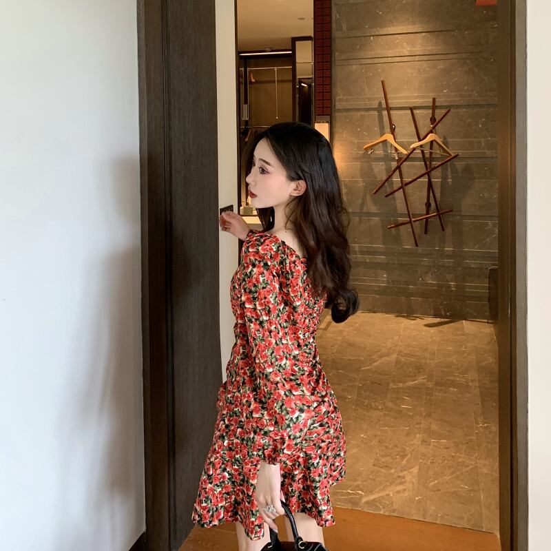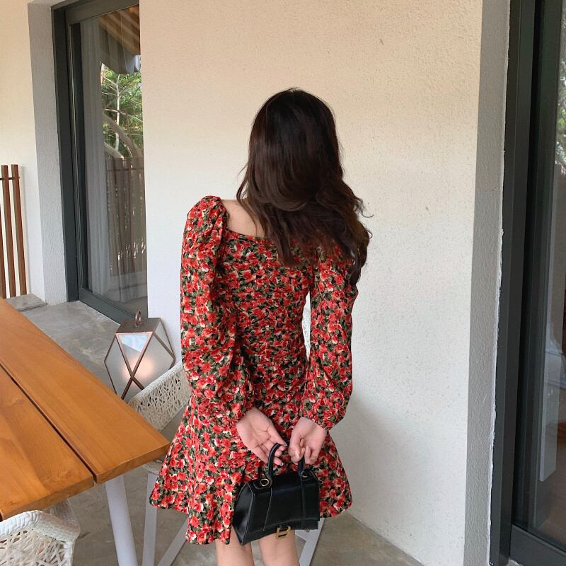 薄手Aラインオータムウィンタースタンダードフローラルショートスカート ロング レトロ 秋物 冬物 花柄 Vネック YY-ファッション98397765761