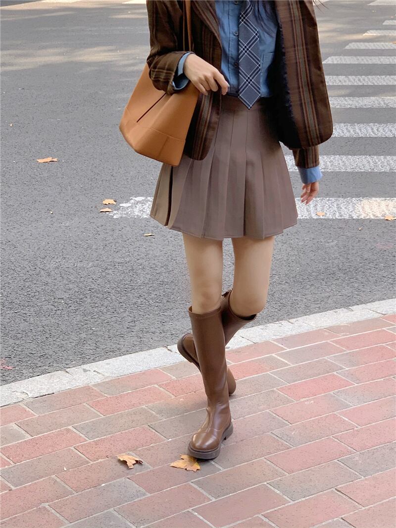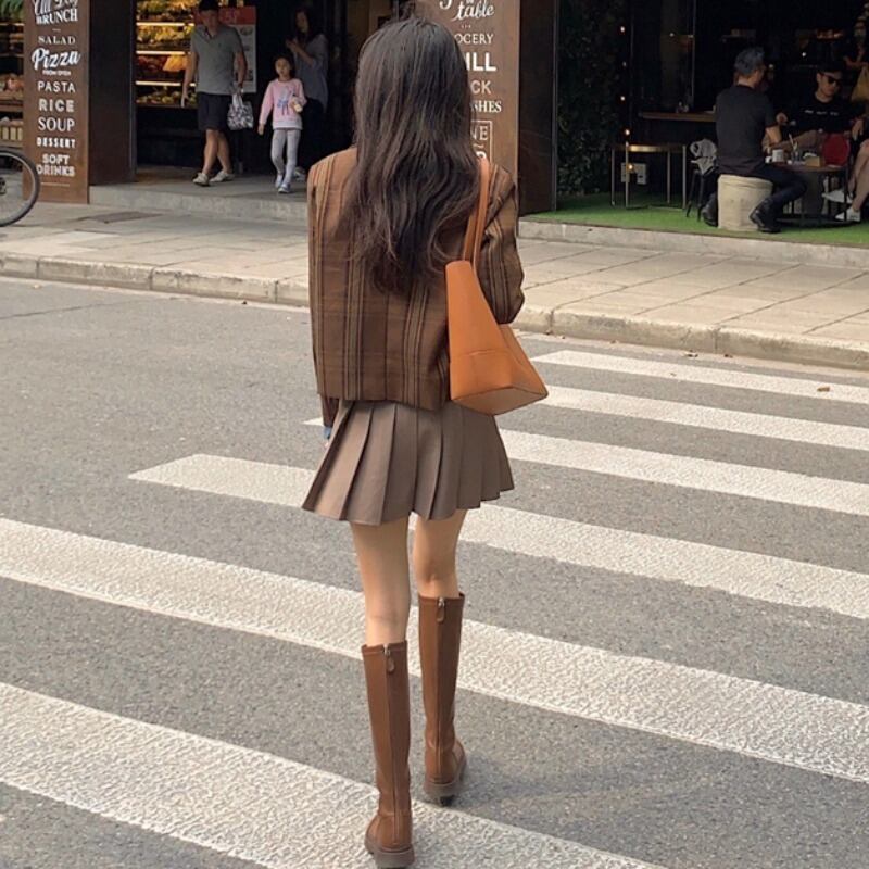 スプリング格子柄ゴールドボタンブルーシャツ プリーツショートスカート 春物 YY-ファッション14626863242