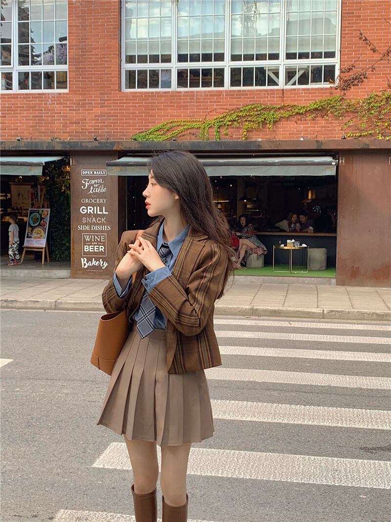 色:汚れた青いシャツ(ネクタイを送る),モカスカート,チェック柄ブレザー