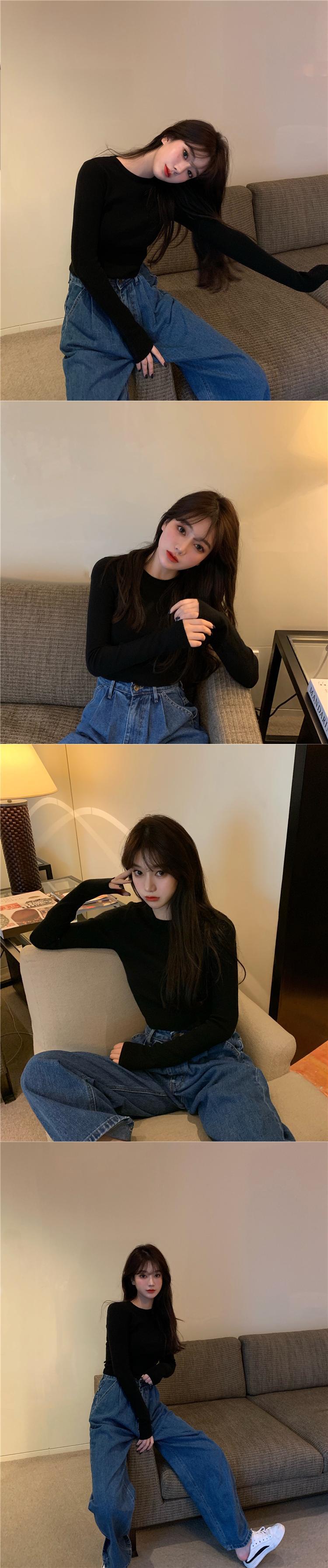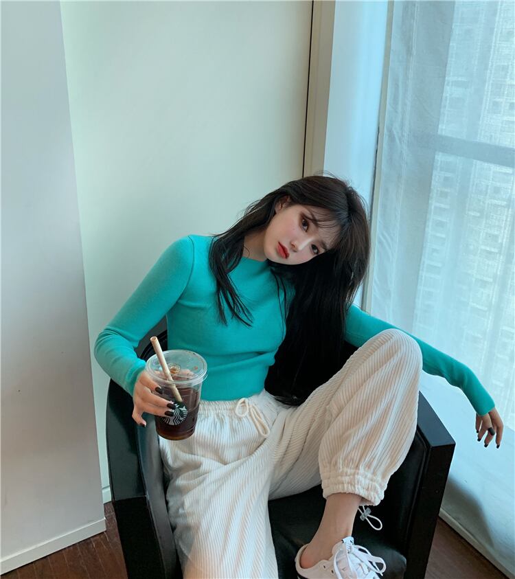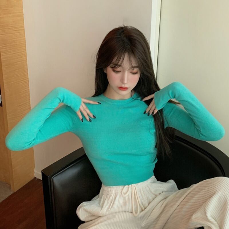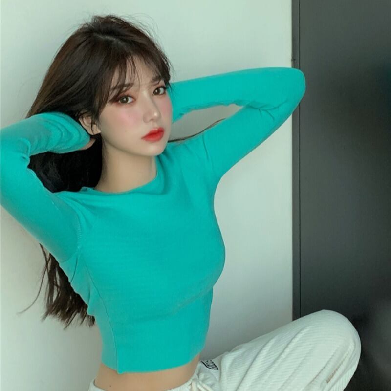 ショートラウンドネッククロップドハイウェストシャツ スリムトップス スプリング 春物 Oネック YY-ファッション40319391494