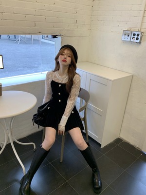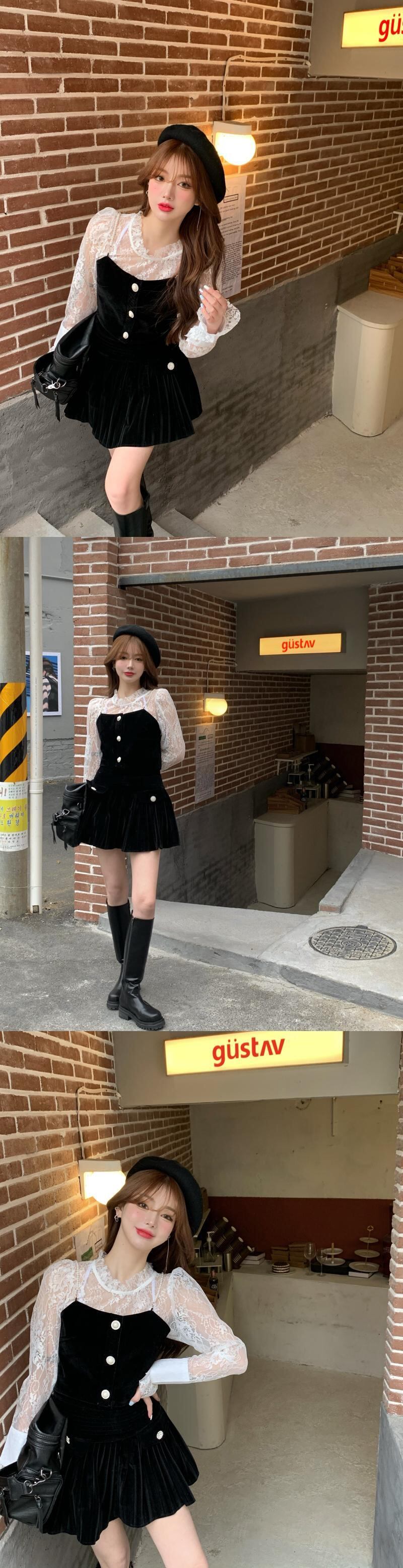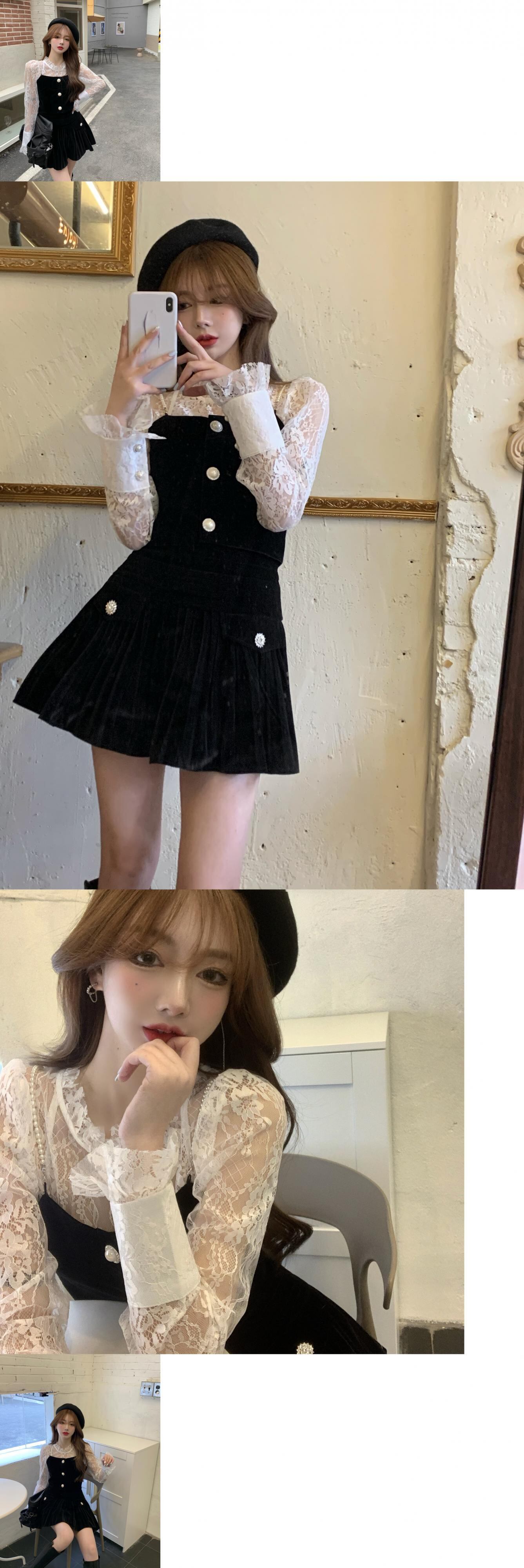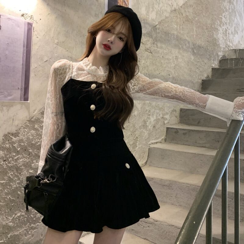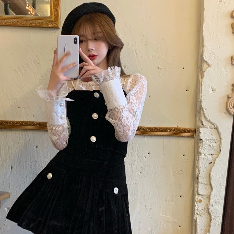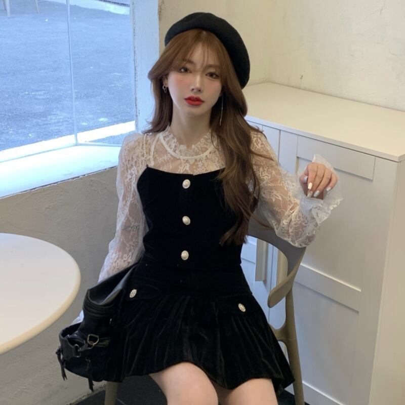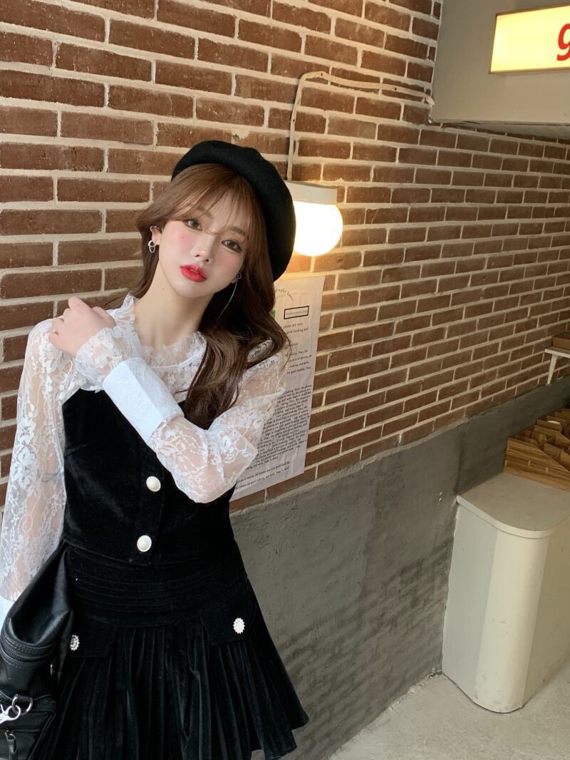 オータムウィンタースタイルVネックレースシャツ ベルベットハイウェストウェストプリーツスカート レディース 秋物 冬物 YY-ファッション32390481510