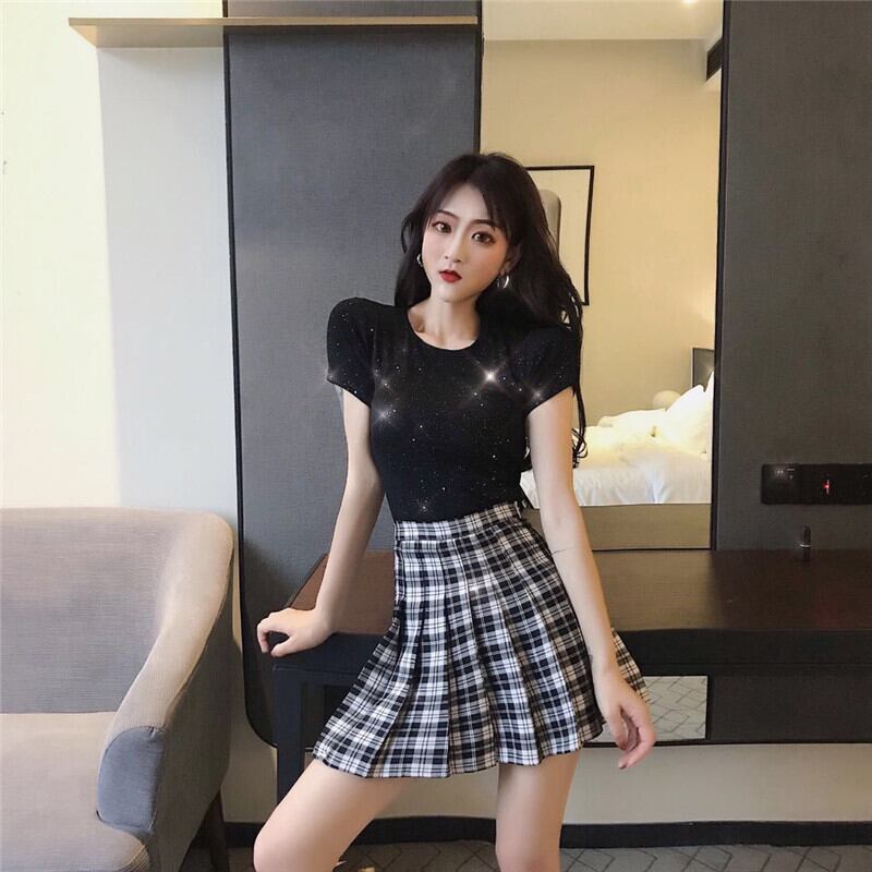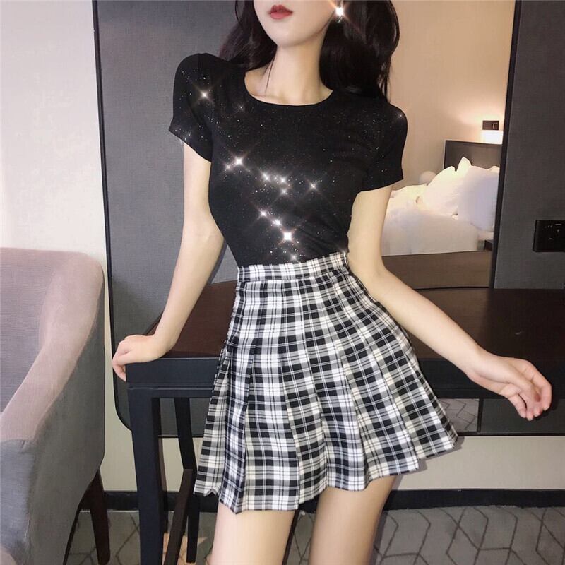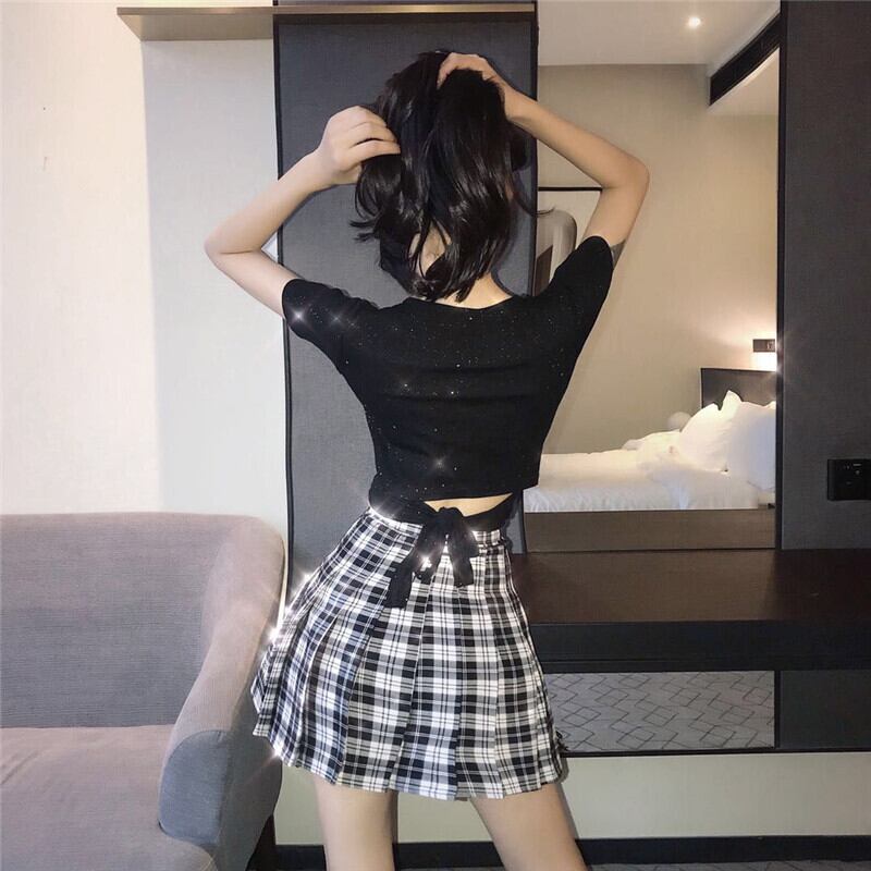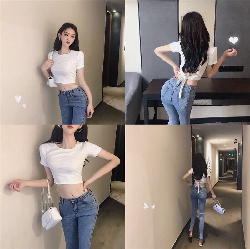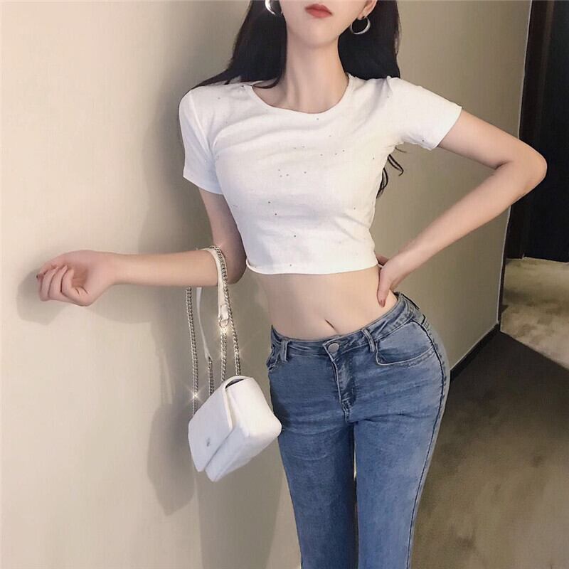 バックラウンドネックショート半袖スリーブTシャツ レディーススプリングハイウェストウェストスリムトップス ハーフスリーブ 春物 Oネック YY-ファッション9771460845