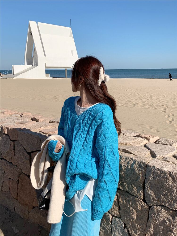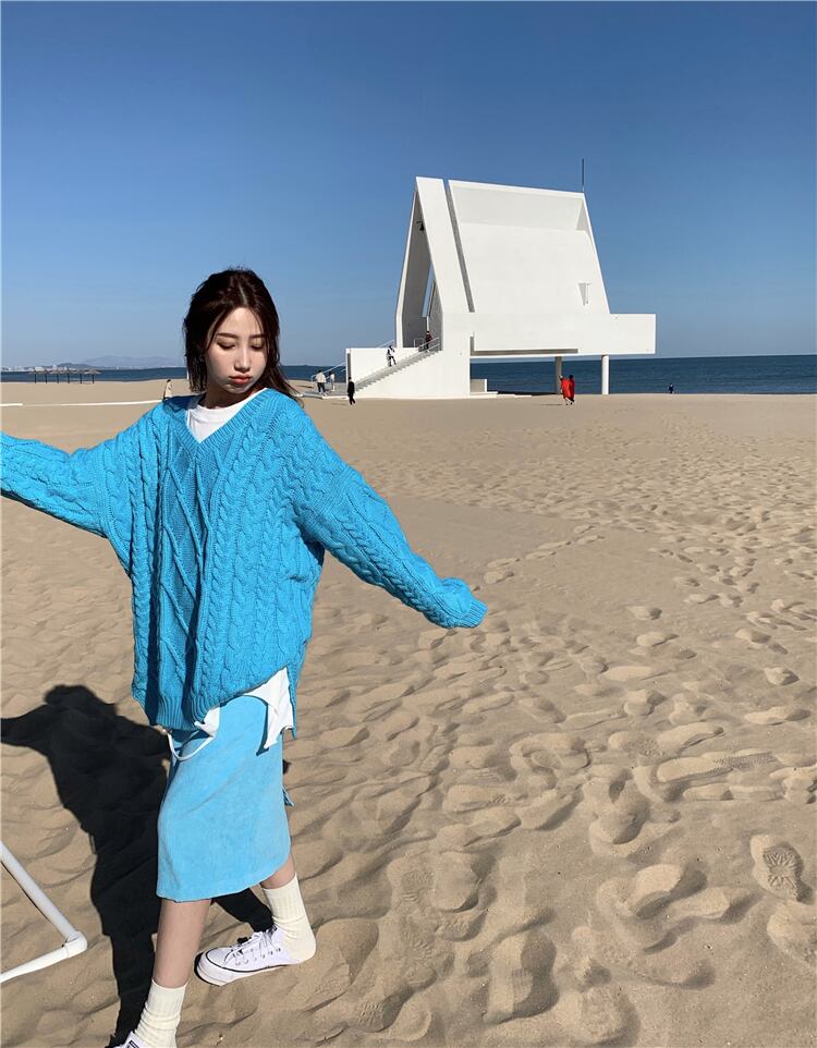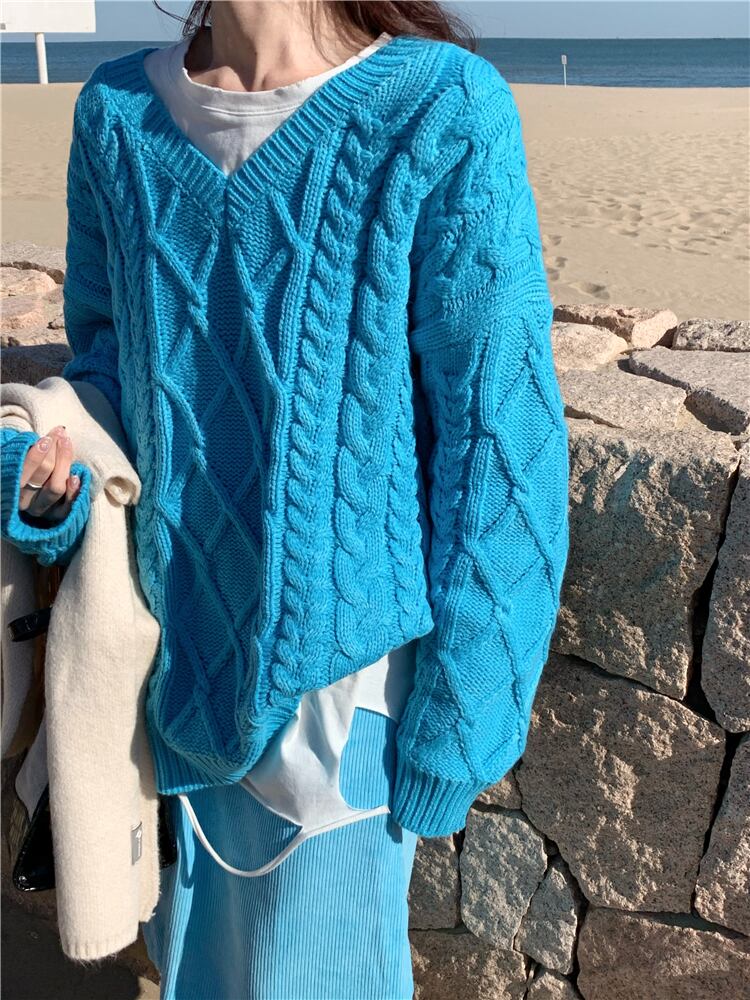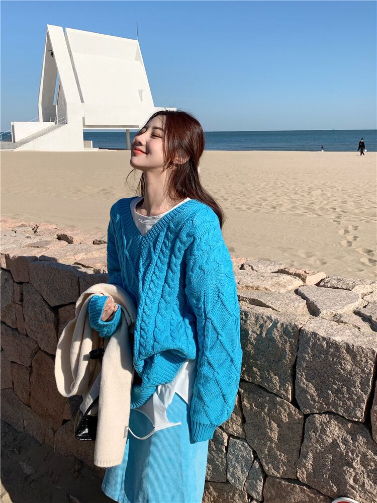 ブルーセーター スプリングルーズスタイルVネックニットトップス ロング 春物 YY-ファッション9394052394