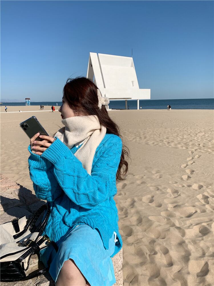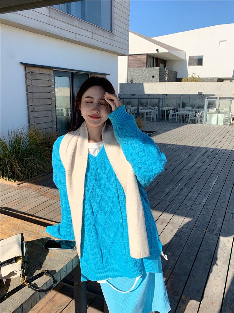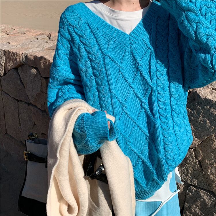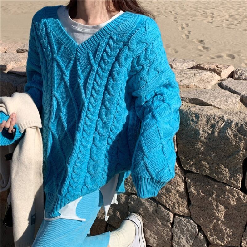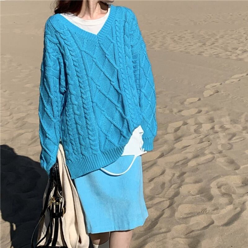 ブルーセーター スプリングルーズスタイルVネックニットトップス ロング 春物 YY-ファッション9394052394