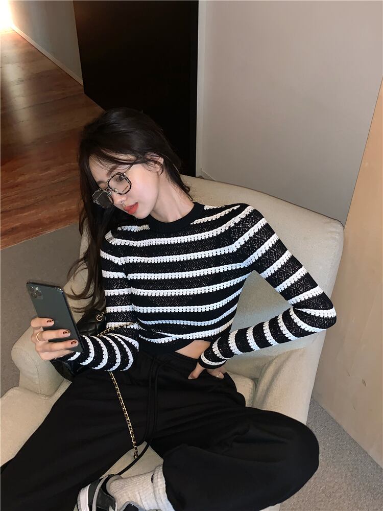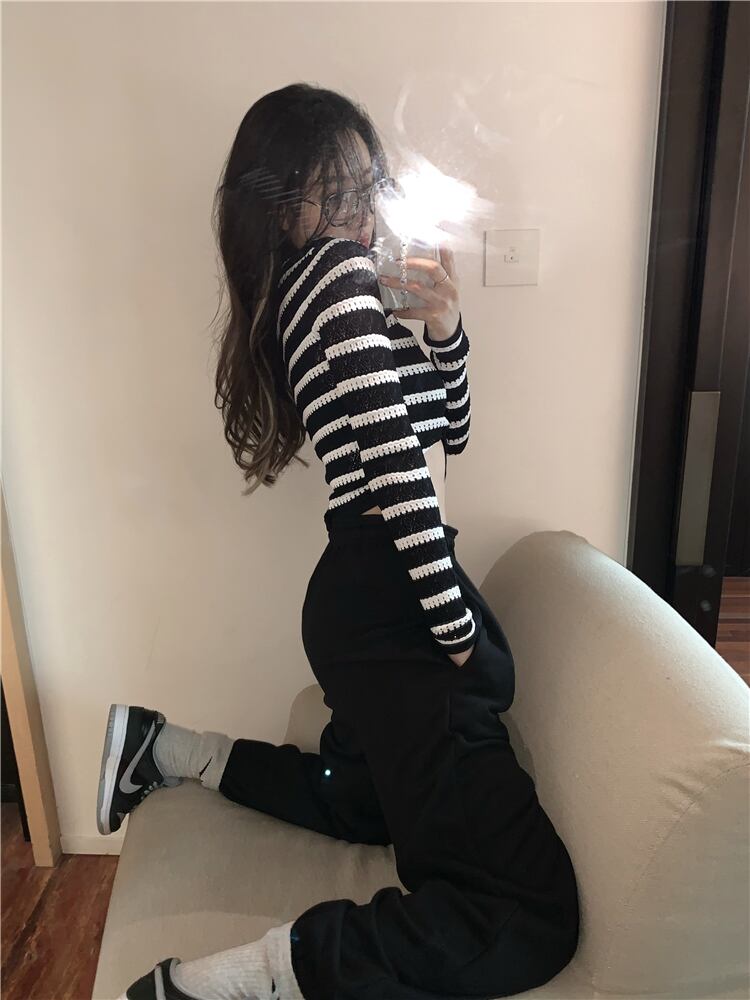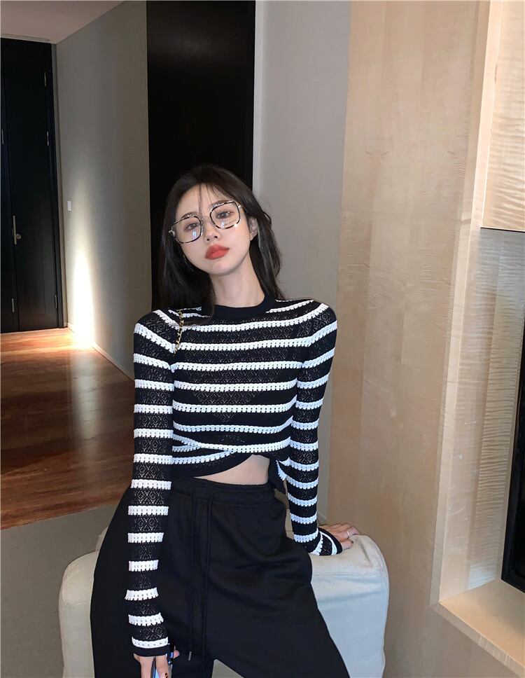 ストライプジャカードメッシュニットトップス スプリングシャツ 春物 YY-ファッション32245326209