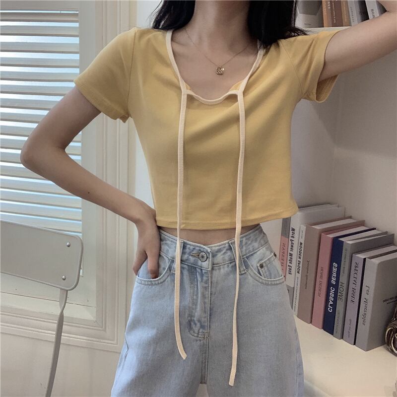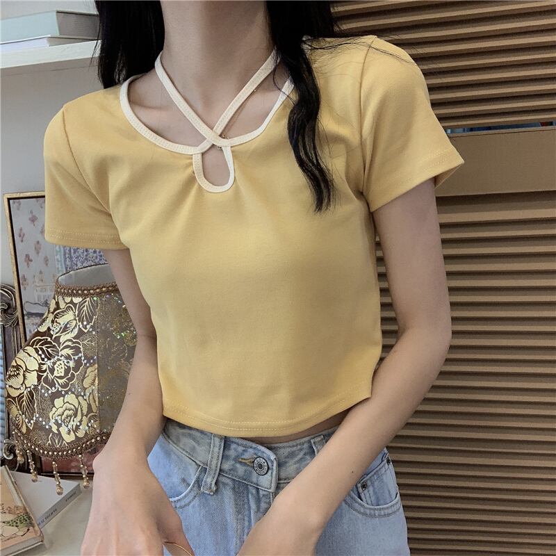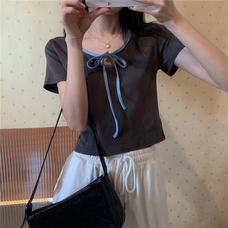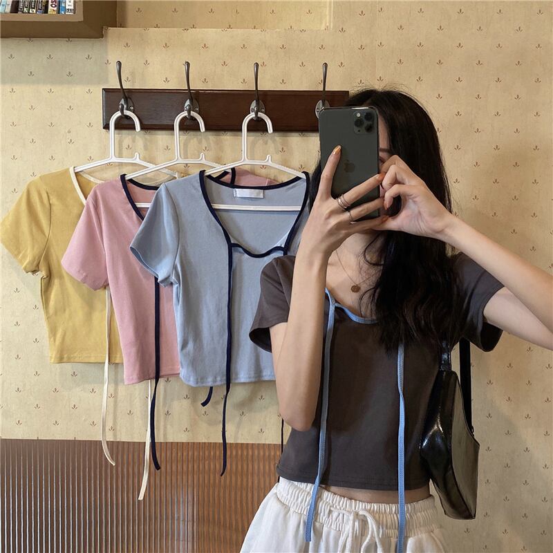 カラーレースショートサマースリムブラックTシャツ レッドトップス 夏物 YY-ファッション9689385419
