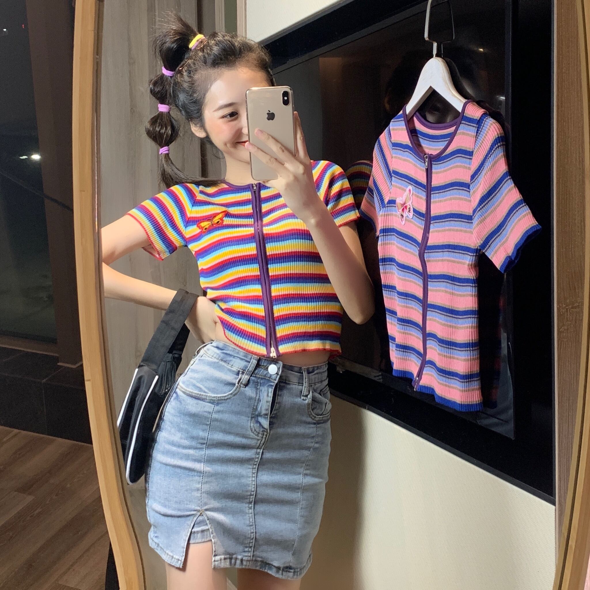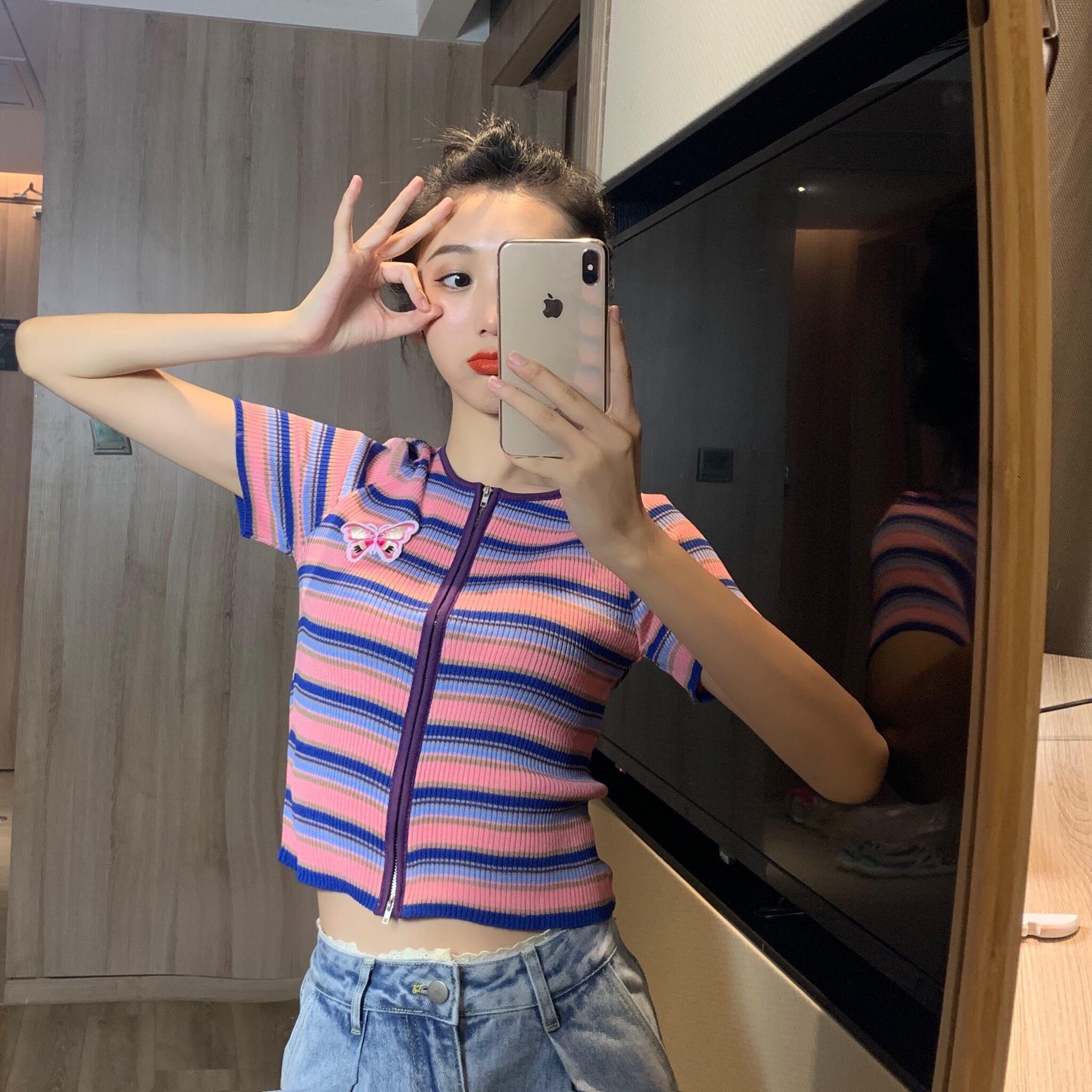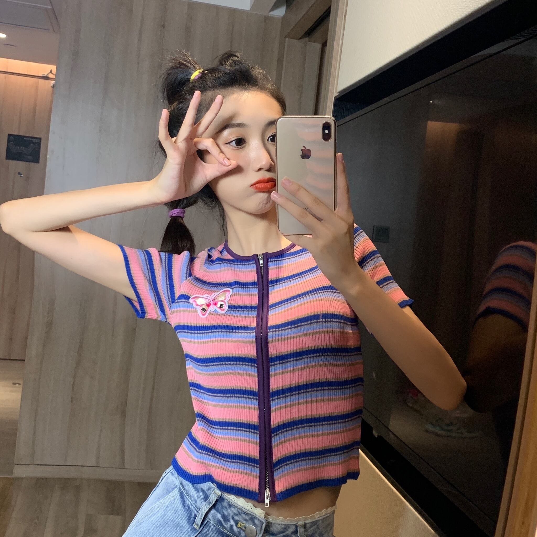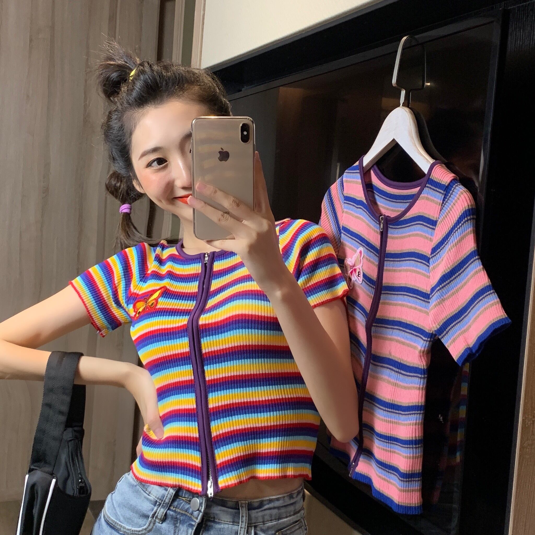 スプリングサマージッパーストライプセーター レッドTシャツ トップス 春物 夏物 YY-ファッション94531842737