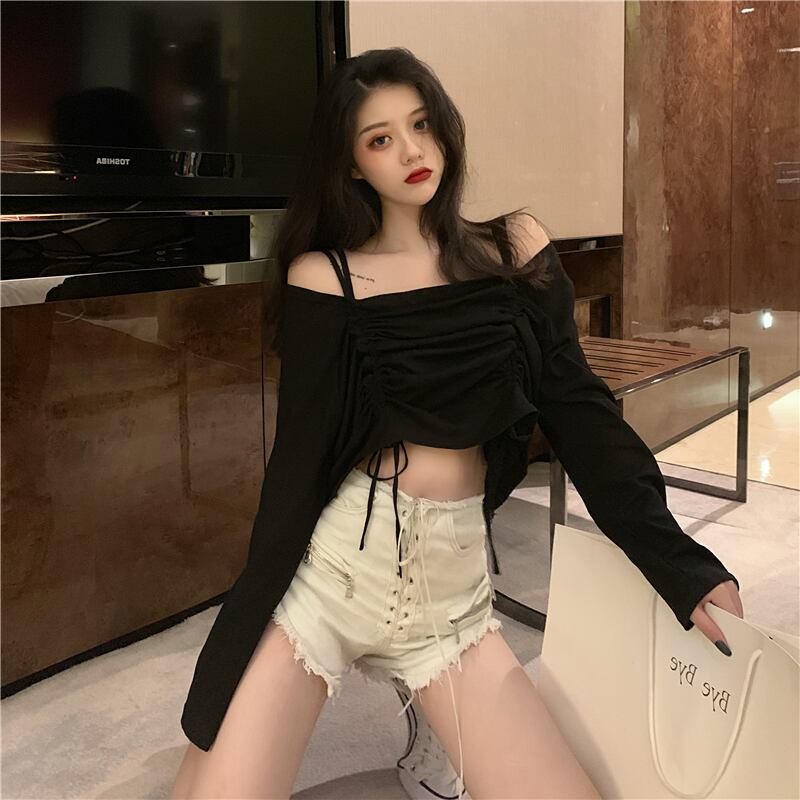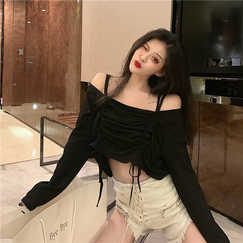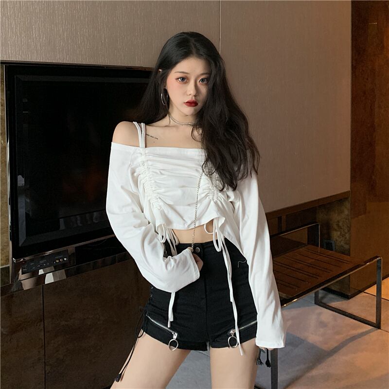 ストラップレスTシャツ スプリングスタイルスタンダードギャザーレーストップス ロング レトロ 春物 YY-ファッション17915975116