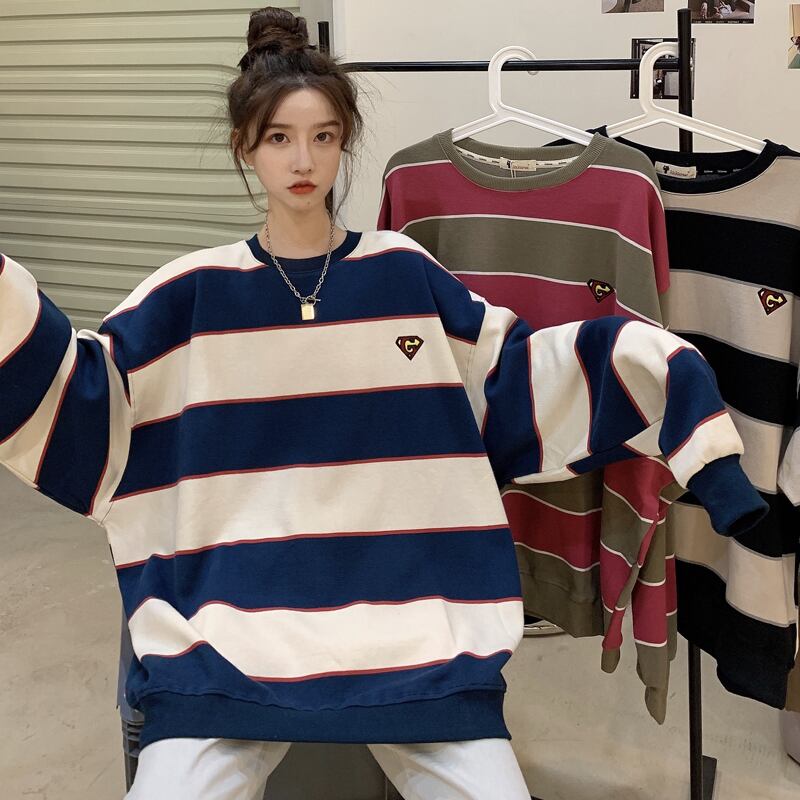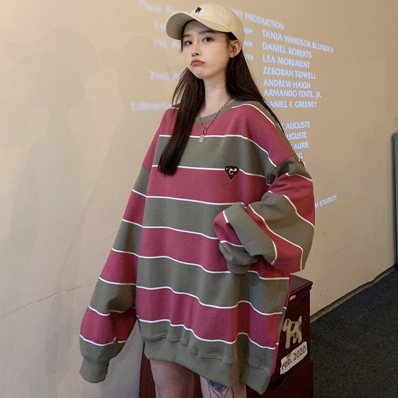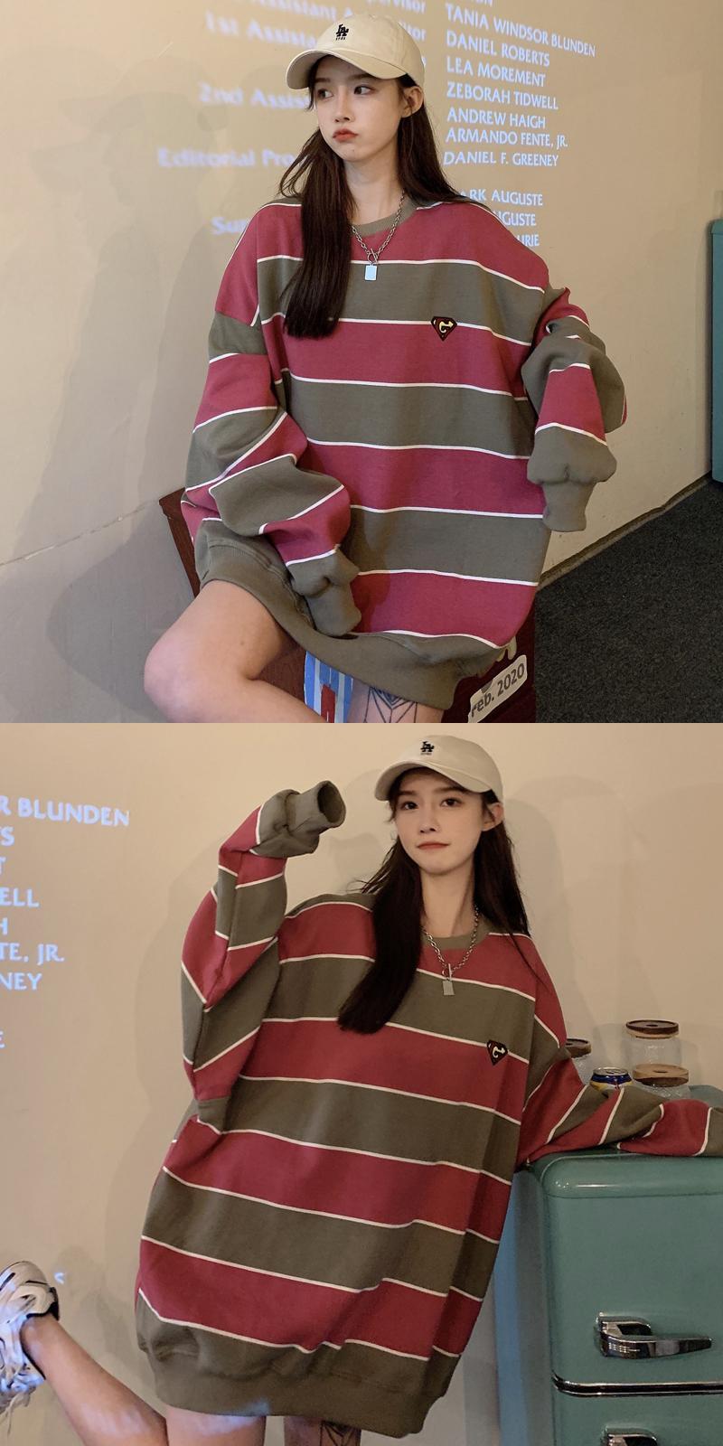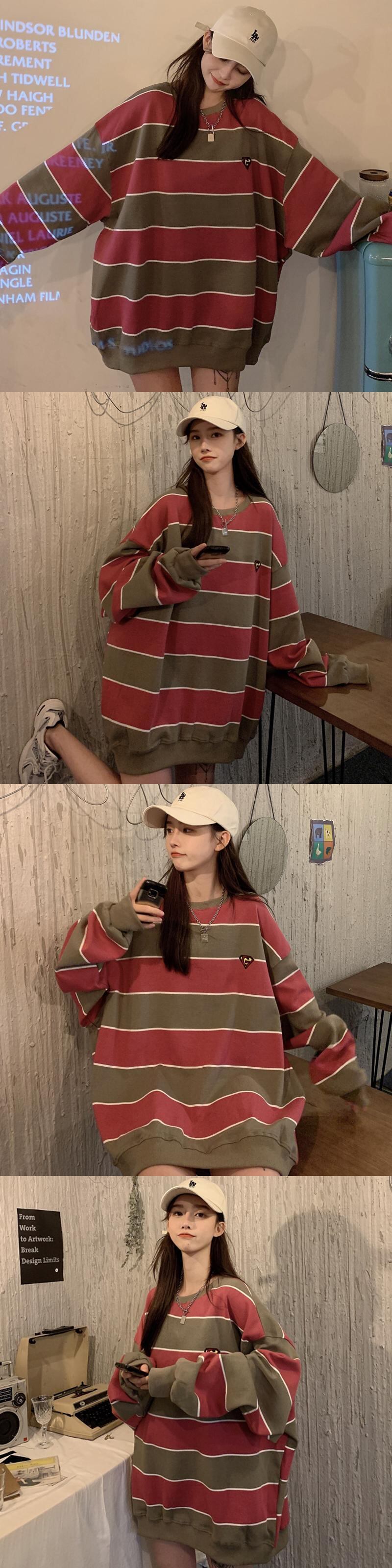 ルーズストライプセーター スプリングオータム薄手レッドトップス ロング 春物 秋物 YY-ファッション24526177648