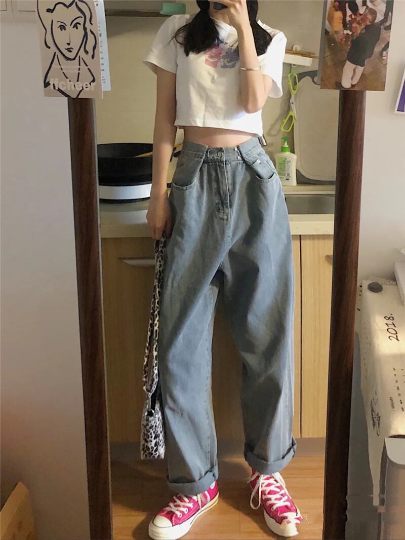 オータムウィンターレッドボタンハイウェストウェストルーズワイドレッグスタンダードジーンズ レディース レトロ 秋物 冬物 アジャスタブル ワイドパンツ YY-ファッション73927978115