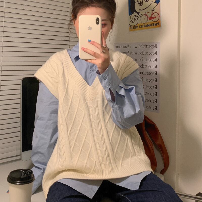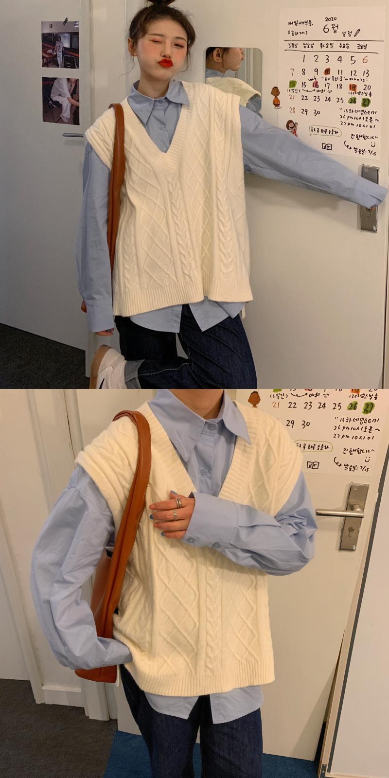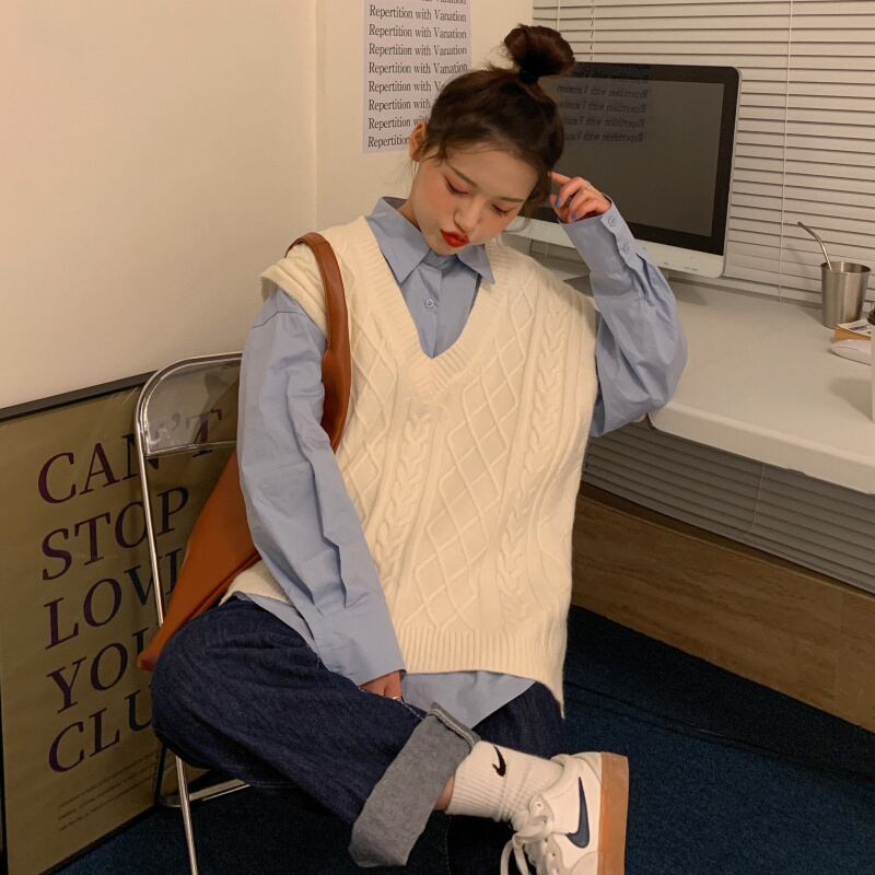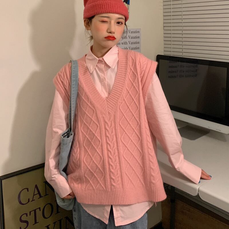 色:青いシャツ,ピンクのシャツ,ベージュのベスト,ピンクのベスト