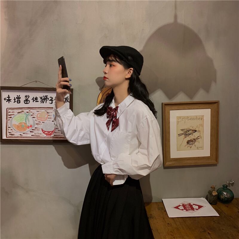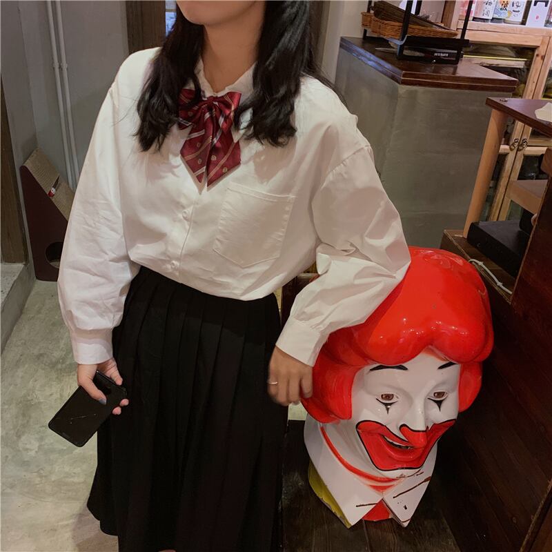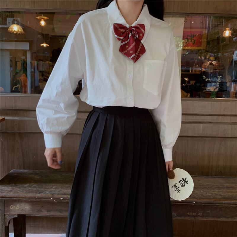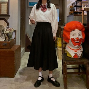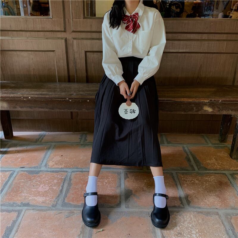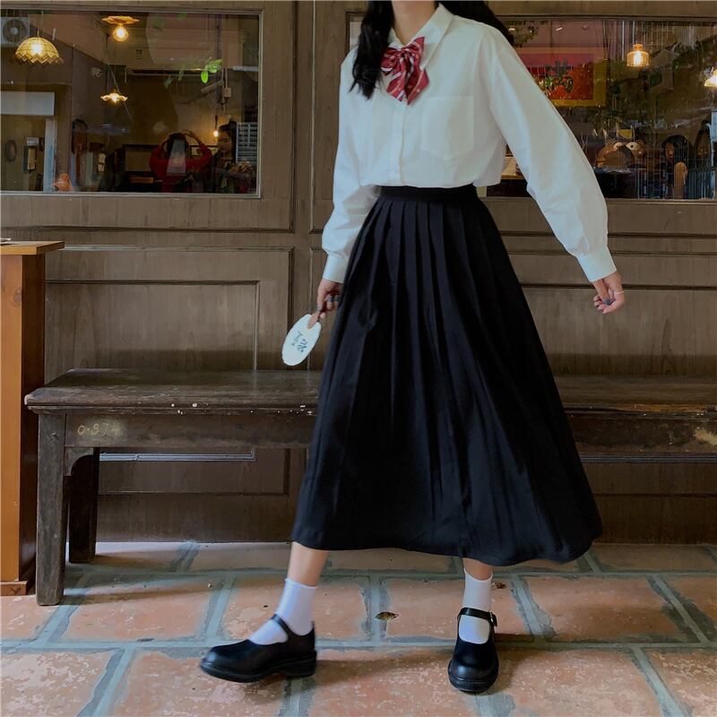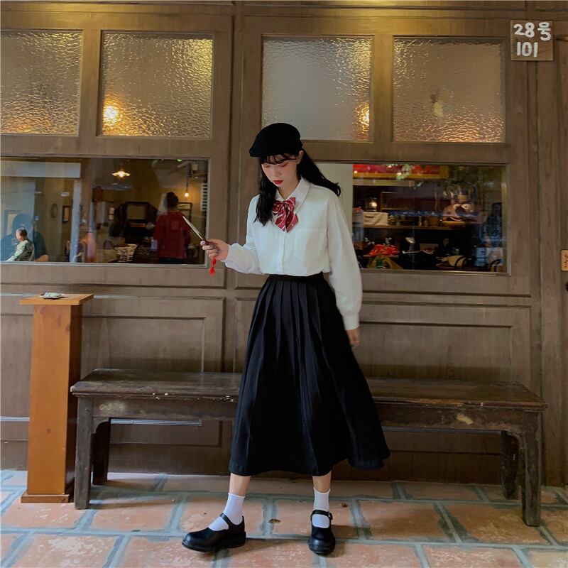 レッドホワイトシャツ リボンブラックプリーツスカート ロング YY-ファッション20448960371