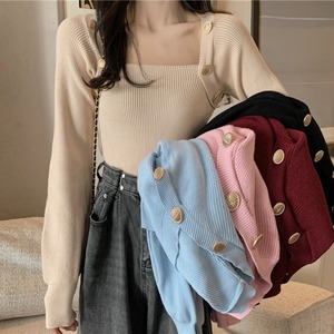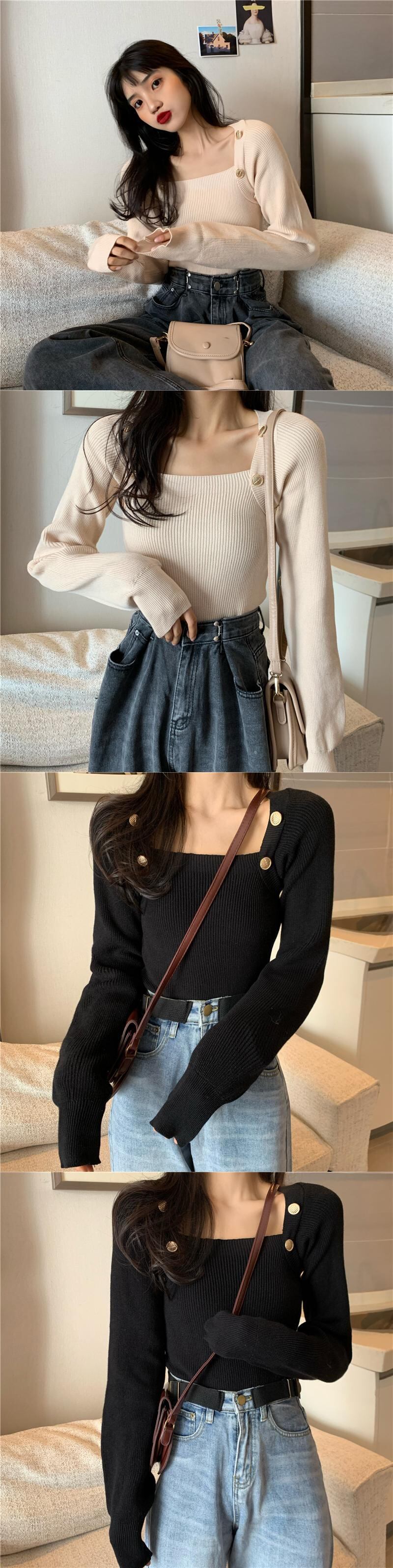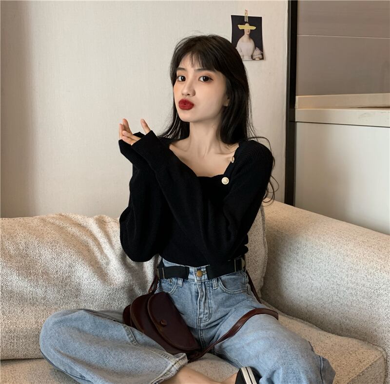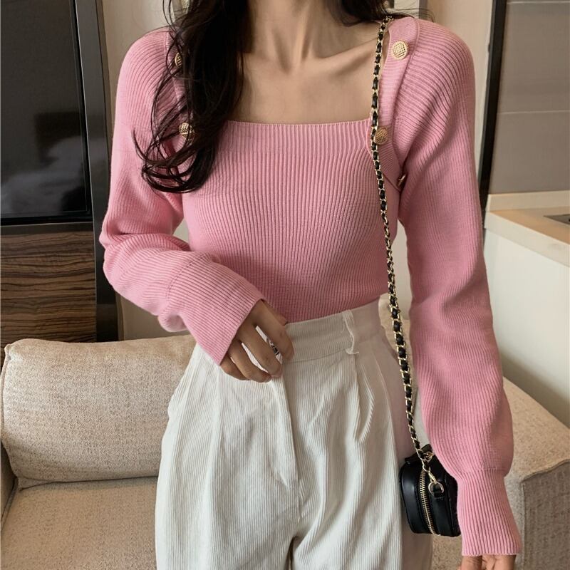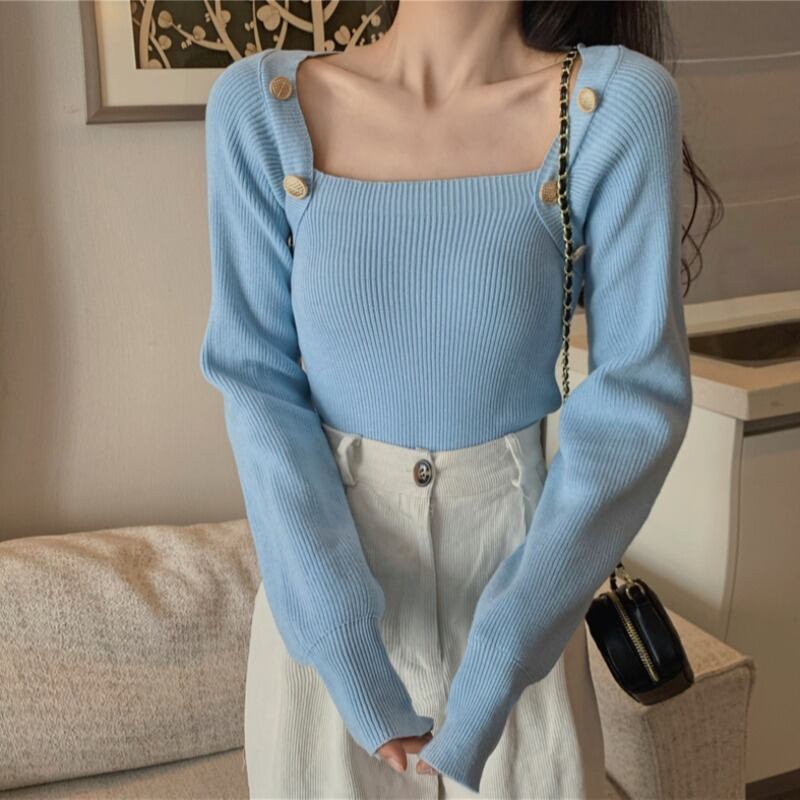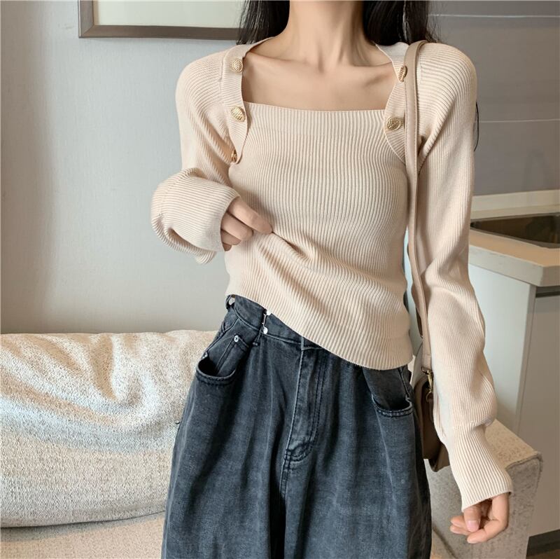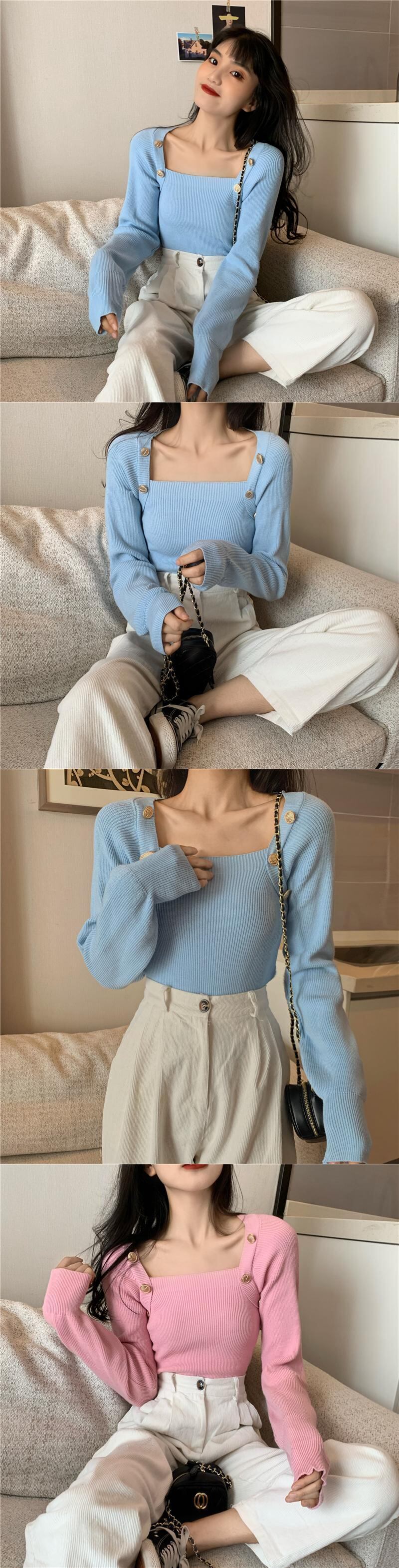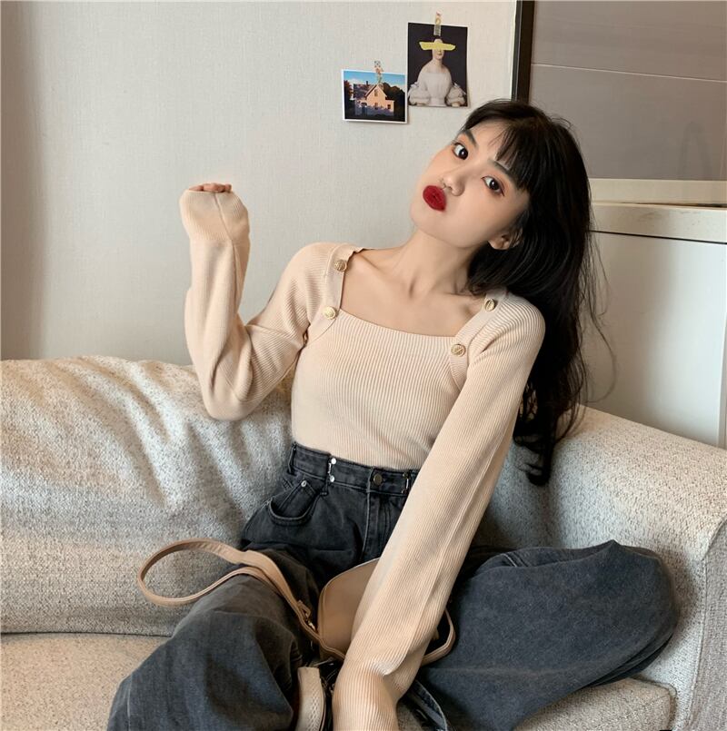 ソリッド カラーシャツ オータムウィンタースタイルニット長袖スリーブトップス ロング 秋物 冬物 ソリッドカラー スクウェア YY-ファッション97959383692