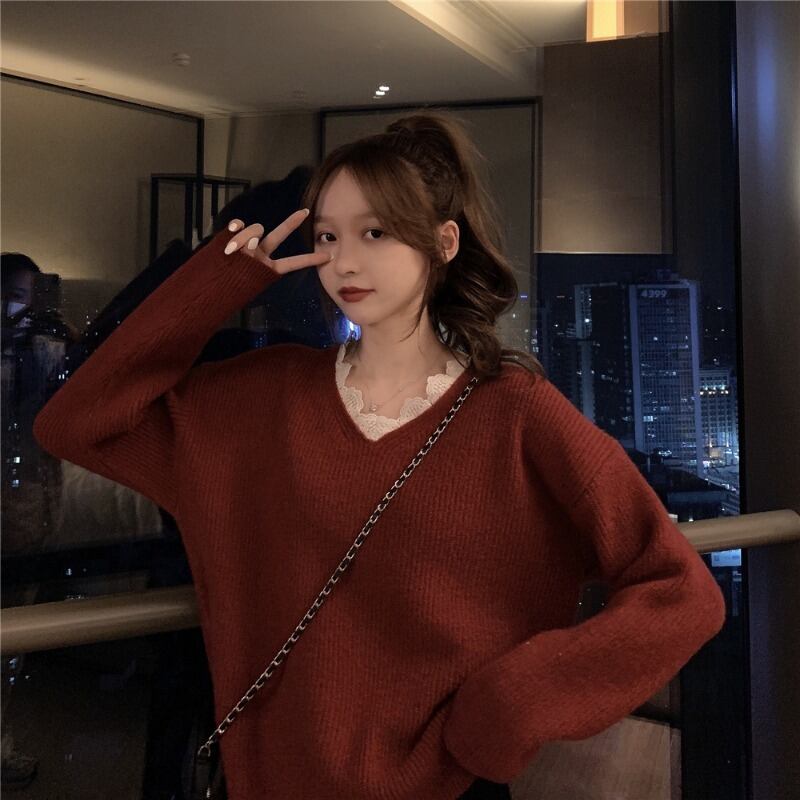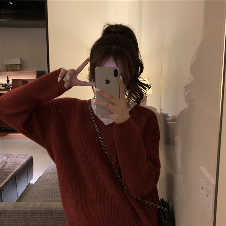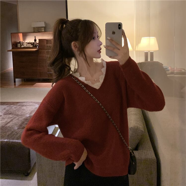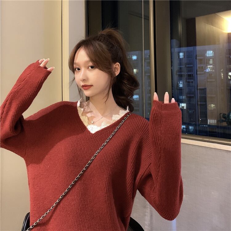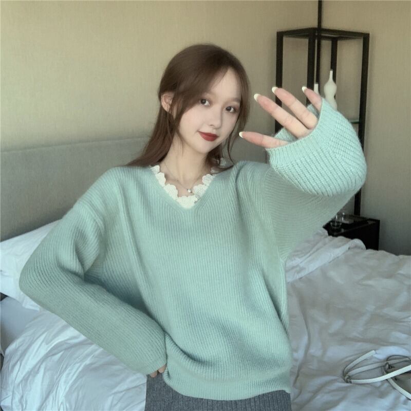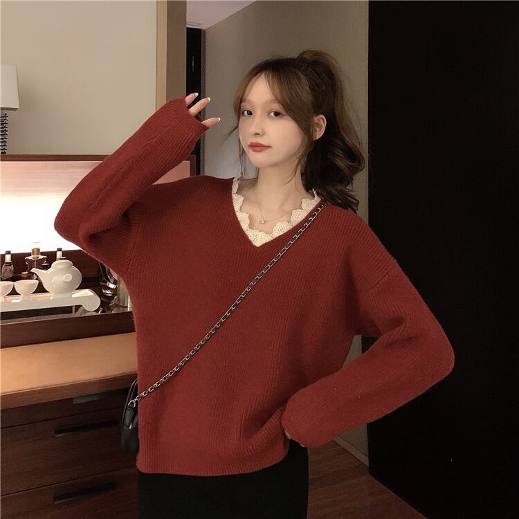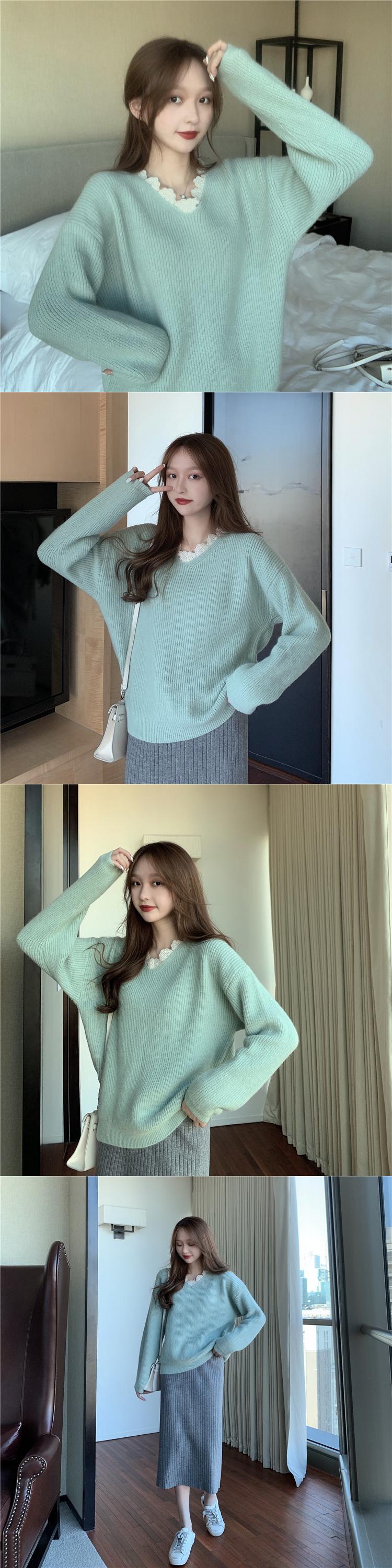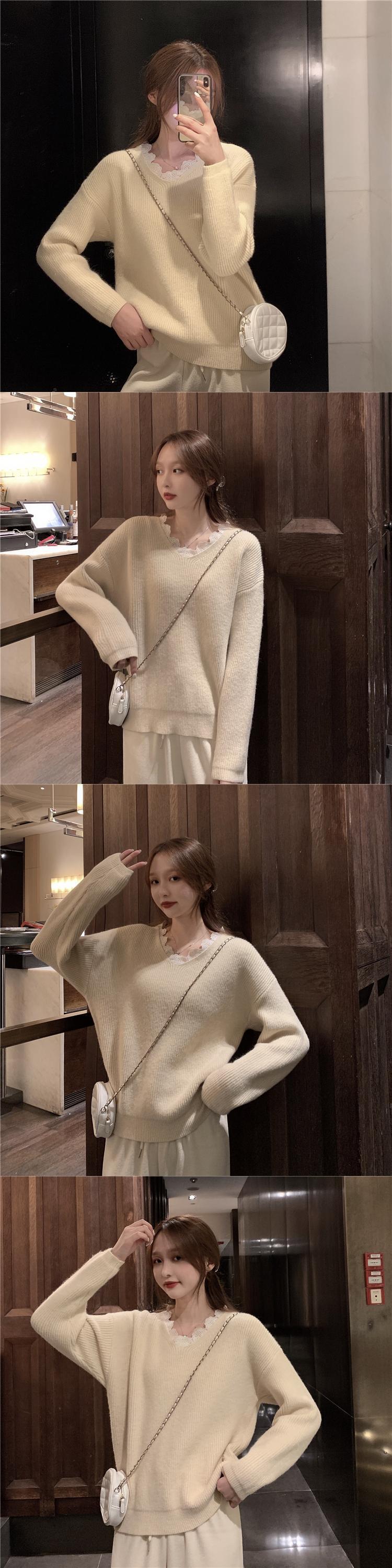 スプリングオータムルーズVネックレースセーター レディース ロング 春物 秋物 ステッチ YY-ファッション97689528883