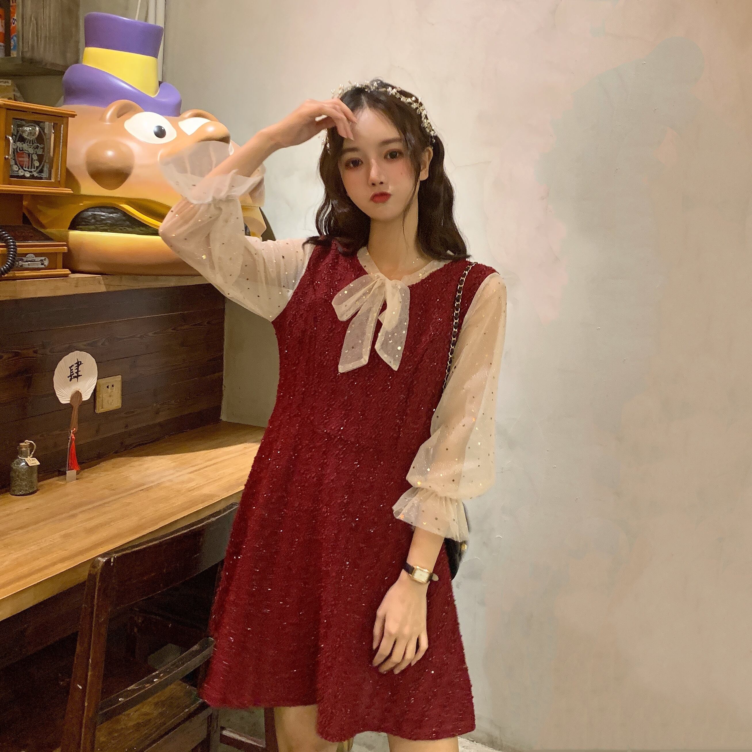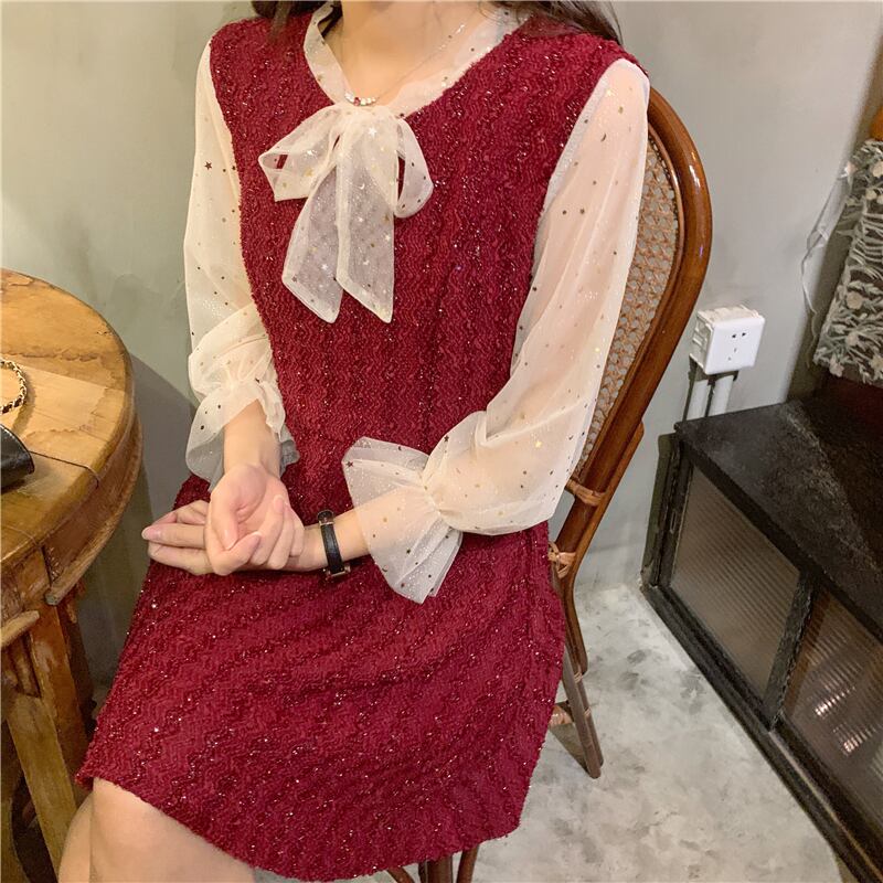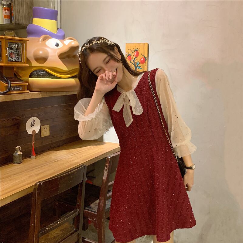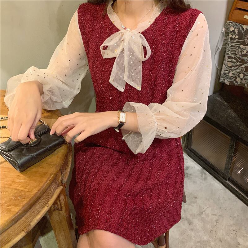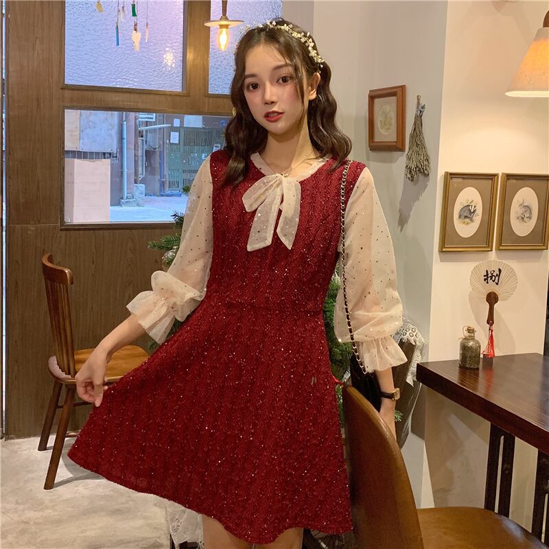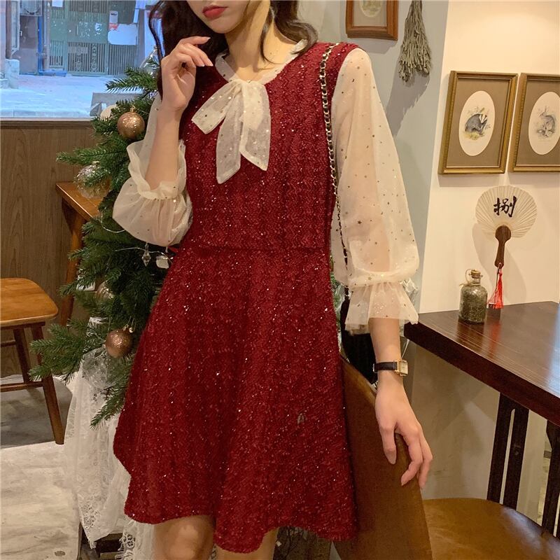 ドレス ワンピース スプリングメッシュレッドAラインスカート ロング 春物 ステッチ YY-ファッション71673622568