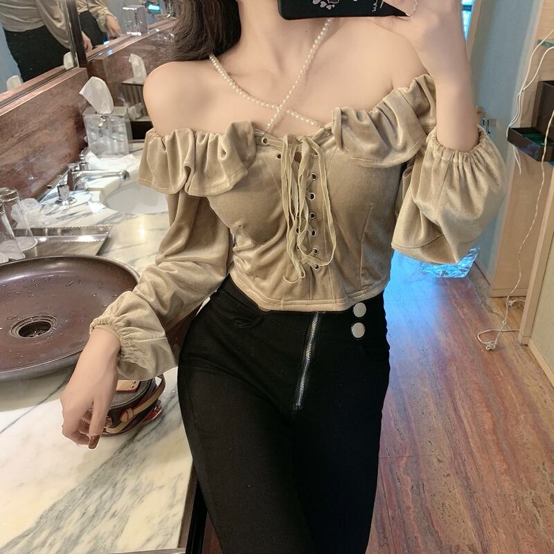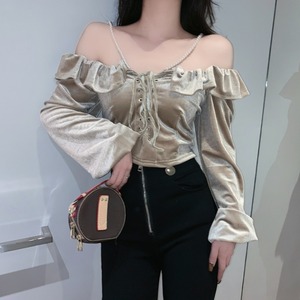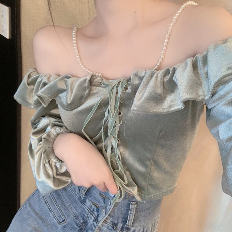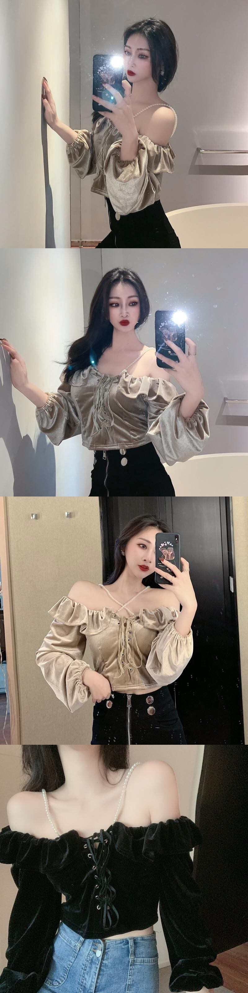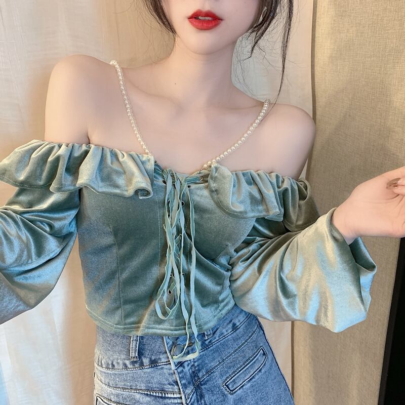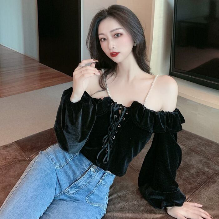 パールホルタースリーブベルベットショートTシャツ スプリングコート レディース レース 春物 レースアップ 真珠 YY-ファッション50617076474