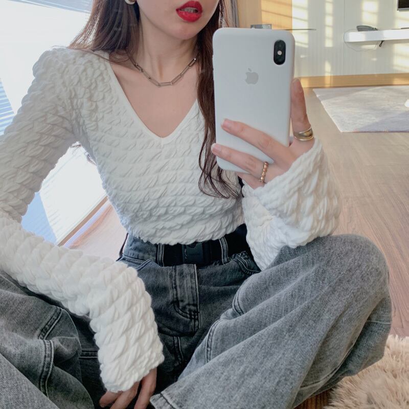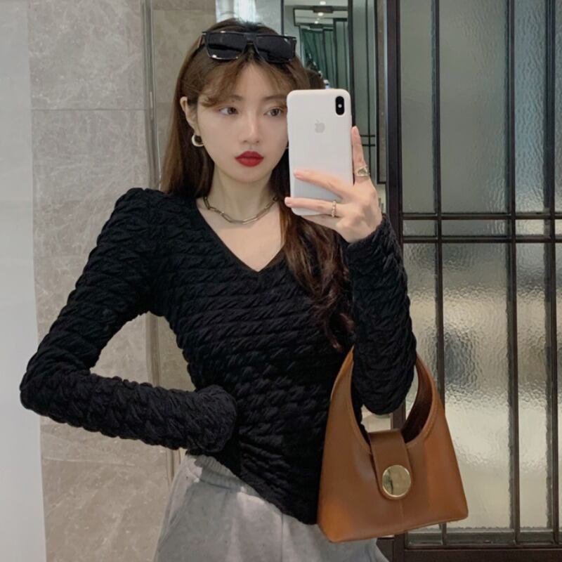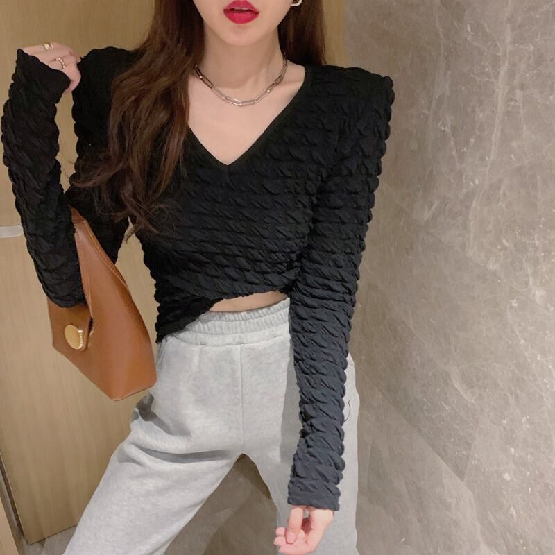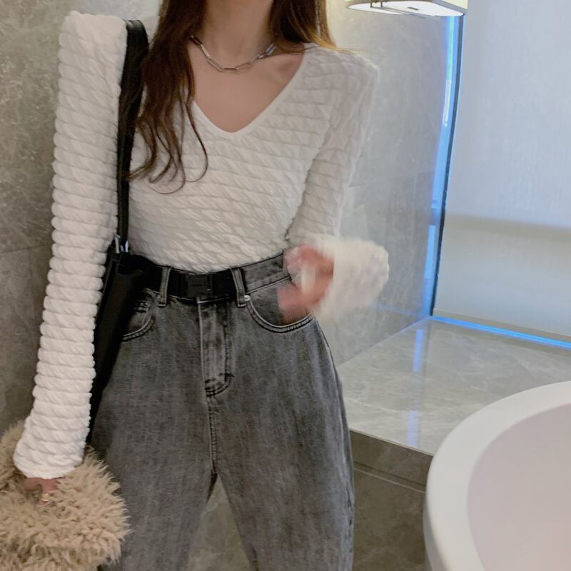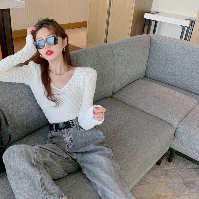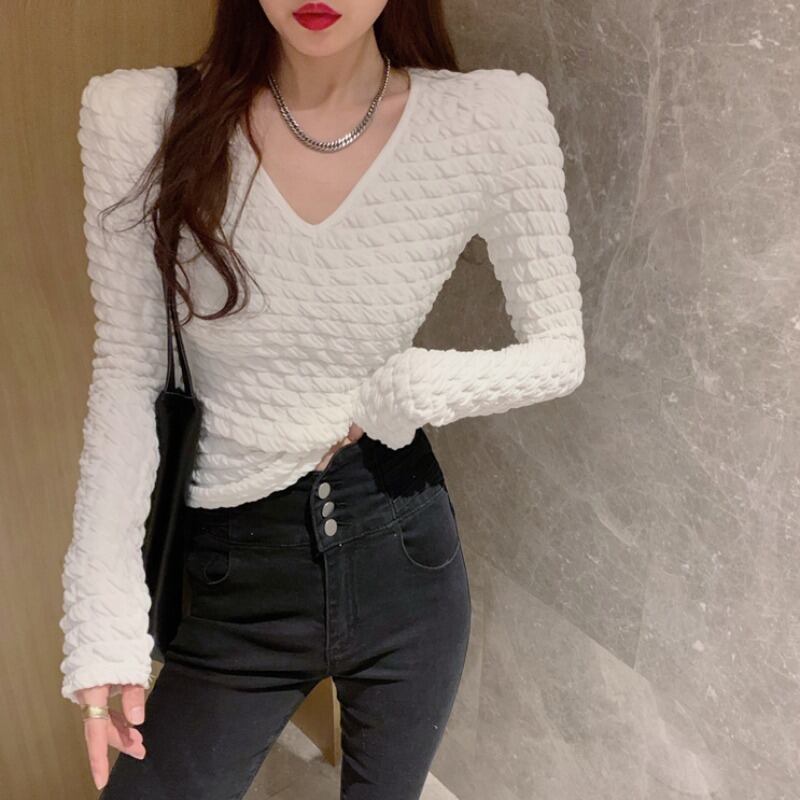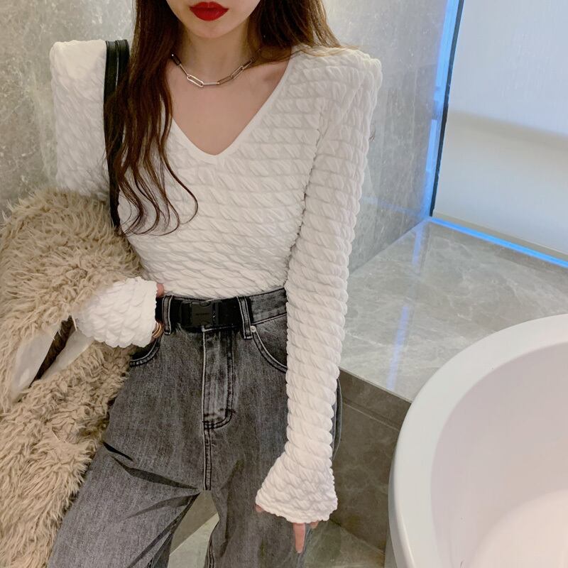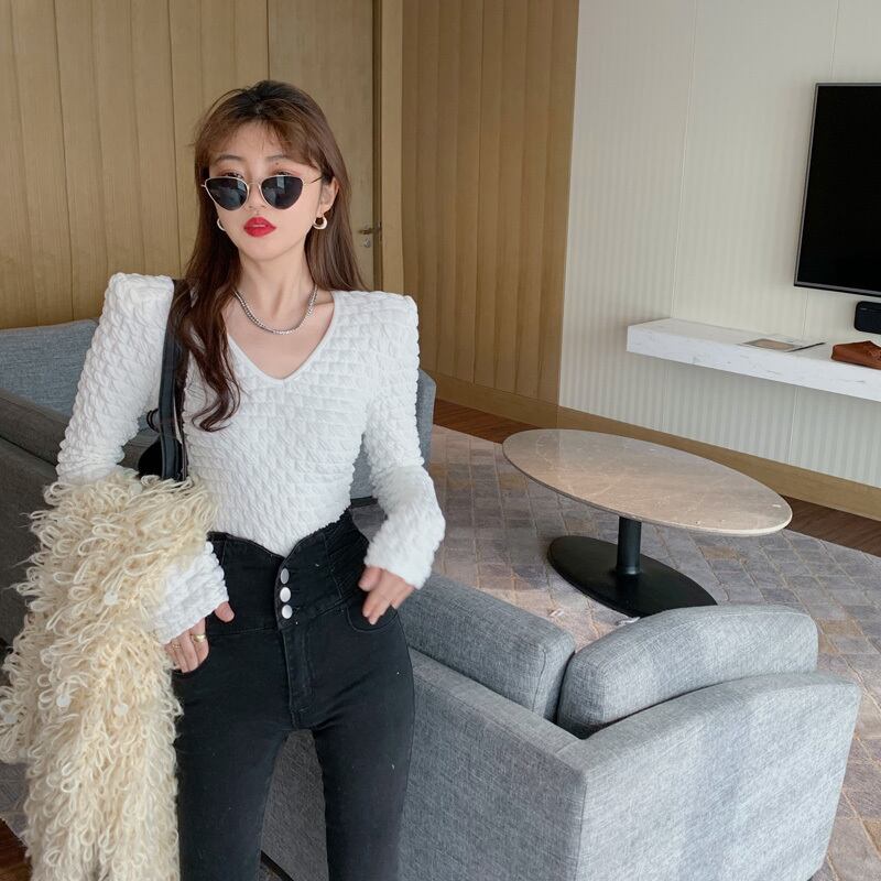 シャツ オータムウィンタースリムホワイトVネックスタイルショートTシャツ トップス ロング 秋物 冬物 YY-ファッション94860406331