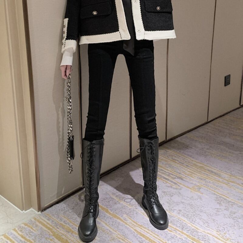 ハイウェスト薄手ストレッチブラックパンツ オータムウィンターロング エラスティック 伸縮 秋物 冬物 YY-ファッション29219351559