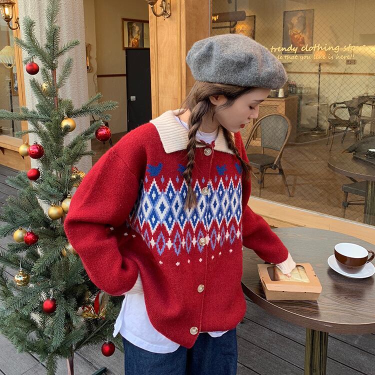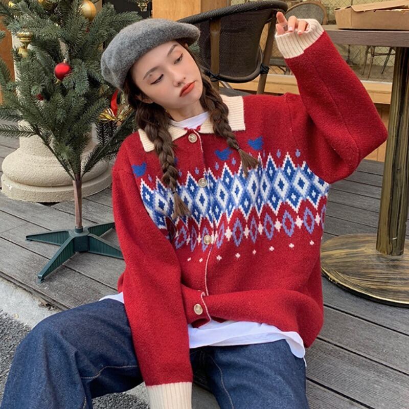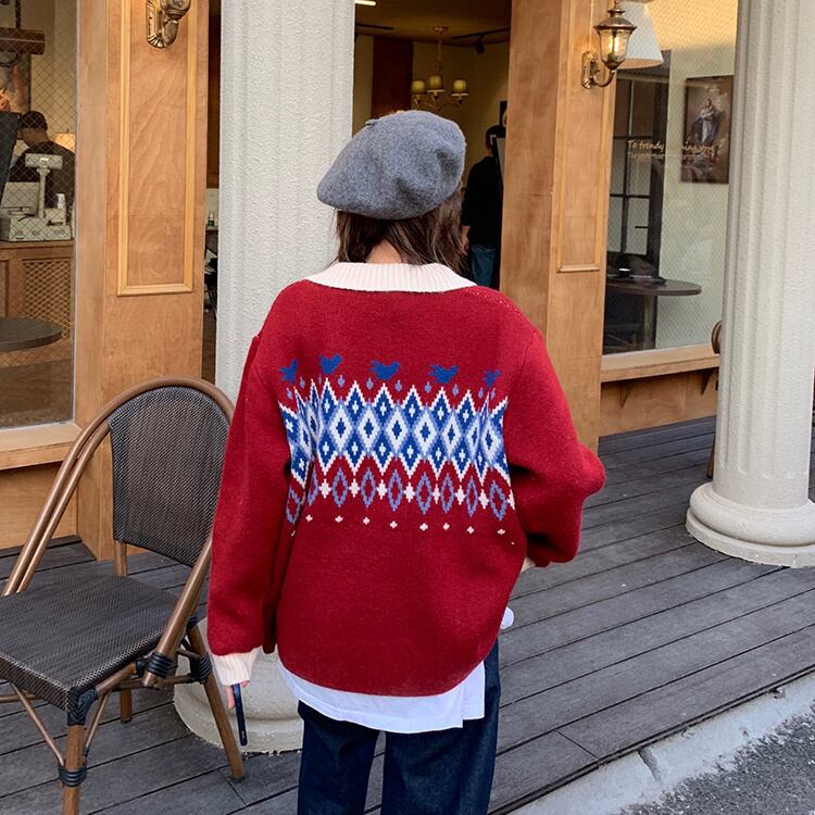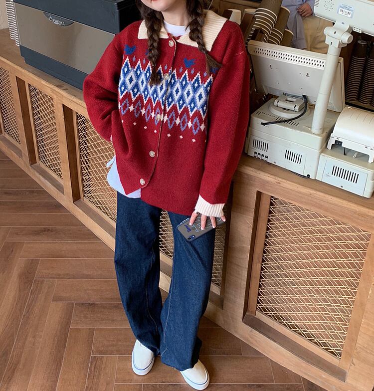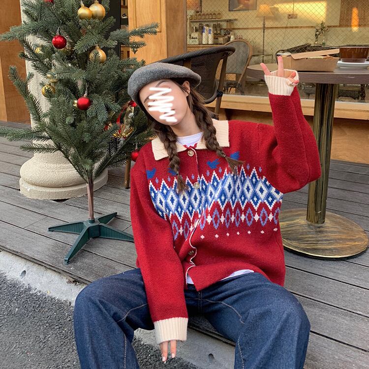 オータムウィンタースタイルスタンダードジャカードセーター ジャケット レディースニットカーディガントップス レトロ 秋物 冬物 YY-ファッション25673351119