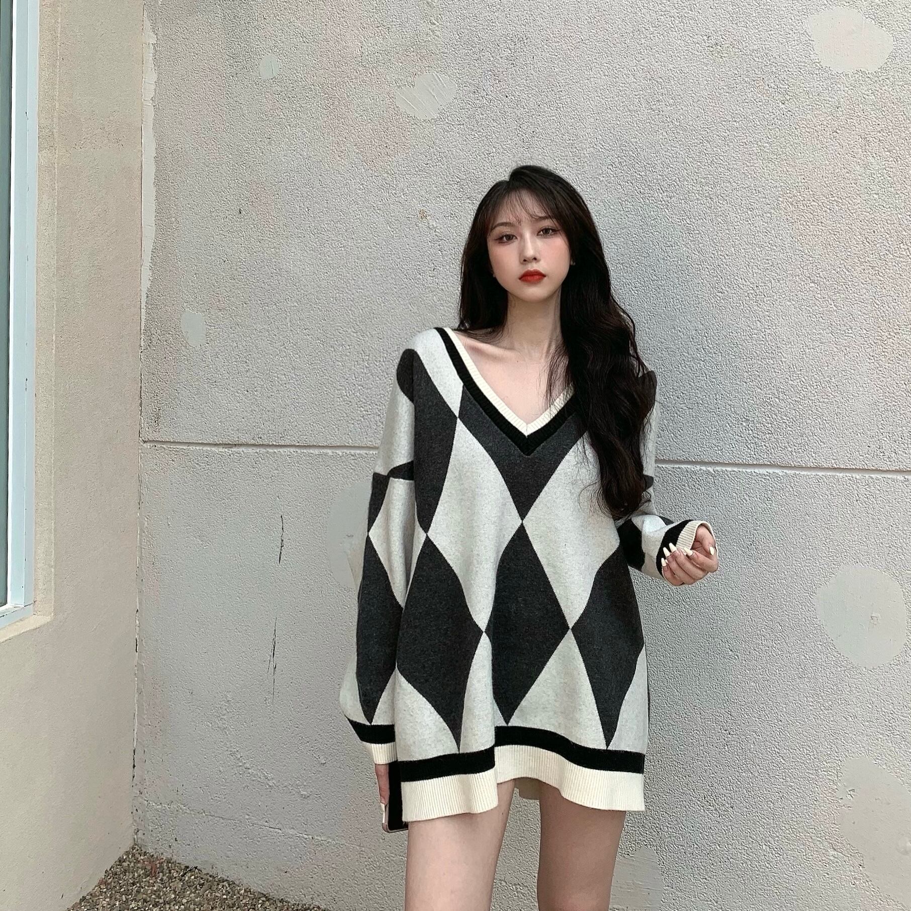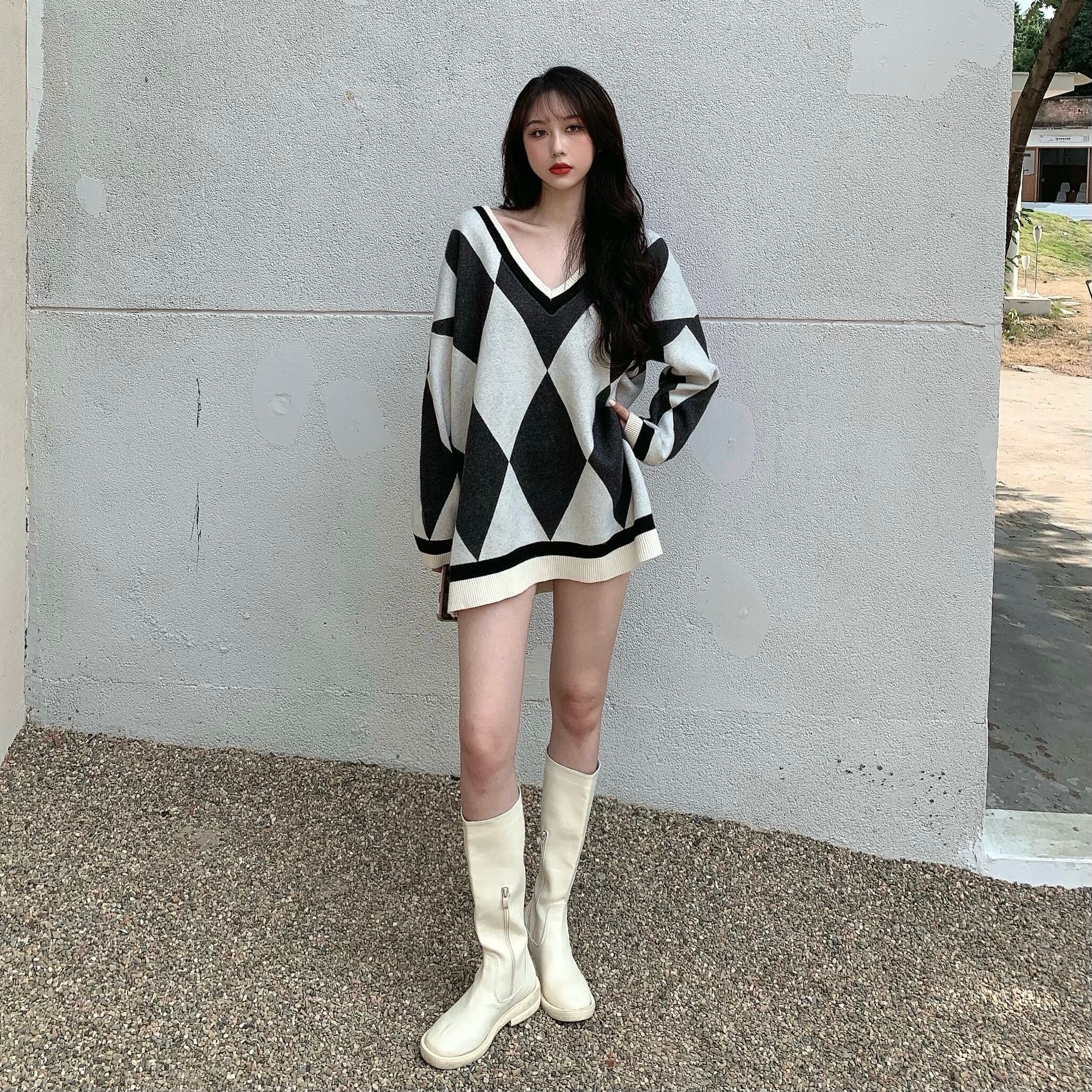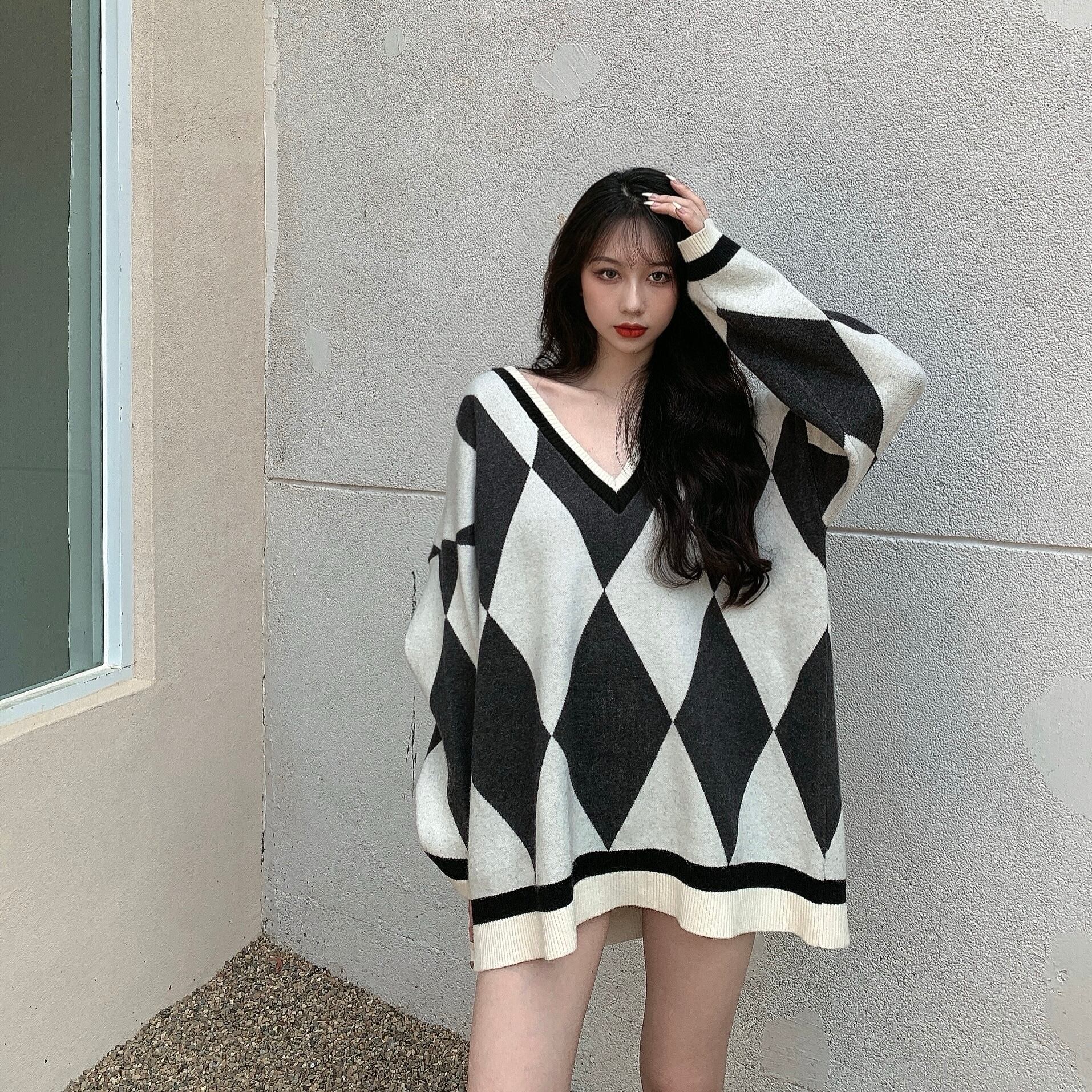 スタンダードスタイルセーター ロングオータムウィンタールーズVネックトップス レトロ 秋物 冬物 YY-ファッション81091978071
